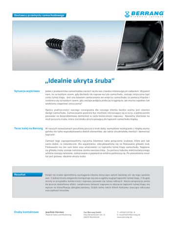 Dostawcy przemysłu samochodowego Sytuacja wyjściowa Jeden z producentów samochodów zwrócił się do nas z bardzo interesującym zadaniem. Wyjaśnił nam, że za każdym razem, gdy dochodzi do napraw na tyle samochodu, zostaje zniszczona tapicerka tylnej klapy. Jest ona bowiem zamocowana we wnętrzu samochodu za pomocą klipsów i rozdziera się za każdym razem, gdy zostaje podjęta próba jej ściągnięcia. Jak można zapobiec tak wielkiemu stopniowi zniszczenia? Oprócz praktyczności naszego rozwiązania dla naszego klienta bardzo ważny jest również design samochodu. Zamocowanie powinno być możliwie nierzucające się w oczy, a jednocześnie pozwalać na bezproblemowy demontaż w razie konieczności naprawy. Naszemu klientowi na myśl przyszła śruba, która zostałaby ukryta pasującą do tapicerki samochodu klapką. Teraz kolej na Berrang W naszych rozważaniach poszliśmy jeszcze o krok dalej: wymyślone rozwiązanie z klapką wymagałoby nie tylko wyprodukowania dwóch elementów, ale także utrudniałoby montaż i demontaż tapicerki. Zamiast tego zaproponowaliśmy naszemu klientowi takie połączenie śrubowe, które jest tak samo dobre, co niewidoczne. Dla wyjaśnienia: zdecydowaliśmy się na flokowanie główek śrub. Flokowanie ma ten sam kolor oraz właściwości co tapicerka tylnej klapy samochodu. Najpierw na główkę śruby zostaje nałożona cienka warstwa kleju. Za pomocą ładunku elektrostatycznego włókna zostają nałożone, zamocowane a pojedyncze włókna podnoszą się. Po utwardzeniu rezultat jest gotowy: idealnie ukryta śruba. Rezultat Dzięki tej śrubie spełniliśmy wymagania klienta dotyczące optyki bardziej niż się tego spodziewał. Z jednej strony elegancko komponuje się ona w ogólny wygląd tapicerki tylnej klapy. Z drugiej strony w przypadku konieczności naprawy pozwala się łatwo odkręcić. Nasza propozycja posiada jeszcze dodatkowy efekt: zwiększona łatwość naprawy w obszarze tapicerki tylnej klapy ma wpływ na klasyfikację ubezpieczeniową. Dzięki temu także klient końcowy znacząco odczuwa oszczędność kosztów. Osoby kontaktowe Joachim Hermes Head of Sales and Marketing Karl Berrang GmbH Elsa-Brändström-Str. 12 68229 Mannheim T: +49 (621 ) 87 86 - 0 E: [email protected] www.berrang.de