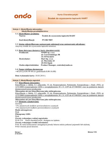 Karta Charakterystyki Środek do czyszczenia tapicerki HART Sekcja 1. Identyfikacja mieszaniny: Identyfikacja przedsiębiorstwa: 1.1. Identyfikator produktu: Nazwa: Środek do czyszczenia tapicerki HART Kod identyfikacji: PY100-700T 1.2. Istotne zidentyfikowane zastosowanie substancji oraz zastosowanie odradzane: Aktywny środek do czyszczenia tapicerki-atomizer. 1.3. Dane dotyczące dostawcy karty charakterystyki: Producent: ONDO sp. z o.o. ul. Czerwieńskiego 3B 31-319 Kraków Dystrybutor: Hart Sp. z o.o. ul. Morcinka 43 45-534 Opole Osoba odpowiedzialna: Product Manager, [email protected] 1.4. Numer telefonu alarmowego +48 (012) 636 99 44 (w godzinach:8.00-16.00) Data wykonania karty: 10.03.2014 r. . Sekcja 2. Identyfikacja zagrożeń 2.1. Klasyfikacja mieszaniny: Klasyfikacja z tabelą 3.1 załącznika VI do Rozporządzenia Parlamentu Europejskiego i Rady (WE) nr 1272/2008 (rozporządzenie GHS) z uwzględnieniem 30 i 31 ATP do 67/548/EEC oraz na podstawie danych dostarczonych przez producenta: Mieszanina nie jest klasyfikowana jako niebezpieczna. Klasyfikacja z tabelą 3.2 załącznika VI do Rozporządzenia Parlamentu Europejskiego i Rady (WE) nr 1272/2008 (rozporządzenie GHS) z uwzględnieniem 30 i 31 ATP do 67/548/EEC oraz na podstawie danych dostarczonych przez producenta: Mieszanina nie jest klasyfikowana jako niebezpieczna. 2.2. Elementy oznakowania: Zawiera: <5% anionowych środków powierzchniowo czynnych <5% niejonowych środków powierzchniowo czynnych Hasło ostrzegawcze: Brak Piktogramy GHS: Brak Zwroty wskazujące rodzaj zagrożenia: EUH 210 Karta charakterystyki dostępna na żądanie. Zwroty wskazujące środki ostrożności: P101 W razie konieczności zasięgnięcia porady lekarza należy pokazać pojemnik lub etykietę. P102 Chronić przed dziećmi. Wersja I 27.02.2014 Strona 1/10 Karta Charakterystyki Środek do czyszczenia tapicerki HART P305 + P351 + P338 W PRZYPADKU DOSTANIA SIĘ DO OCZU: Ostrożnie płukać wodą przez kilka minut. Wyjąć soczewki kontaktowe, jeżeli są i można je łatwo usunąć. Nadal płukać. P302 + P352 W PRZYPADKU KONTAKTU ZE SKÓRĄ: Umyć dużą ilością wody z mydłem. 2.3. Inne zagrożenia: Brak informacji dot. spełniania kryteriów PBT lub vPvB zgodnie z zał. XIII rozporządzenia 1907/2006 (REACH).Badania nie zostały przeprowadzone. Sekcja 3. Skład/informacja o składnikach 3.1. Substancje: Nie dotyczy. 3.2. Mieszaniny: Klasyfikację substancji zawartych w produkcie podano zgodnie z tabelą 3.1 oraz 3.2 załącznika VI do Rozporządzenia Parlamentu Europejskiego i Rady (WE) nr 1272/2008 (rozporządzenie GHS) z uwzględnieniem 30 i 31 ATP do 67/548/EEC oraz na podstawie danych dostarczonych przez producenta. Nazwa niebezpiecznej substancji Amidy, C8-18 i C18 nienasycone, N,Nbis(hydroksyetylowe) Nr Rej.REACH: 01-2119490100-53-xxxx Zakres stężeń <0,5% Eter polioksyetylenowy alkoholu laurylowego <0,5% Betaina Numer CAS brak Numer indeksowy brak Numer WE 931-329-6 Symbole niebezpieczeństwa Xi: R41; R38 GHS05; HS07; Niebezpieczeństwo Skin Irrit. 2, H315 Eye Dam. 1, H318 <0,5% 68002-97-1 61789-40-0 brak brak nie dotyczy (polimer) Xn: R22 Xi: R41 N: R50 263-058-8 GHS05; GHS07; GHS09 Niebezpieczeństwo AcuteTox4: H302 EyeDam1: H318 AquaticAcute1: H400 Xi: R41 GHS05; NIebezpieczeństwo EyeDam1: H318 Alkohole, C12-C14, etoksylowane, siarczanowane, sole sodowe <0,5% 68891-38-3 brak nie dotyczy (polimer) Xi: R38; R41 GHS05;GHS07; NIebezpieczeństwo SkinIrrit2: H315 EyeDam1: H318 Wersja I 27.02.2014 Strona 2/10 Karta Charakterystyki Środek do czyszczenia tapicerki HART Kwasy benzenosulfonowe, C10-C13 pochodne alkilowe, sole sodowe Nr Rej. REACH: 012119489428-22-XXXX <0,5% 68411-303 brak 270-115-0 Xn: R22 Xi: R38; R41 GHS05; GHS07; Niebezpieczeństwo AcuteTox4: H302 SkinIrrit2: H315 EyeDam1: H318 Brzmienie użytych zwrotów – patrz p. 16. Sekcja 4. Środki pierwszej pomocy 4.1. Opis środków pierwszej pomocy: 4.1.1 Wytyczne dotyczące pierwszej pomocy wg istotnych dróg narażenia: Kartę Charakterystyki okazać lekarzowi udzielającemu pomocy. W przypadku narażenia na pary i aerozole zwrócić się o produktu osobę poszkodowaną przenieść do dobrze wentylowanego pomieszczenia pomoc lekarską a) drogi oddechowe: osobę poszkodowaną natychmiast przenieść do dobrze wentylowanego pomieszczenia; osobę poszkodowaną umieścić w pozycji półleżącej, rozluźnić ubranie, upewnić się czy w ustach osoby poszkodowanej nie zalegają przedmioty lub wydzielina utrudniające oddychanie; jęli poszkodowany nie oddycha – wykonać sztuczne oddychanie; niezwłocznie zwrócić się o pomoc lekarską w przypadku wystąpienia trudności z oddychaniem. b) skóra: zdjąć zanieczyszczone ubranie; zabrudzoną skórę przemyć dużą ilością wody z mydłem; do mycia skóry nie używać żadnych rozpuszczalników ani rozcieńczalników; jeżeli wystąpi podrażnienie skóry – skonsultować z lekarzem. c) oczy: zanieczyszczone oczy płukać, przy otwartych powiekach, ciągłym strumieniem bieżącej wody przez 10 ÷ 15 minut; unikać silnego strumienia wody, który może stworzyć ryzyko uszkodzenia rogówki; w przypadku utrzymującego się pieczenia lub podrażnienia skonsultować się z lekarzem; nie używać żadnych płynów do przemywania oczu ani żadnych maści przed konsultacją lekarską; w przypadku, gdy osoba poszkodowana nosi szkła kontaktowe zdjąć je, jeżeli to możliwe; zwrócić się o pomoc lekarską w przypadku wystąpienia podrażnienia d) przewód pokarmowy: wypłukać usta dużą ilością bieżącej wody; osobie nieprzytomnej nie podawać nic do ust ; nie wywoływać wymiotów; niezwłocznie skonsultować z lekarzem – pokazać lekarzowi Kartę Charakterystyki lub etykietę 4.1.2. Inne: Brak. 4.2. Najważniejsze ostre i opóźnione objawy oraz skutki narażenia: Ostre: Brak Opóźnione: Brak 4.3. Wskazania dotyczące wszelkiej natychmiastowej pomocy lekarskiej i szczególnego postępowania z poszkodowanym: W przyp