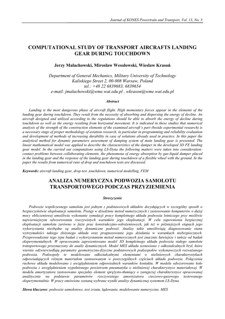 Journal of KONES Powertrain and Transport, Vol. 13, No. 3 COMPUTATIONAL STUDY OF TRANSPORT AIRCRAFTS LANDING GEAR DURING TOUCHDOWN Jerzy Maáachowski, Mirosáaw Wesoáowski, Wiesáaw KrasoĔ Department of General Mechanics, Military University of Technology Kaliskiego Street 2, 00-908 Warsaw, Poland tel.: +48 22 6839683, 6839654 e-mail: [email protected] , [email protected] Abstract Landing is the most dangerous phase of aircraft flight. High momentary forces appear in the elements of the landing gear during touchdown. They result from the necessity of absorbing and dispersing the energy of decline. An aircraft designed and utilized according to the regulations should be able to absorb the energy of decline during touchdown as well as the energy resulting from horizontal movement. It is indicated in these studies that numerical analysis of the strength of the construction elements of the examined aircraft’s part (beside experimental research) is a necessary stage of proper methodology of aviation research, in particular in programming and reliability evaluation and development of methods of increasing durability in case of solutions already used in practice. In this paper the analytical method for dynamic parameters assessment of damping system of main landing gear is presented. The linear mathematical model was applied to describe the characteristics of the damper in the developed 3D FE landing gear model. In the carried out computations using LS-Dyna the following matters were taken into consideration: contact problems between collaborating elements, the phenomena of energy absorption by gas-liquid damper placed in the landing gear and the response of the landing gear during touchdown of a flexible wheel with the ground. In the paper the results from numerical runs of drop and touchdown tests are discussed. Keywords: aircraft landing gear, drop test ,touchdown, numerical modelling, FEM ANALIZA NUMERYCZNA PODWOZIA SAMOLOTU TRANSPORTOWEGO PODCZAS PRZYZIEMIENIA Streszczenie Podwozie wspóáczesnego samolotu jest jednym z podstawowych ukáadów decydujących w szczególny sposób o bezpieczeĔstwie eksploatacji samolotu. PostĊp w dziedzinie metod numerycznych i zastosowanie komputerów o duĪej mocy obliczeniowej umoĪliwia wykonanie symulacji pracy kompletnego ukáadu podwozia lotniczego przy moĪliwie najwierniejszym odwzorowaniu rzeczywistych warunków jego eksploatacji. W celu zapewnienia bezpiecznej eksploatacji samolotu zarówno w fazie prac konstrukcyjno-wdroĪeniowych, jak teĪ w póĨniejszych etapach jego wykorzystania niezbĊdne są analizy dynamiczne podwozi. Analizy takie umoĪliwiają diagnozowanie stanu wytrzymaáoĞci takiego záoĪonego ukáadu oraz prognozowanie jego dziaáania w warunkach niebezpiecznych. Przeprowadzenie tego typu badaĔ z wykorzystaniem metod numerycznych jest znacznie áatwiejsze i taĔsze od badaĔ eksperymentalnych. W opracowaniu zaprezentowano model 3D kompletnego ukáadu podwozia staáego samolotu transportowego przeznaczony do analiz dynamicznych. Model MES ukáadu zestawiono z odksztaácalnych bryá, które wiernie odzwierciedlają parametry geometryczno-fizyczne podstawowych podzespoáów wykonawczych rozwaĪanego podwozia. Podzespoáy te modelowano odksztaácalnymi elementami o nieliniowych charakterystykach odpowiadających róĪnym materiaáom zastosowanym w poszczególnych czĊĞciach ukáadu podwozia. Poáączenia ruchowe ukáadu modelowano z uwzglĊdnieniem odpowiednich warunków kontaktu. W modelu odwzorowano koáo podwozia z uwzglĊdnieniem wypeánionego powietrzem pneumatyka o nieliniowej charakterystyce materiaáowej. W modelu amortyzatora zastosowano specjalny element sprĊĪysto-táumiący o zastĊpczej charakterystyce opracowanej analitycznie na podstawie parametrów rzeczywistego amortyzatora cieczowo-gazowego testowanego eksperymentalnie. W pracy omówione zostaną wybrane wyniki analizy dynamicznej systemem LS-Dyna. Sáowa kluczowe: podwozie samolotowe, test zrzutu, lądowanie, modelowanie numeryczne, MES J. Maáachowski, M. Wesoáowski, W. KrasoĔ 1. WstĊp Podwozie samolotu jest jednym z krytycznych ukáadów samolotu ze wzglĊdu na bezpieczeĔstwo jego eksploatacji, a takĪe ze wzglĊdu na bezpieczeĔstwo transportowanych na pokáadzie samolotu ludzi i towarów. W elementach podwozia podczas przyziemienia powstają duĪe chwilowe siáy, wynikające z koniecznoĞci pocháoniĊcia i rozproszenia energii spadku. Samolot projektowany i eksploatowany zgodnie z obowiązującymi normami lotniczymi [2, 8] powinien w sposób bezpieczny pocháonąü tĊ porcjĊ energii spadku samolotu w trakcie lądowania, jak równieĪ energii generowanej w związku z ruchem poziomym samolotu po páycie lądowiska. NajwiĊksze obciąĪenia podwozia powstają wskutek pocháaniania energii spadku pionowego lub wskutek generowania drgaĔ samowzbudnych [5, 7, 9]. WáaĞciwy dobór charakterystyk podwozia jest zagadnieniem bardzo záoĪonym [4,6,10,11]. Jednak pozwalają one minimalizowaü obciąĪenia wystĊpujące w elementach podwozia podczas przyziemienia. W tym celu przeprowadza siĊ analizy dynamiczne podwozi, aby przewidzieü ich zachowanie siĊ w warunkach dla nich niebezpiecznych. Przeprowadzenie tego typu badaĔ z wykorzystaniem metod numerycznych jest znacznie áatwiejsze i taĔsze od prób stanowiskowych. W pracy omówiono model numeryczny zastosowany w analizie dynamicznej podwozia samolotu transportowego. Model ten prezentuje duĪy poziom szczegóáowoĞci odzwierciedlenia szczegóáów konstrukcyjnych podwozia. Wspomniany model 3D zastosowano w numerycznej symulacji testu zrzutu oraz do zasymulowania procesu lądowania. W badaniach tych analizowano gáównie problematykĊ związaną z szacowaniem wytĊĪenia w poszczególnych elementach podwozia, jak teĪ problem absorpcji energii przez ukáad. Wyniki symulacji komputerowych i testów laboratoryjnych, zrealizowanych na stanowisku zrzutowym, posáuĪyáy do zweryfikowania poprawnoĞci zbudo