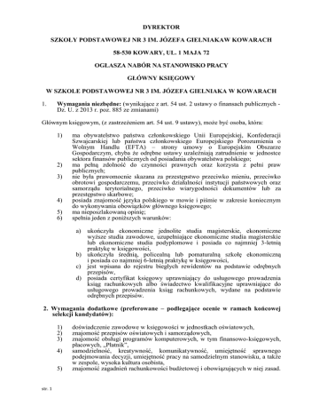 DYREKTOR SZKOŁY PODSTAWOWEJ NR 3 IM. JÓZEFA GIELNIAKAW KOWARACH 58-530 KOWARY, UL. 1 MAJA 72 OGŁASZA NABÓR NA STANOWISKO PRACY GŁÓWNY KSIĘGOWY W SZKOLE PODSTAWOWEJ NR 3 IM. JÓZEFA GIELNIAKA W KOWARACH 1. Wymagania niezbędne: (wynikające z art. 54 ust. 2 ustawy o finansach publicznych Dz. U. z 2013 r. poz. 885 ze zmianami) Głównym księgowym, (z zastrzeżeniem art. 54 ust. 9 ustawy), może być osoba, która: 1) 2) 3) 4) 5) 6) ma obywatelstwo państwa członkowskiego Unii Europejskiej, Konfederacji Szwajcarskiej lub państwa członkowskiego Europejskiego Porozumienia o Wolnym Handlu (EFTA) – strony umowy o Europejskim Obszarze Gospodarczym, chyba że odrębne ustawy uzależniają zatrudnienie w jednostce sektora finansów publicznych od posiadania obywatelstwa polskiego; ma pełną zdolność do czynności prawnych oraz korzysta z pełni praw publicznych; nie była prawomocnie skazana za przestępstwo przeciwko mieniu, przeciwko obrotowi gospodarczemu, przeciwko działalności instytucji państwowych oraz samorządu terytorialnego, przeciwko wiarygodności dokumentów lub za przestępstwo skarbowe; posiada znajomość języka polskiego w mowie i piśmie w zakresie koniecznym do wykonywania obowiązków głównego księgowego; ma nieposzlakowaną opinię; spełnia jeden z poniższych warunków: a) ukończyła ekonomiczne jednolite studia magisterskie, ekonomiczne wyższe studia zawodowe, uzupełniające ekonomiczne studia magisterskie lub ekonomiczne studia podyplomowe i posiada co najmniej 3-letnią praktykę w księgowości, b) ukończyła średnią, policealną lub pomaturalną szkołę ekonomiczną i posiada co najmniej 6-letnią praktykę w księgowości, c) jest wpisana do rejestru biegłych rewidentów na podstawie odrębnych przepisów, d) posiada certyfikat księgowy uprawniający do usługowego prowadzenia ksiąg rachunkowych albo świadectwo kwalifikacyjne uprawniające do usługowego prowadzenia ksiąg rachunkowych, wydane na podstawie odrębnych przepisów. 2. Wymagania dodatkowe (preferowane – podlegające ocenie w ramach końcowej selekcji kandydatów): 1) 2) 3) 4) 5) str. 1 doświadczenie zawodowe w księgowości w jednostkach oświatowych, znajomość przepisów oświatowych i samorządowych, znajomość obsługi programów komputerowych, w tym finansowo-księgowych, płacowych, „Płatnik”, samodzielność, kreatywność, komunikatywność, umiejętność sprawnego podejmowania decyzji, umiejętność pracy na samodzielnym stanowisku, a także w zespole, wysoka kultura osobista, znajomość zagadnień rachunkowości budżetowej i obowiązujących w niej zasad. 3. Zakres wykonywanych zadań na stanowisku: 1) 2) 3) 4) 5) 6) 7) 8) 9) 10) 11) 12) 13) 14) 15) 16) 17) 18) 19) 4. prowadzi całość spraw związanych z rachunkowością jednostki budżetowej, wykonuje dyspozycje środkami pieniężnymi, kontroluje zgodność operacji gospodarczych i finansowych z planem finansowym, kontroluje kompletność i rzetelność dokumentów dotyczących operacji gospodarczych i finansowych, opracowuje projekty przepisów wewnętrznych dotyczących prowadzenia rachunkowości, zakładowego planu kont, polityki rachunkowości, obiegu i kontroli dokumentów finansowych, opracowuje plany dochodów i wydatków budżetowych jednostki, kompletuje dokumenty finansowo – księgowe, dokonuje przelewów, dekretuje i sprawdza pod względem formalno-rachunkowym i finansowym dokumenty księgowe, prowadzi ewidencję finansowo – księgową, sporządza sprawozdania budżetowe i finansowe, dokonuje ewidencji środków trwałych i pozostałych środków trwałych, nadzoruje gospodarkę kasową szkoły, sporządza, sprawdza i zatwierdza listy płac, nalicza podatek od wynagrodzeń, zgodnie z obowiązującymi w tym zakresie przepisami, prowadzi wszelkie rozliczenia szkoły z budżetem państwa, ZUS i innymi instytucjami, z którymi szkoła współpracuje w zakresie finansowym, czuwa nad wywiązywaniem się najemców z warunków umów najmu w zakresie zobowiązań finansowych, czuwa nad zabezpieczeniem środków finansowych na fundusz socjalny, nadzoruje prawidłowość wypłat z tego funduszu, określonych i zatwierdzonych przez Dyrektora Szkoły, należycie przechowuje i zabezpiecza dokumenty księgowe, księgi rachunkowe oraz sprawozdania finansowe, wykonuje inne czynności wynikających z zajmowanego stanowiska. Wymagane dokumenty. 1) Na dokumenty aplikacyjne składają się: list motywacyjny, życiorys zawodowy - curriculum vitae, dokumenty potwierdzające wymagane kwalifikacje i umiejętności, świadectwa pracy, kwestionariusz osobowy, oświadczenie kandydata o posiadaniu pełnej zdolności do czynności prawnych i korzystaniu z pełni praw publicznych, oświadczenie kandydata o braku prawomocnego skazania za przestępstwo przeciwko mieniu, przeciwko obrotowi gospodarczemu, przeciwko działalności instytucji państwowych oraz samorządu terytorialnego, przeciwko wiarygodności dokumentów lub za przestępstwo skarbowe oraz za umyślne przestępstwo ścigane z oskarżenia publicznego, oświadczenie kandydata o niekaralności za przestępstwa popełnione umyślnie, informacja o ostatnio dokonanej ocenie pracy lub opinia o pracy osoby ubiegającej się o stanowisko, oświadczenie kandydata o braku przeciwwskazań zdrowotnych do zatrudnienia, podpisane oświadczenie o treści - "wyrażam zgodę na przetwarzanie danych osobowych zawartych w mojej ofercie pracy, dla potrzeb niezbędnych do procesu rekrutacyjnego - zgodnie z ustawą z dnia 29.08.1997r. o ochronie danych osobowych (Dz. U. z 2002 r. Nr 101 poz. 926 z późn. zm.) oraz ustawą z dnia 21 listopada 2008 r. o pracownikach samorządowych (Dz. U. z 2008 r. Nr 223, poz. 1458). str. 2 2) W razie posiadania – dokumenty potwierdzające osiągnięcia zawodowe np.: uzyskane nagrody, wyróżnienia itp. 5. Termin, sposób i miejsce składania dokumentów aplikacyjnych: 1) 2) Termin: do 05 lipca 2016 r. do godz. 10.00 Sposób: Wymagane 