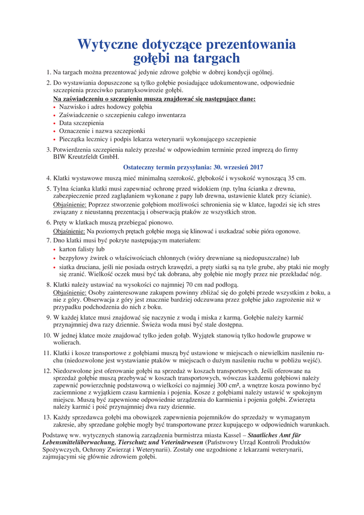 Wytyczne dotyczące prezentowania gołębi na targach 1. Na targach można prezentować jedynie zdrowe gołębie w dobrej kondycji ogólnej. 2. Do wystawiania dopuszczone są tylko gołębie posiadające udokumentowane, odpowiednie szczepienia przeciwko paramyksowirozie gołębi. Na zaświadczeniu o szczepieniu muszą znajdować się następujące dane: • Nazwisko i adres hodowcy gołębia • Zaświadczenie o szczepieniu całego inwentarza • Data szczepienia • Oznaczenie i nazwa szczepionki • Pieczątka lecznicy i podpis lekarza weterynarii wykonującego szczepienie 3. Potwierdzenia szczepienia należy przesłać w odpowiednim terminie przed imprezą do firmy BIW Kreutzfeldt GmbH. Ostateczny termin przysyłania: 30. wrzesień 2017 4. Klatki wystawowe muszą mieć minimalną szerokość, głębokość i wysokość wynoszącą 35 cm. 5. Tylna ścianka klatki musi zapewniać ochronę przed widokiem (np. tylna ścianka z drewna, zabezpieczenie przed zaglądaniem wykonane z papy lub drewna, ustawienie klatek przy ścianie). Objaśnienie: Poprzez stworzenie gołębiom możliwości schronienia się w klatce, łagodzi się ich stres związany z nieustanną prezentacją i obserwacją ptaków ze wszystkich stron. 6. Pręty w klatkach muszą przebiegać pionowo. Objaśnienie: Na poziomych prętach gołębie mogą się klinować i uszkadzać sobie pióra ogonowe. 7. Dno klatki musi być pokryte następującym materiałem: • karton falisty lub • bezpyłowy żwirek o właściwościach chłonnych (wióry drewniane są niedopuszczalne) lub • siatka druciana, jeśli nie posiada ostrych krawędzi, a pręty siatki są na tyle grube, aby ptaki nie mogły się zranić. Wielkość oczek musi być tak dobrana, aby gołębie nie mogły przez nie przekładać nóg. 8. Klatki należy ustawiać na wysokości co najmniej 70 cm nad podłogą. Objaśnienie: Osoby zainteresowane zakupem powinny zbliżać się do gołębi przede wszystkim z boku, a nie z góry. Obserwacja z góry jest znacznie bardziej odczuwana przez gołębie jako zagrożenie niż w przypadku podchodzenia do nich z boku. 9. W każdej klatce musi znajdować się naczynie z wodą i miska z karmą. Gołębie należy karmić przynajmniej dwa razy dziennie. Świeża woda musi być stale dostępna. 10. W jednej klatce może znajdować tylko jeden gołąb. Wyjątek stanowią tylko hodowle grupowe w wolierach. 11. Klatki i kosze transportowe z gołębiami muszą być ustawione w miejscach o niewielkim nasileniu ruchu (niedozwolone jest wystawianie ptaków w miejscach o dużym nasileniu ruchu w pobliżu wejść). 12. Niedozwolone jest oferowanie gołębi na sprzedaż w koszach transportowych. Jeśli oferowane na sprzedaż gołębie muszą przebywać w koszach transportowych, wówczas każdemu gołębiowi należy zapewnić powierzchnię podstawową o wielkości co najmniej 300 cm², a wnętrze kosza powinno być zaciemnione z wyjątkiem czasu karmienia i pojenia. Kosze z gołębiami należy ustawić w spokojnym miejscu. Muszą być zapewnione odpowiednie urządzenia do karmienia i pojenia gołębi. Zwierzęta należy karmić i poić przynajmniej dwa razy dziennie. 13. Każdy sprzedawca gołębi ma obowiązek zapewnienia pojemników do sprzedaży w wymaganym zakresie, aby sprzedane gołębie mogły być transportowane przez kupującego w odpowiednich warunkach. Podstawę ww. wytycznych stanowią zarządzenia burmistrza miasta Kassel – Staatliches Amt für Lebensmittelüberwachung, Tierschutz und Veterinärwesen (Państwowy Urząd Kontroli Produktów Spożywczych, Ochrony Zwierząt i Weterynarii). Zostały one uzgodnione z lekarzami weterynarii, zajmującymi się głównie zdrowiem gołębi.