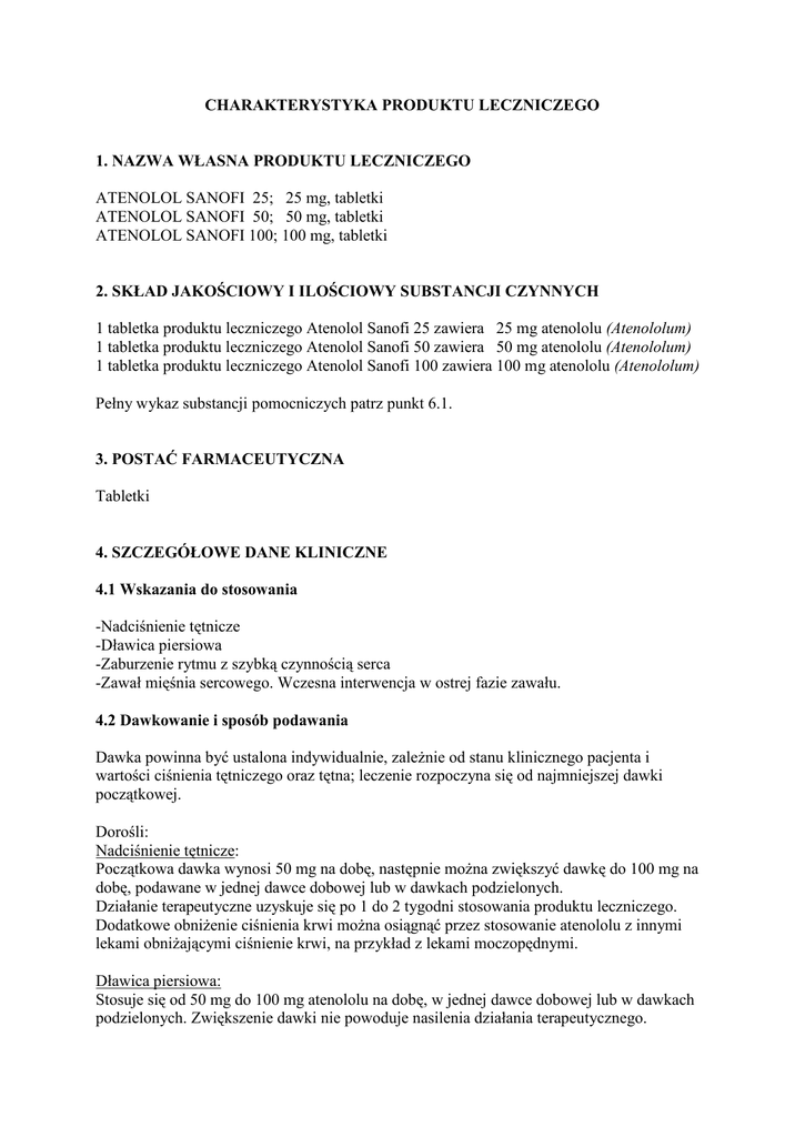 CHARAKTERYSTYKA PRODUKTU LECZNICZEGO 1. NAZWA WŁASNA PRODUKTU LECZNICZEGO ATENOLOL SANOFI 25; 25 mg, tabletki ATENOLOL SANOFI 50; 50 mg, tabletki ATENOLOL SANOFI 100; 100 mg, tabletki 2. SKŁAD JAKOŚCIOWY I ILOŚCIOWY SUBSTANCJI CZYNNYCH 1 tabletka produktu leczniczego Atenolol Sanofi 25 zawiera 25 mg atenololu (Atenololum) 1 tabletka produktu leczniczego Atenolol Sanofi 50 zawiera 50 mg atenololu (Atenololum) 1 tabletka produktu leczniczego Atenolol Sanofi 100 zawiera 100 mg atenololu (Atenololum) Pełny wykaz substancji pomocniczych patrz punkt 6.1. 3. POSTAĆ FARMACEUTYCZNA Tabletki 4. SZCZEGÓŁOWE DANE KLINICZNE 4.1 Wskazania do stosowania -Nadciśnienie tętnicze -Dławica piersiowa -Zaburzenie rytmu z szybką czynnością serca -Zawał mięśnia sercowego. Wczesna interwencja w ostrej fazie zawału. 4.2 Dawkowanie i sposób podawania Dawka powinna być ustalona indywidualnie, zależnie od stanu klinicznego pacjenta i wartości ciśnienia tętniczego oraz tętna; leczenie rozpoczyna się od najmniejszej dawki początkowej. Dorośli: Nadciśnienie tętnicze: Początkowa dawka wynosi 50 mg na dobę, następnie można zwiększyć dawkę do 100 mg na dobę, podawane w jednej dawce dobowej lub w dawkach podzielonych. Działanie terapeutyczne uzyskuje się po 1 do 2 tygodni stosowania produktu leczniczego. Dodatkowe obniżenie ciśnienia krwi można osiągnąć przez stosowanie atenololu z innymi lekami obniżającymi ciśnienie krwi, na przykład z lekami moczopędnymi. Dławica piersiowa: Stosuje się od 50 mg do 100 mg atenololu na dobę, w jednej dawce dobowej lub w dawkach podzielonych. Zwiększenie dawki nie powoduje nasilenia działania terapeutycznego. U pacjentów z dławicą piersiową nie należy nagle przerywać podawania atenololu, gdyż może to spowodować nasilenie bólów dławicowych, a nawet wystąpienie świeżego zawału serca. Zaburzenia rytmu serca z szybką czynnością serca: Początkowa dawka atenololu wynosi 2,5 mg podawanego we wstrzyknięciu dożylnym w ciągu 2,5 minuty (tzn.1mg/1min). Dawka 2,5 mg może być powtórzona w 5 minutowych odstępach aż do uzyskania spodziewanego działania terapeutycznego do dawki maksymalnej 10 mg. W infuzji dożylnej atenolol stosowany jest w dawce 0,15 mg/kg masy ciała przez 20 minut. Jeśli konieczne, iniekcje lub infuzje dożylne można powtarzać co 12 godzin. Po uzyskaniu kontroli zaburzeń rytmu serca po podaniu dożylnym atenololu konieczna jest kontynuacja leczenia lekiem doustnym w dawce od 50 mg do 100 mg raz na dobę. Zawał mięśnia sercowego: Pacjentom wymagającym dożylnego leczenia beta-adrenolitykami, podaje się atenolol w dawce 5 mg do 10 mg w powolnym wstrzyknięciu dożylnym (1 mg/1 min) w ciągu 12 godzinach od wystąpienia bólu w klatce piersiowej. Po dożylnym podaniu i w przypadku braku objawów niepożądanych leczenie jest kontynuowane przez podanie doustne atenololu w dawce 50 mg po 15 minutach od podania dożylnego, a następnie po 12 godzinach od podania atenololu dożylnie w dawce 50 mg i dawce 100 mg na dobę po następnych 12 godzinach. Jeżeli wystąpią objawy niepożądane - zwolnienie rytmu serca i (lub) niedociśnienie tętnicze lub inne, leczenie atenololem powinno być przerwane. Dawkowanie w niewydolności nerek: U pacjentów z niewydolnością nerek dawkę atenololu należy zmniejszyć. Nie zaobserwowano kumulacji atenololu u pacjentów, z klirensem kreatyniny większym niż 35 ml/min/1,73 m2 (wartość prawidłowa wynosi 100 -150 ml/min/1,73 m2). U pacjentów z klirensem kreatyniny 15-35 ml/min/1,73 m2 (odpowiednio do stężenia kreatyniny 300-600 mikromoli/litr) dawka doustna powinna wynosić 50 mg na dobę a dawka dożylna 10 mg co 2 dni. U pacjentów z klirensem kreatyniny mniejszym niż 15 ml/min/1,73 m2 (odpowiednio do stężenia kreatyniny powyżej 600 mikromoli/litr) dawka doustna powinna wynosić 25 mg na dobę lub 50 mg co drugi dzień. Pacjenci dializowani powinni otrzymać dawkę 50 mg doustnie po każdej dializie; leczenie powinno być przeprowadzane w warunkach szpitalnych ze względu na możliwość wystąpienia znacznego obniżenia ciśnienia krwi. Pacjenci w podeszłym wieku: Może być konieczne zmniejszenie dawki, szczególnie w przypadku współistnienia niewydolności nerek. Dzieci: Ze względu na brak doświadczenia w stosowaniu atenololu u dzieci nie zaleca się stosowania produktu leczniczego w tej grupie wiekowej. 4.3 Przeciwwskazania: Nadwrażliwość na atenolol lub którąkolwiek substancję pomocniczą Wstrząs kardiogenny Niewyrównana niewydolność serca 2 Zespół chorego węzła zatokowego Blok przedsionkowo - komorowy II lub III stopnia Nieleczony guz chromochłonny nadnerczy Kwasica metaboliczna Bradykardia poniżej 45 uderzeń na minutę Niedociśnienie tętnicze Ciężkie zaburzenia krążenia tętniczego obwodowego. Dożylne stosowanie antagonistów kanału wapniowego typu werapamil, diltiazem lub innych leków przeciwarytmicznych. 4.4 Specjalne ostrzeżenia i środki ostrożności dotyczące stosowania: -Atenololu, tak jak innych beta-adrenolityków nie należy odstawiać nagle [może to wywołać zwiększenie ciśnienia tętniczego, nasilenie objawów dławicy piersiowej i (lub) zaburzenia rytmu serca]. Dawka produktu leczniczego powinna być stopniowo zmniejszana w ciągu 7 do 14 dni. Pacjenci, szczególnie z chorobą niedokrwienną serca powinni być w tym czasie obserwowani. -W przypadku pacjentów zakwalifikowanych do zabiegu chirurgicznego, decyzję o zaprzestaniu leczenia beta-adrenolitykiem należy podjąć co najmniej 24 godziny przed zabiegiem chirurgicznym. Ocena ryzyka i korzyści powinna być podejmowana indywidualnie dla każdego pacjenta. W przypadku kontynuowania leczenia atenololem należy zastosować leki anestezjologiczne o niewielkim ujemnym działaniu inotropowym, aby zmniejszyć ryzyko wystąpienia działania kardiodepresyjnego. Podanie dożylne atropiny zmniejsza ryzyko reakcji ze strony nerwu błędnego. -Chociaż p