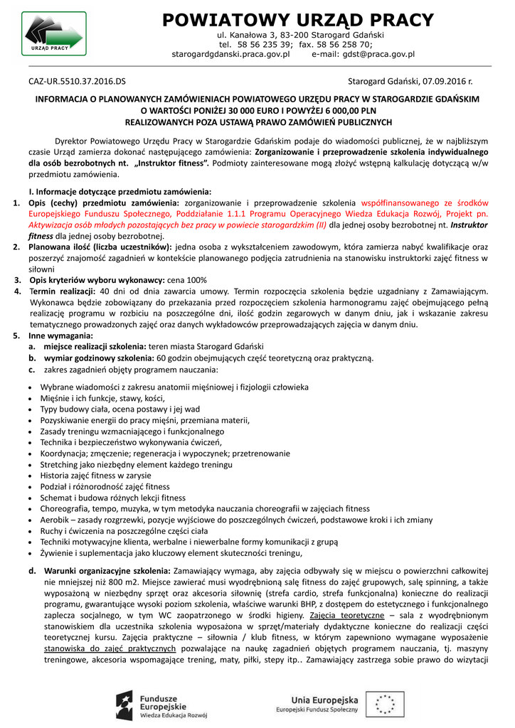 POWIATOWY URZĄD PRACY ul. Kanałowa 3, 83-200 Starogard Gdański tel. 58 56 235 39; fax. 58 56 258 70; starogardgdanski.praca.gov.pl e-mail: [email protected] CAZ-UR.5510.37.2016.DS Starogard Gdański, 07.09.2016 r. INFORMACJA O PLANOWANYCH ZAMÓWIENIACH POWIATOWEGO URZĘDU PRACY W STAROGARDZIE GDAŃSKIM O WARTOŚCI PONIŻEJ 30 000 EURO I POWYŻEJ 6 000,00 PLN REALIZOWANYCH POZA USTAWĄ PRAWO ZAMÓWIEŃ PUBLICZNYCH Dyrektor Powiatowego Urzędu Pracy w Starogardzie Gdańskim podaje do wiadomości publicznej, że w najbliższym czasie Urząd zamierza dokonać następującego zamówienia: Zorganizowanie i przeprowadzenie szkolenia indywidualnego dla osób bezrobotnych nt. „Instruktor fitness”. Podmioty zainteresowane mogą złożyć wstępną kalkulację dotyczącą w/w przedmiotu zamówienia. I. Informacje dotyczące przedmiotu zamówienia: 1. Opis (cechy) przedmiotu zamówienia: zorganizowanie i przeprowadzenie szkolenia współfinansowanego ze środków Europejskiego Funduszu Społecznego, Poddziałanie 1.1.1 Programu Operacyjnego Wiedza Edukacja Rozwój, Projekt pn. Aktywizacja osób młodych pozostających bez pracy w powiecie starogardzkim (II) dla jednej osoby bezrobotnej nt. Instruktor fitness dla jednej osoby bezrobotnej. 2. Planowana ilość (liczba uczestników): jedna osoba z wykształceniem zawodowym, która zamierza nabyć kwalifikacje oraz poszerzyć znajomość zagadnień w kontekście planowanego podjęcia zatrudnienia na stanowisku instruktorki zajęć fitness w siłowni 3. Opis kryteriów wyboru wykonawcy: cena 100% 4. Termin realizacji: 40 dni od dnia zawarcia umowy. Termin rozpoczęcia szkolenia będzie uzgadniany z Zamawiającym. Wykonawca będzie zobowiązany do przekazania przed rozpoczęciem szkolenia harmonogramu zajęć obejmującego pełną realizację programu w rozbiciu na poszczególne dni, ilość godzin zegarowych w danym dniu, jak i wskazanie zakresu tematycznego prowadzonych zajęć oraz danych wykładowców przeprowadzających zajęcia w danym dniu. 5. Inne wymagania: a. miejsce realizacji szkolenia: teren miasta Starogard Gdański b. wymiar godzinowy szkolenia: 60 godzin obejmujących część teoretyczną oraz praktyczną. c. zakres zagadnień objęty programem nauczania: Wybrane wiadomości z zakresu anatomii mięśniowej i fizjologii człowieka Mięśnie i ich funkcje, stawy, kości, Typy budowy ciała, ocena postawy i jej wad Pozyskiwanie energii do pracy mięśni, przemiana materii, Zasady treningu wzmacniającego i funkcjonalnego Technika i bezpieczeństwo wykonywania ćwiczeń, Koordynacja; zmęczenie; regeneracja i wypoczynek; przetrenowanie Stretching jako niezbędny element każdego treningu Historia zajęć fitness w zarysie Podział i różnorodność zajęć fitness Schemat i budowa różnych lekcji fitness Choreografia, tempo, muzyka, w tym metodyka nauczania choreografii w zajęciach fitness Aerobik – zasady rozgrzewki, pozycje wyjściowe do poszczególnych ćwiczeń, podstawowe kroki i ich zmiany Ruchy i ćwiczenia na poszczególne części ciała Techniki motywacyjne klienta, werbalne i niewerbalne formy komunikacji z grupą Żywienie i suplementacja jako kluczowy element skuteczności treningu, d. Warunki organizacyjne szkolenia: Zamawiający wymaga, aby zajęcia odbywały się w miejscu o powierzchni całkowitej nie mniejszej niż 800 m2. Miejsce zawierać musi wyodrębnioną salę fitness do zajęć grupowych, salę spinning, a także wyposażoną w niezbędny sprzęt oraz akcesoria siłownię (strefa cardio, strefa funkcjonalna) konieczne do realizacji programu, gwarantujące wysoki poziom szkolenia, właściwe warunki BHP, z dostępem do estetycznego i funkcjonalnego zaplecza socjalnego, w tym WC zaopatrzonego w środki higieny. Zajęcia teoretyczne – sala z wyodrębnionym stanowiskiem dla uczestnika szkolenia wyposażona w sprzęt/materiały dydaktyczne konieczne do realizacji części teoretycznej kursu. Zajęcia praktyczne – siłownia / klub fitness, w którym zapewniono wymagane wyposażenie stanowiska do zajęć praktycznych pozwalające na naukę zagadnień objętych programem nauczania, tj. maszyny treningowe, akcesoria wspomagające trening, maty, piłki, stepy itp. . Zamawiający zastrzega sobie prawo do wizytacji POWIATOWY URZĄD PRACY ul. Kanałowa 3, 83-200 Starogard Gdański tel. 58 56 235 39; fax. 58 56 258 70; starogardgdanski.praca.gov.pl e-mail: [email protected] (zarówno przed jak i w trakcie trwania szkolenia) miejsc wskazanych przez Wykonawcę, w których realizowane będzie szkolenie. Każdego dnia trwania szkolenia musi być prowadzony dziennik zajęć teoretycznych/praktycznych zgodny z Rozporządzeniem Ministra Edukacji Narodowej z dnia 11 stycznia 2012 r. w sprawie kształcenia ustawicznego w formach pozaszkolnych (Dz. U. z 2012 r., poz. 186), w którym zawierane będą następujące informacje: data, ilość godzin zajęć odbytych w danym dniu szkolenia, tematyka zajęć, podpis wykładowcy/instruktora oraz lista obecności zawierająca: imię, nazwisko i podpis uczestnika szkolenia. Zagadnienia muszą być szczegółowo rozpisane w programie szkolenia, określając temat zajęć edukacyjnych. e. Rodzaj dokumentów wymaganych przez Zamawiającego, które musi otrzymać absolwent szkolenia: zaświadczenie o ukończeniu szkolenia wg wzoru zgodnego z Rozporządzeniem Ministra Edukacji Narodowej z dnia 11 stycznia 2012 r. w sprawie kształcenia ustawicznego w formach pozaszkolnych (Dz. U. z 2012 r., poz. 186) certyfikat lub zaświadczenie o ukończeniu szkolenia opatrzony w: logo/dane Wykonawcy oraz logo Powiatowego Urzędu Pracy w Starogardzie Gdańskim zgodnie z § 71 ust. 4 Rozporządzenia Ministra Pracy i Polityki Społecznej z dnia 14 maja 2014 r. w sprawie szczegółowych warunków realizacji oraz trybu i sposobów prowadzenia usług rynku pracy (Dz. U. z 2014 r., poz. 667) zawierające: numer z rejestru, imię i nazwisko oraz numer PESEL uczestnika szkolenia, a w przypadku cudzoziemca numer 