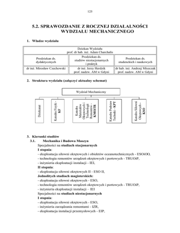 125 5.2. SPRAWOZDANIE Z ROCZNEJ DZIAŁALNOŚCI WYDZIAŁU MECHANICZNEGO 1. Władze wydziału Prodziekan ds. dydaktycznych dr inż. Mirosław Czechowski Dziekan Wydziału prof. dr hab. inż. Adam Charchalis Prodziekan ds. studiów niestacjonarnych i praktyk dr inż. Jerzy Herdzik prof. nadzw. AM w Gdyni Prodziekan ds. studenckich i naukowych dr hab. inż. Andrzej Miszczak prof. nadzw. AM w Gdyni 2. Struktura wydziału (załączyć aktualny schemat) Katedra Siłowni Okrętowych KSO Katedra Podstaw Techniki - KPT Katedra Materiałów Okrętowych i Technologii Remontów KMOiTR Katedra Fizyki KF Dziekanat Wydział Mechaniczny 3. Kierunki studiów 3.1. Mechanika i Budowa Maszyn Specjalności na studiach stacjonarnych I stopnia: - eksploatacja siłowni okrętowych i obiektów oceanotechnicznych - ESOiOO, - technologia remontów urządzeń okrętowych i portowych - TRUOiP, - inżynieria eksploatacji instalacji - IEI, II stopnia: - eksploatacja siłowni okrętowych II - ESO II, Jednolitych studiach magisterskich: - eksploatacja siłowni okrętowych - ESO, - technologia remontów urządzeń okrętowych i portowych - TRUOiP, - inżynieria eksploatacji instalacji – IEI Specjalności na studiach niestacjonarnych I stopnia: - eksploatacja siłowni okrętowych - ESO, - inżynieria zarządzania remontami - IZR, - eksploatacja instalacji przemysłowych - EIP, 126 II stopnia: - eksploatacja siłowni okrętowych - ESO, - eksploatacja siłowni okrętowych II - ESO II, - inżynieria zarządzania remontami - IZR, - eksploatacja instalacji przemysłowych - EIP. 3.2. Inżynieria Bezpieczeństwa Specjalności na studiach stacjonarnych I stopnia: - inżynieria bezpieczeństwa środowiska morskiego - IBŚM. 4. Sprawy kadrowe 4.1. Minimum kadrowe dla kierunków studiów Kierunek Mechanika i Budowa Maszyn: - prof. dr inż. Jan Kazimierz Włodarski - prof. dr hab. inż. Adam Charchalis - prof. dr hab. inż. Romuald Cwilewicz - dr hab. inż. Józef Bartosiewicz - dr hab. inż. Stanisław Polanowski - dr hab. inż. Marek Szwabowicz - dr inż. Zygmunt Górski - dr inż. Jerzy Herdzik - dr inż. Jan Rosłanowski - dr inż. Mirosław Czechowski - dr inż. Tomasz Dyl - dr inż. Mariusz Giernalczyk - dr inż. Stefan Kluj - dr inż. Małgorzata Kotlicka - dr inż. Paweł Krasowski - dr inż. Jacek Krzyżanowski - dr inż. Andrzej Mielewczyk - dr inż. Hoang Nguyen Kierunek Inżynieria Bezpieczeństwa: - dr hab. inż. Wiesław Tarełko - dr hab. inż. Andrzej Miszczak - dr hab. Tadeusz Król - dr hab. Zbigniew Otremba - dr inż. Andrzej Młynarczak - dr inż. Robert Starosta - dr Adam Stelmaszewski - dr inż. Jerzy Kowalski - dr inż. Leonard Hempel - dr inż. Stefan Czyż 127 Struktura zatrudnienia pracowników w katedrach Starsi wykładowcy Wykładowcy Asystenci Inni pracownicy dydaktyczni Pracownicy inż.techniczni Pracownicy administracyjni Razem KPT 1 5 - 8 2 2 6 - 8 1 33 KSO 2 1 3 9 2 - 1 - 8 2 28 KMOiTR 1 1 1 4 - 2 4 - 8 0 21 KF - 2 - 2 4 - 4 - 4 0,5 16,5 SUMA 4 9 4 23 8 4 15 0 28 3,5 98,5 Profesorowie Adiunkci 4.2. Katedra Tyt. Hab. Dr. W 2010 roku na Wydziale na poszczególnych etatach pracowało 17 profesorów, 23 adiunktów, 8 starszych wykładowców, 4 wykładowców, 15 asystentów, 28 pracowników inż.technicznych oraz 3,5 pracowników administracyjnych. 4.3. Stan zatrudnienia osób z dyplomem morskim Stan zatrudnienie osób z dyplomem morskim w poszczególnych katedrach przedstawiono w tabeli. Lp. Nazwa stopnia morskiego KPT KSO KMOiTR KF Razem 1. Starszy oficer mechanik okrętowy 1 6 1 0 8 2. Oficer mechanik okrętowy II klasy 1 1 1 0 3 3. Oficer mechanik wachtowy 3 6 1 0 10 W 2010 roku na Wydziale pracowało 21 osób posiadających stopnie morskie, w tym 8 starszych oficerów mechaników okrętowych, 3 oficerów mechaników okrętowych II klasy oraz 10 oficerów mechaników wachtowych. 4.4. Rozwój kadry własnej Doktoraty Nazwa katedry KPT KSO KMOiTR KF Rozpoczęte w minionym roku 0 0 2 0 Będące w toku 7 0 2 3 Habilitacje Zakończone w minionym roku 0 1 0 0 Rozpoczęte w minionym roku 0 1 0 0 Będące w toku 5 7 4 1 Zakończone w minionym roku 0 0 0 0 Profesury Otrzymane w minionym roku 0 0 0 0 128 5. Kształcenie na kierunkach 5.1. Stan ilościowy studentów na poszczególnych latach Studia stacjonarne Rok studiów Stan na 01.10.09 I II III IV V 131 65 49 44 88 Rok studiów Stan na 01.10.09 I II III 21 7 - Rok studiów Kierunek: Mechanika i Budowa Maszyn Zmiany liczebności studentów w roku Ilość studentów powtarzających akademickim 2009/2010 Stan na 30.09.10 Urlopy skreśleni Inne obroniło semestr Przedmiot dziekańskie 88 60 3 4 61 3 2 3 19 44 4 1 13 44 5 53 3 78 1 9 Studia stacjonarne Kierunek: Inżynieria Bezpieczeostwa Zmiany liczebności studentów w roku Ilośd studentów akademickim 2009/2010 powtarzających Stan na 30.09.10 Urlopy * skreśleni Inne Obroniło semestr Przedmiot dziekaoskie 11 14 0 8 0 0 7 0 0 - Studia niestacjonarne Kierunek: Mechanika i Budowa Maszyn Zmiany liczebności studentów w roku Ilość studentów powtarzających akademickim 2009/2010 Stan na Stan na 01.10.09 30.09.10 Urlopy skreśleni inne obroniło semestr Przedmiot dziekańskie I II III IV I – II stop. II – II stop. 5.2. 61 53 49 53 20 7 27 26 38 44 14 7 33 24 9 6 6 - 1 3 2 3 - - 1 11 3 1 1 - 9 11 35 9 Absolwenci Wydziału Studia stacjonarne magisterskie inżynierskie jednolite licencjackie ESO 31 TRUiOP 17 Mechanika i Budowa IEI 30 Maszyn EIP IZR Rok akademicki 2009/2010 do 30.09.2010r Kierunek 51 8 Specjalność Studia niestacjonarne magisterskie inżynierskie uzupełniające licencjackie 3 20 2 16 3 15 129 5.3. Wskaźnik sprawności studiów a) Studia stacjonarne magisterskie kierunek MiBM Ws = 78/240=32,5% b) studia niestacjonarne pierwszy stopień MiBM drugi stopień MiBM 5.4. Ws =51/112=45,5 Ws =8/21=38,1 Wskaźnik atrakcyjności kierunku a) Studia stacjonarne pierwszego stopnia kierunek MiBM Wa= 175/200 = 87,5% kierunek MiBM Wa= 41/50 =82% b) Studia niestacjonarne pierwszy stopień MiBM Wa= 68/120=56,