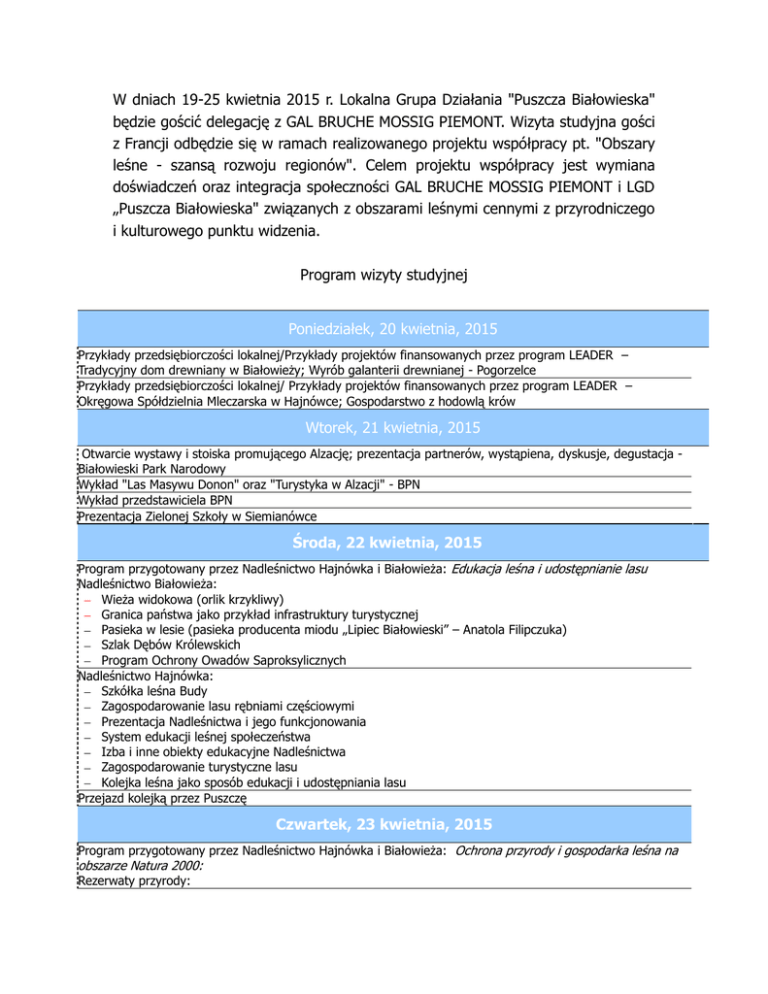 W dniach 19-25 kwietnia 2015 r. Lokalna Grupa Działania "Puszcza Białowieska" będzie gościć delegację z GAL BRUCHE MOSSIG PIEMONT. Wizyta studyjna gości z Francji odbędzie się w ramach realizowanego projektu współpracy pt. "Obszary leśne - szansą rozwoju regionów". Celem projektu współpracy jest wymiana doświadczeń oraz integracja społeczności GAL BRUCHE MOSSIG PIEMONT i LGD „Puszcza Białowieska" związanych z obszarami leśnymi cennymi z przyrodniczego i kulturowego punktu widzenia. Program wizyty studyjnej Poniedziałek, 20 kwietnia, 2015 Przykłady przedsiębiorczości lokalnej/Przykłady projektów finansowanych przez program LEADER – Tradycyjny dom drewniany w Białowieży; Wyrób galanterii drewnianej - Pogorzelce Przykłady przedsiębiorczości lokalnej/ Przykłady projektów finansowanych przez program LEADER – Okręgowa Spółdzielnia Mleczarska w Hajnówce; Gospodarstwo z hodowlą krów Wtorek, 21 kwietnia, 2015 Otwarcie wystawy i stoiska promującego Alzację; prezentacja partnerów, wystąpiena, dyskusje, degustacja Białowieski Park Narodowy Wykład "Las Masywu Donon" oraz "Turystyka w Alzacji" - BPN Wykład przedstawiciela BPN Prezentacja Zielonej Szkoły w Siemianówce Środa, 22 kwietnia, 2015 Program przygotowany przez Nadleśnictwo Hajnówka i Białowieża: Edukacja leśna i udostępnianie lasu Nadleśnictwo Białowieża: Wieża widokowa (orlik krzykliwy) Granica państwa jako przykład infrastruktury turystycznej Pasieka w lesie (pasieka producenta miodu „Lipiec Białowieski” – Anatola Filipczuka) Szlak Dębów Królewskich Program Ochrony Owadów Saproksylicznych Nadleśnictwo Hajnówka: Szkółka leśna Budy Zagospodarowanie lasu rębniami częściowymi Prezentacja Nadleśnictwa i jego funkcjonowania System edukacji leśnej społeczeństwa Izba i inne obiekty edukacyjne Nadleśnictwa Zagospodarowanie turystyczne lasu Kolejka leśna jako sposób edukacji i udostępniania lasu Przejazd kolejką przez Puszczę Czwartek, 23 kwietnia, 2015 Program przygotowany przez Nadleśnictwo Hajnówka i Białowieża: Ochrona przyrody i gospodarka leśna na obszarze Natura 2000: Rezerwaty przyrody: rezerwat Podolany rezerwat Krajobrazowy Pomniki przyrody: Dąb Kongresowy Dąb Senatorski Ochrona siedlisk bagiennych, orlika krzykliwego i gatunków wodno-błotnych Łąki nad Łutownią ochrona lasów bagiennych i wilgotnych – zamieranie jesionów Zagospodarowanie łowieckie – uroczysko Sośninik Program przygotowany przez Nadleśnictwo Hajnówka i Białowieża: Ochrona przyrody i gospodarka leśna na obszarze Natura 2000: Rezerwaty Przyrody – leśne: Dolina rzeki Leśnej, w tym: ochrona stanowisk motyli dziennych – aktywna ochrona gatunkowa Ścieżka edukacyjna – Ochrona Orlika Obserwacja ornitologiczna – rzeka Perebel i zbiorniki retencyjne Topiło „Sosna snajperska” Piątek, 24 kwietnia, 2015 Przykłady przedsiębiorczości lokalnej/Przykłady projektów finansowanych przez program LEADER: Wytwórnia miodów pitnych w Sakach; Nasycalnia podkładów kolejowych w Czeremsze Warsztaty rękodzieła ludowego – GOK Czeremcha Prezentacja dorobku twórczości ludowej zespołu Czeremszyna