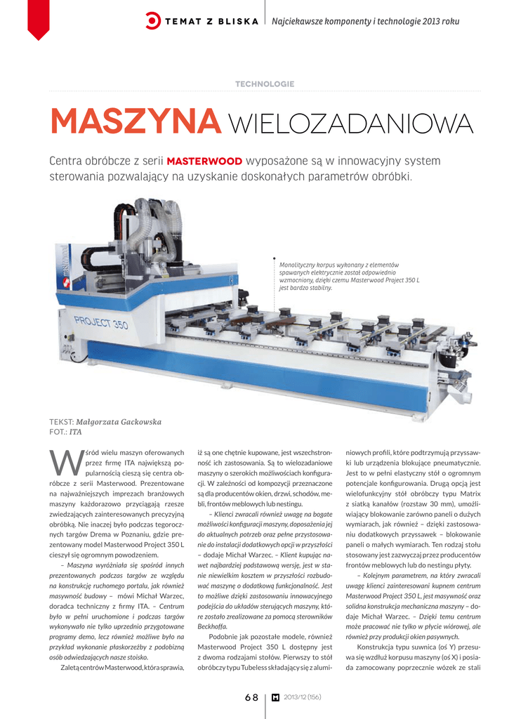 t e m at z b l i s k a Najciekawsze komponenty i technologie 2013 roku technologie Maszyna wielozadaniowa Centra obróbcze z serii Masterwood wyposażone są w innowacyjny system sterowania pozwalający na uzyskanie doskonałych parametrów obróbki. Monolityczny korpus wykonany z elementów spawanych elektrycznie został odpowiednio wzmocniony, dzięki czemu Masterwood Project 350 L jest bardzo stabilny. TEKST: Małgorzata Gackowska fot.: ITA W śród wielu maszyn oferowanych przez firmę ITA największą popularnością cieszą się centra obróbcze z serii Masterwood. Prezentowane na najważniejszych imprezach branżowych maszyny każdorazowo przyciągają rzesze zwiedzających zainteresowanych precyzyjną obróbką. Nie inaczej było podczas tegorocznych targów Drema w Poznaniu, gdzie prezentowany model Masterwood Project 350 L cieszył się ogromnym powodzeniem. – Maszyna wyróżniała się spośród innych prezentowanych podczas targów ze względu na konstrukcję ruchomego portalu, jak również masywność budowy – mówi Michał Warzec, doradca techniczny z firmy ITA. – Centrum było w pełni uruchomione i podczas targów wykonywało nie tylko uprzednio przygotowane programy demo, lecz również możliwe było na przykład wykonanie płaskorzeźby z podobizną osób odwiedzających nasze stoisko. Zaletą centrów Masterwood, która sprawia, iż są one chętnie kupowane, jest wszechstronność ich zastosowania. Są to wielozadaniowe maszyny o szerokich możliwościach konfiguracji. W zależności od kompozycji przeznaczone są dla producentów okien, drzwi, schodów, mebli, frontów meblowych lub nestingu. – Klienci zwracali również uwagę na bogate możliwości konfiguracji maszyny, doposażenia jej do aktualnych potrzeb oraz pełne przystosowanie do instalacji dodatkowych opcji w przyszłości – dodaje Michał Warzec. – Klient kupując nawet najbardziej podstawową wersję, jest w stanie niewielkim kosztem w przyszłości rozbudować maszynę o dodatkową funkcjonalność. Jest to możliwe dzięki zastosowaniu innowacyjnego podejścia do układów sterujących maszyny, które zostało zrealizowane za pomocą sterowników Beckhoffa. Podobnie jak pozostałe modele, również Masterwood Project 350 L dostępny jest z dwoma rodzajami stołów. Pierwszy to stół obróbczy typu Tubeless składający się z alumi- 68 2013/12 (156) niowych profili, które podtrzymują przyssawki lub urządzenia blokujące pneumatycznie. Jest to w pełni elastyczny stół o ogromnym potencjale konfigurowania. Drugą opcją jest wielofunkcyjny stół obróbczy typu Matrix z siatką kanałów (rozstaw 30 mm), umożliwiający blokowanie zarówno paneli o dużych wymiarach, jak również – dzięki zastosowaniu dodatkowych przyssawek – blokowanie paneli o małych wymiarach. Ten rodzaj stołu stosowany jest zazwyczaj przez producentów frontów meblowych lub do nestingu płyty. – Kolejnym parametrem, na który zwracali uwagę klienci zainteresowani kupnem centrum Masterwood Project 350 L, jest masywność oraz solidna konstrukcja mechaniczna maszyny – dodaje Michał Warzec. – Dzięki temu centrum może pracować nie tylko w płycie wiórowej, ale również przy produkcji okien pasywnych. Konstrukcja typu suwnica (oś Y) przesuwa się wzdłuż korpusu maszyny (oś X) i posiada zamocowany poprzecznie wózek ze stali t e m at z b l i s k a Najciekawsze komponenty i technologie 2013 roku W efekcie prezentacji na targach Drema firma ITA sprzedała kilka maszyn Masterwood Project 350 L głównie klientom, którzy pracują w drewnie litym. (oś Z), na którym są zainstalowane zespoły obróbcze. Dla zagwarantowania większej sztywności ruchu w osi X suwnica jest przesuwana za pomocą zębatki i listwy zębatej wyposażonej w pochylone, szlifowane zęby. Zębatka zaś, zamocowana sztywno na reduktorze o bardzo dużej precyzji, posiada zęby szlifowane spiralnie. Z kolei przesuwanie osi Y- Z odbywa się za pomocą śrub kulowo-tocznych o dużej precyzji, z systemem korekcji wstępnej. Dzięki temu systemowi luzy połączenia są wyzerowane, co gwarantuje maksymalną precyzję pozycjonowania. Komputerowa kontrola przyspieszania w połączeniu z dużą sztywnością konstrukcji gwarantuje ruchy błyskawiczne i bez wibracji. Wszystkie ruchy odbywają się na prowadnicach liniowych ze ślizgami kulowotocznymi z korekcją wstępną, wyposażonymi w podwójną uszczelkę dla uniemożliwienia przenikania pyłu do wnętrza tych ślizgów. Ten system gwarantuje praktycznie nieograniczoną trwałość, bez konieczności wykonywania konserwacji maszyny. Centra Masterwood to wielozadaniowe maszyny o szerokich możliwościach konfiguracji. Ruch w poszczególnych osiach obróbczych jest wykonywany za pomocą silników bezszczotkowych, które pozwalają na uzyskanie dużych przyspieszeń i prędkości. Wielkość ruchu w poszczególnych osiach wynosi: X = 5822 mm, Y = 1902 mm, Z = 350 mm. Z kolei prędkości osiągane w poszczególnych osiach obróbczych to: X i Y= 80 m/min, a Z = 25 m/min. Głowica wiertarska posiada 13 wierteł pionowych oraz 6 poziomych, agregat posiada również zintegrowaną piłkę do nutowania w osi X. Wszystkie wrzeciona obracają się równocześnie w kierunku prawym i lewym. Ruch wprowadzania do obróbki jest niezależny dla każdego wrzeciona i wykonywany za pomocą siłowników pneumatycznych, co pozwala na wykonywanie wierceń pojedynczych, jak również wielopunktowych. Zespół piły wbudowany w głowicę wiercącą, do wykonywania nacięć i do cięcia wzdłuż osi X, pracuje z prędkością obrotową 4000 obr./min. Z kolei zespół frezujący pionowy (elektrowrzeciono o mocy 12 kW) zamontowany jest bezpośrednio na głowicy wiercącej reklama autopromocja pion f ita f poz 69 2013/12 (156) i wyposażony w pneumatyczne wysuwanie na pozycję roboczą. Jego ruch odbywa się na prowadnicy liniowej o szerokości 75 mm ze ślizgami kulowo-tocznymi z korekcją wstępną dla zagwa