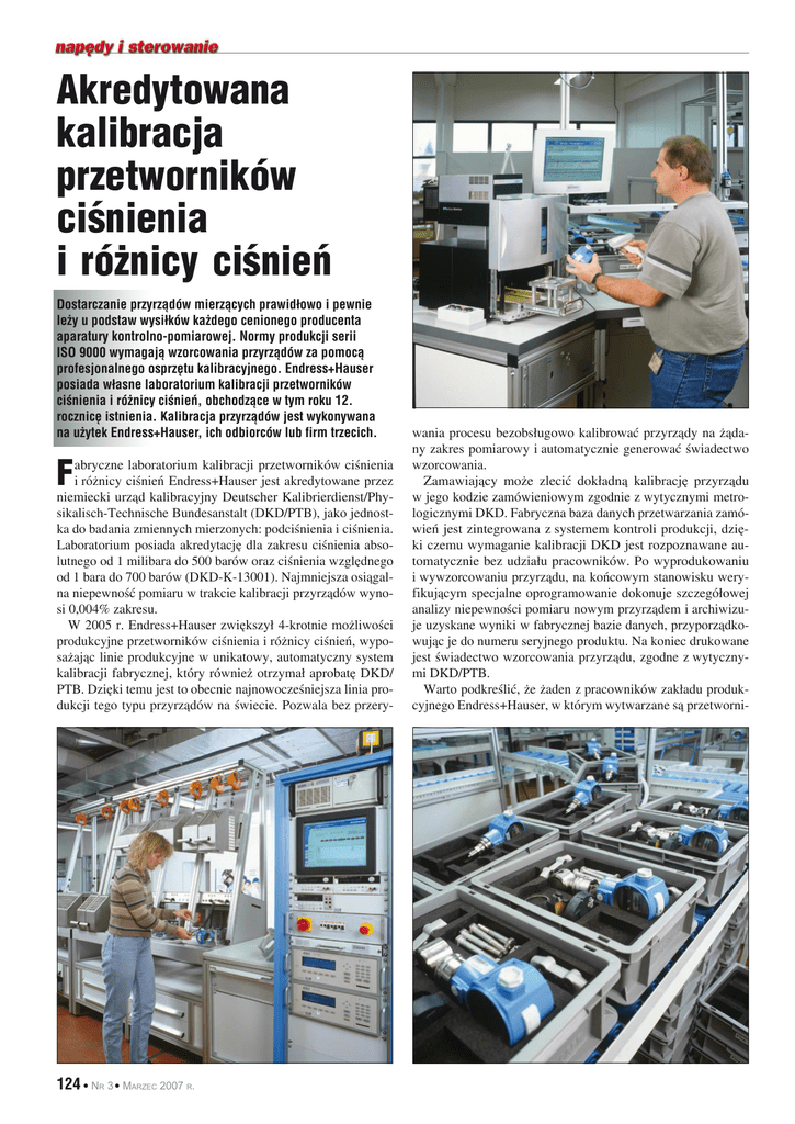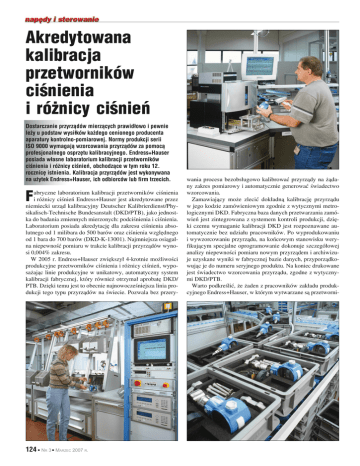 Akredytowana kalibracja przetworników ciśnienia i różnicy ciśnień Dostarczanie przyrządów mierzących prawidłowo i pewnie leży u podstaw wysiłków każdego cenionego producenta aparatury kontrolno-pomiarowej. Normy produkcji serii ISO 9000 wymagają wzorcowania przyrządów za pomocą profesjonalnego osprzętu kalibracyjnego. Endress+Hauser posiada własne laboratorium kalibracji przetworników ciśnienia i różnicy ciśnień, obchodzące w tym roku 12. rocznicę istnienia. Kalibracja przyrządów jest wykonywana na użytek Endress+Hauser, ich odbiorców lub firm trzecich. F abryczne laboratorium kalibracji przetworników ciśnienia i różnicy ciśnień Endress+Hauser jest akredytowane przez niemiecki urząd kalibracyjny Deutscher Kalibrierdienst/Physikalisch-Technische Bundesanstalt (DKD/PTB), jako jednostka do badania zmiennych mierzonych: podciśnienia i ciśnienia. Laboratorium posiada akredytację dla zakresu ciśnienia absolutnego od 1 milibara do 500 barów oraz ciśnienia względnego od 1 bara do 700 barów (DKD-K-13001). Najmniejsza osiągalna niepewność pomiaru w trakcie kalibracji przyrządów wynosi 0,004% zakresu. W 2005 r. Endress+Hauser zwiększył 4-krotnie możliwości produkcyjne przetworników ciśnienia i różnicy ciśnień, wyposażając linie produkcyjne w unikatowy, automatyczny system kalibracji fabrycznej, który również otrzymał aprobatę DKD/ PTB. Dzięki temu jest to obecnie najnowocześniejsza linia produkcji tego typu przyrządów na świecie. Pozwala bez przery- 124 NR 3 MARZEC 2007 R. wania procesu bezobsługowo kalibrować przyrządy na żądany zakres pomiarowy i automatycznie generować świadectwo wzorcowania. Zamawiający może zlecić dokładną kalibrację przyrządu w jego kodzie zamówieniowym zgodnie z wytycznymi metrologicznymi DKD. Fabryczna baza danych przetwarzania zamówień jest zintegrowana z systemem kontroli produkcji, dzięki czemu wymaganie kalibracji DKD jest rozpoznawane automatycznie bez udziału pracowników. Po wyprodukowaniu i wywzorcowaniu przyrządu, na końcowym stanowisku weryfikującym specjalne oprogramowanie dokonuje szczegółowej analizy niepewności pomiaru nowym przyrządem i archiwizuje uzyskane wyniki w fabrycznej bazie danych, przyporządkowując je do numeru seryjnego produktu. Na koniec drukowane jest świadectwo wzorcowania przyrządu, zgodne z wytycznymi DKD/PTB. Warto podkreślić, że żaden z pracowników zakładu produkcyjnego Endress+Hauser, w którym wytwarzane są przetworni- reklama ki ciśnienia i różnicy ciśnień, nie bierze bezpośredniego udziału w procedurze wzorcowania i późniejszej weryfikacji przyrządów pomiarowych. Brak czynnika ludzkiego eliminuje możliwość pojawienia się błędów przypadkowych w kalibracji przetworników i gwarantuje, że dokładność pomiaru nowych przyrządów jest w pełni zgodna z danymi technicznymi w karcie katalogowej. Dla zapewnienia najwyższej niezawodności automatycznej linii kalibracji przyrządów jest ona okresowo poddawana weryfikacji autoryzującej, którą przeprowadzają uprawnieni inspektorzy metrologiczni DKD/PTB. Pozwala to również optymalizować procedurę kalibracyjną, która ma kluczowe znaczenie dla jakości produkowanych przyrządów. Endress+Hauser jest czołowym światowym dostawcą aparatury do obiektowych pomiarów ciśnienia z ponad 20-letnim doświadczeniem aplikacyjnym. Produkty Endress+Hauser są znane na całym świecie i cenione za niezmiennie najwyższą jakość, innowacyjność rozwiązań technicznych i pewność działania. http://www.pl.endress.com/cisnienie Wydarzenia Firma Lightfleet opracowała nowy rodzaj komputera, który do przesyłania danych wykorzystuje technologię laserową. System oparty jest na 32 dwurdzeniowych procesorach Intel, które do komunikacji ze sobą używają wiązki lasera, co pozwala na przyspieszenie przepływu informacji. Każdy z mikroprocesorów wyposażony jest w transmiter, odbiornik i lustro. Ten sposób jednoczesnego przesyłania danych jest idealny dla aplikacji, które wymagają szczególnie dużej mocy obliczeniowej. Istotną korzyścią wynikająca z używania tej technologii jest zmniejszone zapotrzebowanie na energię. NR 3 MARZEC 2007 R. 125