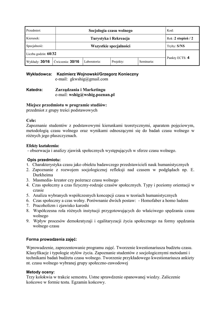 Przedmiot: Socjologia czasu wolnego Kierunek: Turystyka i Rekreacja Rok :2 stopień / 2 Specjalność: Wszystkie specjalności Tryby: S/NS Kod: Liczba godzin: 60/32 Punkty ECTS: 4 Wykłady: 30/16 Ćwiczenia: 30/16 Wykładowca: Laboratoria: Projekty: Seminaria: Kazimierz Wojnowski/Grzegorz Konieczny e-mail: [email protected] Katedra: Zarządzania i Marketingu e-mail: [email protected] Miejsce przedmiotu w programie studiów: przedmiot z grupy treści podstawowych Cele: Zapoznanie studentów z podstawowymi kierunkami teoretycznymi, aparatem pojęciowym, metodologią czasu wolnego oraz wynikami odnoszącymi się do badań czasu wolnego w różnych jego płaszczyznach. Efekty kształcenia: - obserwacja i analizy zjawisk społecznych występujących w sferze czasu wolnego. Opis przedmiotu: Charakterystyka czasu jako obiektu badawczego przedstawicieli nauk humanistycznych 2. Zapoznanie z rozwojem socjologicznej refleksji nad czasem w podglądach np. E. Durkheima 3. Masmedia- kreator czy pożeracz czasu wolnego 4. Czas społeczny a czas fizyczny-rodzaje czasów społecznych. Typy i poziomy orientacji w czasie 5. Analiza wybranych współczesnych koncepcji czasu w teoriach humanistycznych 6. Czas społeczny a czas wolny. Porównanie dwóch postaw: - Homofaber a homo ludens 7. Pracoholizm i zjawisko karoshi 8. Współczesna rola różnych instytucji przygotowujących do właściwego spędzania czasu wolnego 9. Wpływ procesów demokratyzaji i egalitaryzacji życia społecznego na formy spędzania wolnego czasu 1. Forma prowadzenia zajęć: Wprowadzenie, zaprezentowanie programu zajęć. Tworzenie kwestionariusza budżetu czasu. Klasyfikacje i typologie stylów życia. Zapoznanie studentów z socjologicznymi metodami i technikami badań budżetu czasu wolnego. Tworzenie przykładowego kwestionariusza ankiety nt. czasu wolnego wybranej grupy społeczno-zawodowej Metody oceny: Trzy kolokwia w trakcie semestru. Ustne sprawdzenie opanowanej wiedzy. Zaliczenie końcowe w formie testu. Egzamin końcowy. Bibliografia: Obowiązkowa: 1. J Suprewicz ,,Socjologia turystyki’’ Lublin 2005 2. J. Smith ,, Zaplanuj swój czas;’’ Warszawa 2004 3. J. Lothar Seiwert ,,Jak organizować czas’’ Warszawa 1998 4. I. Kiełbasiewicz-Drozdowska, M. Marcinkowski, W. Siwiński ,, Interdyscyplinarne zagadnienia aktywności rekreacyjnej, sportowej i turystycznej końca xx wieku’’ Poznań 2000 Zalecana: 1. G. Cieloch, J. Kuczyński, J Rogoziński ,, Czas wolny-czasem konsumpcji’’ Warszawa 1992 2. W. Siwiński ,,Pedagogika kultury fizycznej w zarysie’’ Poznań 200