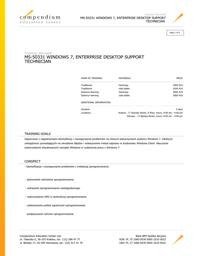 Training Microsoft MS-50331 WINDOWS 7, ENTERPRISE DESKTOP SUPPORT TECHNICIAN Page 1 of 9 Training: Microsoft MS-50331 WINDOWS 7, ENTERPRISE DESKTOP SUPPORT TECHNICIAN FORM OF TRAINING MATERIALS PRICE Traditional Hardcopy 3900 PLN Traditional ctab tablet 4200 PLN Distance learning Hardcopy 3900 PLN Distance learning ctab tablet 3800 PLN ADDITIONAL INFORMATION Duration Locations 5 days Krakow - 5 Tatarska Street, II floor, hours: 9:00 am - 4:00 pm Warsaw - 17 Bielska Street, hours: 9:00 am - 4:00 pm TRAINING GOALS Zapoznanie z zagadnieniami identyfikacji i rozwiązywania problemów na różnych płaszczyznach systemu Windows 7. Zdobycie umiejętnosci pozwalających na określanie błędów i wskazywanie metod naprawy w środowisku Windows Client. Nauczenie wykorzystania wbudowanych narzędzi Windows w codziennej pracy z Windows 7. CONSPECT - Identyfikacja i rozwiązywanie problemów z instalacją oprogramowania - planowanie wdrożenia oprogramowania - wdrażanie oprogramowania wielojęzykowego - wykorzystanie GPO w dystrybucji oprogramowania - zastosowanie polityk ograniczeń oprogramowania - podpisywanie cyfrowe oprogramowania Compendium Education Center Ltd. ul. Tatarska 5, 30-103 Kraków, tel.: (12) 298 47 77 ul. Bielska 17, 02-394 Warszawa, tel.: (22) 417 41 70 Bank BPH Spółka Akcyjna EUR: PL 75 1060 0076 0000 3210 0022 USD: PL 27 1060 0076 0000 3210 0022 Training Microsoft MS-50331 WINDOWS 7, ENTERPRISE DESKTOP SUPPORT TECHNICIAN Page 2 of 9 - wykorzystanie WMI - zastosowanie AppLocker - wykorzystanie wirtualizacji w testowaniu - rozwiązywanie problemów z błędami instalacji - Rozwiązywanie problemów z konfiguracją oprogramowania - zmiana domyślnych ustawień w obrazach - włączanie i wyłączanie funkcji - konfiguracja poprawek - rozwiązywanie problemów z GPO - aktualizacje sterowników - zastosowanie Problem Steps Recorder - rozwiązywanie błędów konfiguracji oprogramowania - Rozwiązywanie błędów oprogramowania - podgląd zdarzeń - przekazywanie zdarzeń - zastosowanie Application Compatibility Toolkit - zastosowanie Windows Troubleshooting Platform - zastosowanie Windows Experience Index Compendium Education Center Ltd. ul. Tatarska 5, 30-103 Kraków, tel.: (12) 298 47 77 ul. Bielska 17, 02-394 Warszawa, tel.: (22) 417 41 70 Bank BPH Spółka Akcyjna EUR: PL 75 1060 0076 0000 3210 0022 USD: PL 27 1060 0076 0000 3210 0022 Training Microsoft MS-50331 WINDOWS 7, ENTERPRISE DESKTOP SUPPORT TECHNICIAN Page 3 of 9 - testowanie kompatybilności w trybie awaryjnym - odtwarzanie systemu - rozwiązywanie problemów z błędami oprogramowania - Identyfikacja i rozwiązywanie problemów z logowaniem - proces uwierzytelniania - konta komputerów - relacje zaufania - usługi sieciowe - właściwości kont użytkowników - profile użytkowników - rozwiązywanie problemów z logowaniem - Identyfikacja i rozwiązywanie problemów z połączeniami sieciowymi - zakres problematyki - błędy sprzętowe - konfiguracja TCP/IP - trasowanie - konfiguracja IPSec Compendium Education Center Ltd. ul. Tatarska 5, 30-103 Kraków, tel.: (12) 298 47 77 ul. Bielska 17, 02-394 Warszawa, tel.: (22) 417 41 70 Bank BPH Spółka Akcyjna EUR: PL 75 1060 0076 0000 3210 0022 USD: PL 27 1060 0076 0000 3210 0022 Training Microsoft MS-50331 WINDOWS 7, ENTERPRISE DESKTOP SUPPORT TECHNICIAN Page 4 of 9 - narzędzia połączeń sieciowych - Branch Cache - rozwiązywanie problemów połączeniami sieciowymi - Identyfikacja i rozwiązywanie problemów z rozpoznawaniem nazw - rozpoznawanie nazw DNS - wykorzystanie pliku hosts - konfiguracja WINS - wykorzystanie pliku lmhosts - kolejność rozpoznawania nazw - rozwiązywanie problemów z rozpoznawaniem nazw - Identyfikacja i rozwiązywanie problemów z drukowaniem - podłączanie do drukarek sieciowych - zarządzanie kolejką wydruku - ustawianie priorytetów wydruku - tworzenie pul drukarek - konfiguracja sterowników - harmonogram wydruku - uprawnienia wydruku Compendium Education Center Ltd. ul. Tatarska 5, 30-103 Kraków, tel.: (12) 298 47 77 ul. Bielska 17, 02-394 Warszawa, tel.: (22) 417 41 70 Bank BPH Spółka Akcyjna EUR: PL 75 1060 0076 0000 3210 0022 USD: PL 27 1060 0076 0000 3210 0022 Training Microsoft MS-50331 WINDOWS 7, ENTERPRISE DESKTOP SUPPORT TECHNICIAN Page 5 of 9 - zarządzanie drukarkami z wykorzystaniem GPO - rozwiązywanie problemów z drukowaniem - Identyfikacja i rozwiązywanie problemów z wydajnością - analiza zdarzeń - ustawienia zasilania - optymalizacja wykorzystania procesora - optymalizacja wykorzystania pamięci - optymalizacja wykorzystania dysku twardego - optymalizacja wykorzystania interfejsów sieciowych - narzędzia wydajności - rozwiązywanie problemów z wydajnością - Identyfikacja i rozwiązywanie problemów z błędami sprzętu - diagnostyka błędów pamięci - błędy dysku twardego - błędy interfejsów sieciowych - błędy zasilania - narzędzia diagnostyki sprzętu Compendium Education Center Ltd. ul. Tatarska 5, 30-103 Kraków, tel.: (12) 298 47 77 ul. Bielska 17, 02-394 Warszawa, tel.: (22) 417 41 70 Bank BPH Spółka Akcyjna EUR: PL 75 1060 0076 0000 3210 0022 USD: PL 27 1060 0076 0000 3210 0022 Training Microsoft MS-50331 WINDOWS 7, ENTERPRISE DESKTOP SUPPORT TECHNICIAN Page 6 of 9 - rozwiązywanie problemów z błędami sprzętu - Identyfikacja i rozwiązywanie problemów z połączeniami bezprzewodowymi - zasięg sieci bezprzewodowych - zabezpieczenia sieci bezprzewodowych - profile sieci bezprzewodowych - opcje zarządzania interfejsami bezprzewodowymi - rozwiązywanie problemów z połączeniami bezprzewodowymi - Identyfikacja i rozwiązywanie problemów z dostępem zdalnym - metody dostępu zdalnego - konfiguracja dial-up - konfiguracja VPN - konfiguracja DirectAccess - protokoły uwierzytelniania - rozwiązywanie problemów z dostępem zdalnym - Zarządzanie synchronizacją plików - konfiguracja dostępu do plików trybu offline Compendium Education Center Ltd. ul. Tatarska 5, 30-103 Kraków, te