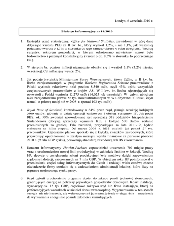 Londyn, 6 września 2010 r. Biuletyn Informacyjny nr 14/2010 1