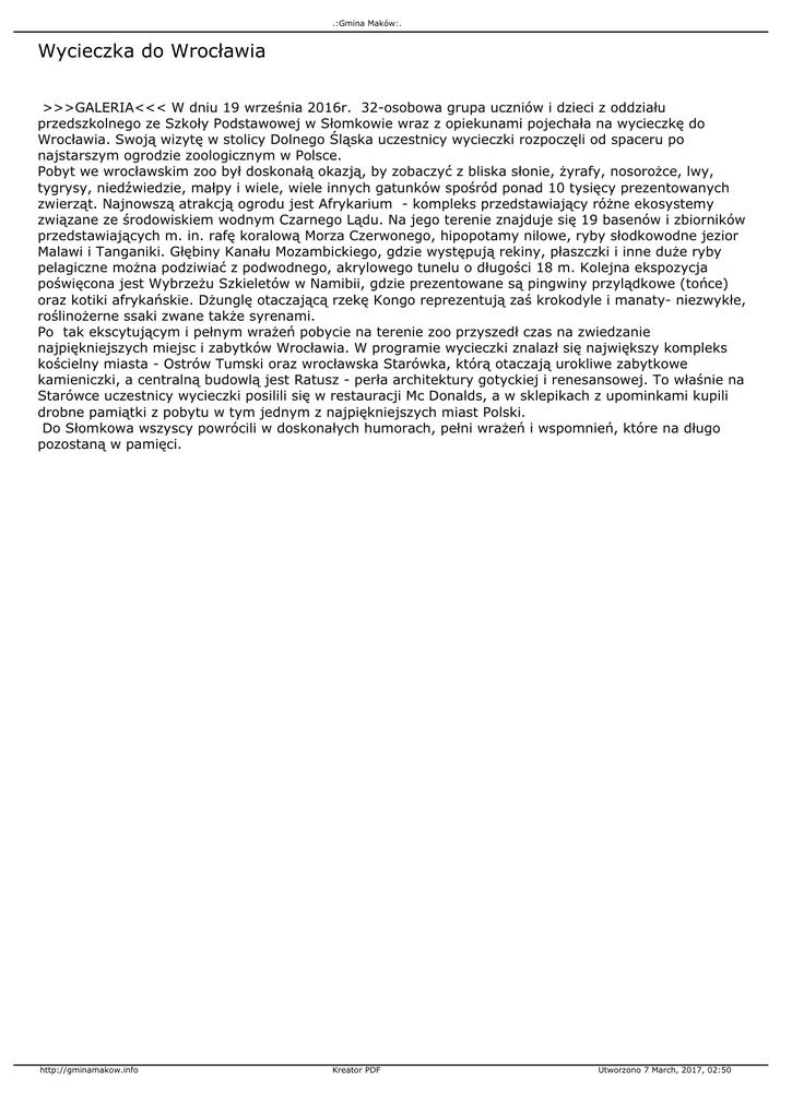 .:Gmina Maków:. Wycieczka do Wrocławia >>>GALERIA<<< W dniu 19 września 2016r. 32-osobowa grupa uczniów i dzieci z oddziału przedszkolnego ze Szkoły Podstawowej w Słomkowie wraz z opiekunami pojechała na wycieczkę do Wrocławia. Swoją wizytę w stolicy Dolnego Śląska uczestnicy wycieczki rozpoczęli od spaceru po najstarszym ogrodzie zoologicznym w Polsce. Pobyt we wrocławskim zoo był doskonałą okazją, by zobaczyć z bliska słonie, żyrafy, nosorożce, lwy, tygrysy, niedźwiedzie, małpy i wiele, wiele innych gatunków spośród ponad 10 tysięcy prezentowanych zwierząt. Najnowszą atrakcją ogrodu jest Afrykarium - kompleks przedstawiający różne ekosystemy związane ze środowiskiem wodnym Czarnego Lądu. Na jego terenie znajduje się 19 basenów i zbiorników przedstawiających m. in. rafę koralową Morza Czerwonego, hipopotamy nilowe, ryby słodkowodne jezior Malawi i Tanganiki. Głębiny Kanału Mozambickiego, gdzie występują rekiny, płaszczki i inne duże ryby pelagiczne można podziwiać z podwodnego, akrylowego tunelu o długości 18 m. Kolejna ekspozycja poświęcona jest Wybrzeżu Szkieletów w Namibii, gdzie prezentowane są pingwiny przylądkowe (tońce) oraz kotiki afrykańskie. Dżunglę otaczającą rzekę Kongo reprezentują zaś krokodyle i manaty- niezwykłe, roślinożerne ssaki zwane także syrenami. Po tak ekscytującym i pełnym wrażeń pobycie na terenie zoo przyszedł czas na zwiedzanie najpiękniejszych miejsc i zabytków Wrocławia. W programie wycieczki znalazł się największy kompleks kościelny miasta - Ostrów Tumski oraz wrocławska Starówka, którą otaczają urokliwe zabytkowe kamieniczki, a centralną budowlą jest Ratusz - perła architektury gotyckiej i renesansowej. To właśnie na Starówce uczestnicy wycieczki posilili się w restauracji Mc Donalds, a w sklepikach z upominkami kupili drobne pamiątki z pobytu w tym jednym z najpiękniejszych miast Polski. Do Słomkowa wszyscy powrócili w doskonałych humorach, pełni wrażeń i wspomnień, które na długo pozostaną w pamięci. http://gminamakow.info Kreator PDF Utworzono 7 March, 2017, 02:50