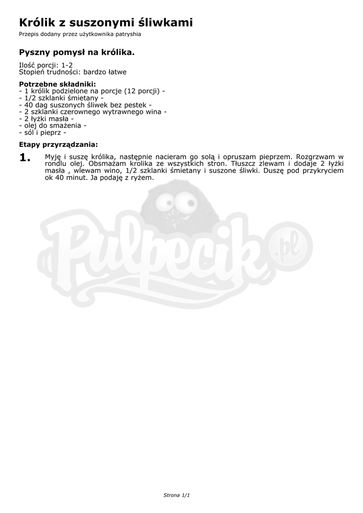 Królik z suszonymi śliwkami Przepis dodany przez użytkownika patryshia Pyszny pomysł na królika. Ilość porcji: 1-2 Stopień trudności: bardzo łatwe Potrzebne składniki: - 1 królik podzielone na porcje (12 porcji) - 1/2 szklanki śmietany - 40 dag suszonych śliwek bez pestek - 2 szklanki czerownego wytrawnego wina - 2 łyżki masła - olej do smażenia - sól i pieprz Etapy przyrządzania: 1. Myję i suszę królika, następnie nacieram go solą i opruszam pieprzem. Rozgrzwam w rondlu olej. Obsmażam krolika ze wszystkich stron. Tłuszcz zlewam i dodaje 2 łyżki masła , wlewam wino, 1/2 szklanki śmietany i suszone śliwki. Duszę pod przykryciem ok 40 minut. Ja podaję z ryżem. Strona 1/1
