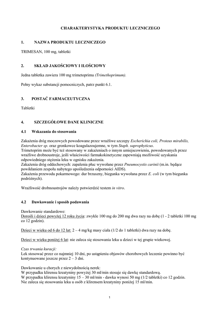 CHARAKTERYSTYKA PRODUKTU LECZNICZEGO 1. NAZWA PRODUKTU LECZNICZEGO TRIMESAN, 100 mg, tabletki 2. SKŁAD JAKOŚCIOWY I ILOŚCIOWY Jedna tabletka zawiera 100 mg trimetoprimu (Trimethoprimum). Pełny wykaz substancji pomocniczych, patrz punkt 6.1. 3. POSTAĆ FARMACEUTYCZNA Tabletki 4. 4.1 SZCZEGÓŁOWE DANE KLINICZNE Wskazania do stosowania Zakażenia dróg moczowych powodowane przez wrażliwe szczepy Escherichia coli, Proteus mirabilis, Enterobacter sp. oraz gronkowce koagulazoujemne, w tym Staph. saprophyticus. Trimetoprim może być też stosowany w zakażeniach o innym umiejscowieniu, powodowanych przez wrażliwe drobnoustroje, jeśli właściwości farmakokinetyczne zapewniają możliwość uzyskania odpowiedniego stężenia leku w ognisku zakażenia. Zakażenia dróg oddechowych: zapalenia płuc wywołane przez Pneumocystis carinii (m.in. będące powikłaniem zespołu nabytego upośledzenia odporności AIDS). Zakażenia przewodu pokarmowego: dur brzuszny, biegunka wywołana przez E. coli (w tym biegunka podróżnych). Wrażliwość drobnoustrojów należy potwierdzić testem in vitro. 4.2 Dawkowanie i sposób podawania Dawkowanie standardowe: Dorośli i dzieci powyżej 12 roku życia: zwykle 100 mg do 200 mg dwa razy na dobę (1 - 2 tabletki 100 mg co 12 godzin). Dzieci w wieku od 6 do 12 lat: 2 – 4 mg/kg masy ciała (1/2 do 1 tabletki) dwa razy na dobę. Dzieci w wieku poniżej 6 lat: nie zaleca się stosowania leku u dzieci w tej grupie wiekowej. Czas trwania kuracji: Lek stosować przez co najmniej 10 dni, po ustąpieniu objawów chorobowych leczenie powinno być kontynuowane jeszcze przez 2 – 3 dni. Dawkowanie u chorych z niewydolnością nerek: W przypadku klirensu kreatyniny powyżej 30 ml/min stosuje się dawkę standardową. W przypadku klirensu kreatyniny 15 – 30 ml/min - dawka wynosi 50 mg (1/2 tabletki) co 12 godzin. Nie zaleca się stosowania leku u osób z klirensem kreatyniny poniżej 15 ml/min. 1 Dawkowanie specjalne: U chorych na dur brzuszny - początkowo 300 mg (3 tabletki) co 12 godzin (przez 2 do 3 dni), a następnie 200 mg (2 tabletki) co 12 godzin. U chorych z pneumocystozowym zapaleniem płuc dawka wynosi około 5 mg na kg masy ciała co 8 godzin lub 300 mg co 8 godzin. W przypadku leczenia skojarzonego razem z dapsonem należy stosować 100 mg/dobę. U chorych, którzy reagują na lek w ciągu pierwszych 72 godzin, leczenie należy kontynuować przez 14 dni. W przypadku biegunki podróżnych dawka wynosi 200 mg (2 tabletki) co 12 godzin. Tabletki można dzielić. 4.3 Przeciwwskazania - Nadwrażliwość na substancję czynną lub na którąkolwiek substancję pomocniczą wymienioną w punkcie 6.1. - Niedokrwistość megaloblastyczna związana z niedoborem kwasu foliowego. - Okres ciąży. - Ciężka niewydolność nerek. 4.4 Specjalne ostrzeżenia i środki ostrożności dotyczące stosowania Trimetoprim w rzadkich przypadkach może powodować zaburzenia w układzie krwiotwórczym. Wczesnymi objawami tych zaburzeń mogą być m.in. ból gardła, gorączka, wybroczyny. Pojawienie się objawów mogących wskazywać na uszkodzenie szpiku jest wskazaniem do natychmiastowego wykonania badania morfologii krwi z obrazem. Jeśli badanie wykaże zmniejszenie ilości któregokolwiek upostaciowanego składnika krwi, lek należy odstawić. U osób z niedoborem kwasu foliowego lub z podejrzeniem o taki niedobór, lek należy stosować z zachowaniem ostrożności. Trimetoprim należy stosować ostrożnie u osób z zaburzeniami czynności wątroby lub nerek. 4.5 Interakcje z innymi produktami leczniczymi i inne rodzaje interakcji Trimetoprim hamuje metabolizm fenytoiny. Jednoczesne stosowanie trimetoprimu może przedłużyć okres półtrwania fenytoiny o 50%. Jeśli stosowanie obu leków jest niezbędne, należy chorego obserwować w kierunku potencjalnego przedawkowania fenytoiny. Jednoczesne stosowanie trimetoprimu może nasilać niedobory kwasu foliowego wywołane przez inne leki (np. fenytoinę, metotreksat). Trimetoprim może nasilać działanie warfaryny. Trimetoprim nasila działanie digoksyny, prokainamidu. Rifampicyna wpływa na wydalanie trimetoprimu, zmniejszając jego stężenie. Trimetoprim i dapson wzajemnie zwiększają swoje stężenia we krwi. Trimetoprim hamuje wymianę sód – potas w kanaliku dystalnym. Kliniczne konsekwencje jednoczesnego stosowania trimetoprimu z diuretykami oszczędzającymi potas nie są znane, jednak nie można wykluczyć potencjalnego zwiększenia ryzyka hiperkaliemii. 4.6 Wpływ na płodność, ciążę i laktację Wyniki badań przedklinicznych wskazują na możliwość wystąpienia zaburzeń rozwojowych płodu, dlatego nie należy stosować trimetoprimu w czasie ciąży. Trimetoprim przenika do mleka kobiecego. Nie zaleca się stosowania trimetoprimu podczas karmienia piersią. 4.7 Wpływ na zdolność prowadzenia pojazdów i obsługiwania maszyn 2 Brak jest doniesień o wpływie na zdolność prowadzenia pojazdów i obsługiwania maszyn. 4.8 Działania niepożądane Zaburzenia krwi i układu chłonnego: Trombocytopenia, leukopenia, neutropenia, niedokrwistość megaloblastyczna, methemoglobinemia. Zaburzenia żołądka i jelit: Uczucie dyskomfortu w nadbrzuszu, nudności, wymioty, zapalenie języka. Zaburzenia skóry i tkanki podskórnej: Najczęściej występują wysypki skórne, świąd oraz nadwrażliwość na światło. Częstość tych zmian zależy od dawki. Wysypki mają często charakter plamisto-grudkowy i występują 10 do 14 dni po rozpoczęciu leczenia. Zaburzenia układu immunologicznego: Rzadko odnotowano nadwrażliwość w postaci zespołu Stevensa-Johnsona, zespołu Lyella lub wstrząsu anafilaktycznego. Inne: Rzadko: hiperkaliemia lub hiponatremia, gorączka, wzrost stężenia mocznika lub kreatyniny w surowicy, wzrost stężenia bilirubiny i aktywności aminotransferaz, aseptyczne zapalenie opon mózgowo-rdzeniowych. 4.9 Przedawkowanie Objawy ostrego przedawkowania trimetoprimu pojawiają się po przyję