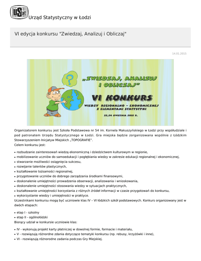 Urząd Statystyczny w Łodzi VI edycja konkursu "Zwiedzaj, Analizuj i Obliczaj" 14.01.2015 Organizatorem konkursu jest Szkoła Podstawowa nr 54 im. Kornela Makuszyńskiego w Łodzi przy współudziale i pod patronatem Urzędu Statystycznego w Łodzi. Gra miejska będzie zorganizowana wspólnie z Łódzkim Stowarzyszeniem Inicjatyw Miejskich „TOPOGRAFIE”. Celem konkursu jest: ● rozbudzanie zainteresowań wiedzą ekonomiczną i dziedzictwem kulturowym w regionie, ● mobilizowanie uczniów do samoedukacji i pogłębiania wiedzy w zakresie edukacji regionalnej i ekonomicznej, ● stwarzanie możliwości osiągnięcia sukcesu, ● rozwijanie talentów plastycznych, ● kształtowanie tożsamości regionalnej, ● przygotowanie uczniów do dobrego zarządzania środkami finansowymi, ● doskonalenie umiejętności prowadzenia obserwacji, analizowania i wnioskowania, ● doskonalenie umiejętności stosowania wiedzy w sytuacjach praktycznych, ● kształtowanie umiejętności korzystania z różnych źródeł informacji w czasie przygotowań do konkursu, ● wykorzystanie wiedzy i umiejętności w praktyce. Uczestnikami konkursu mogą być uczniowie klas IV – VI łódzkich szkół podstawowych. Konkurs organizowany jest w dwóch etapach: ● etap I - szkolny ● etap II - ogólnołódzki Biorący udział w konkursie uczniowie klas: ● IV - wykonują projekt karty płatniczej w dowolnej formie, formacie i materiału, ● V - rozwiązują różnordne zdania dotyczące tematyki konkursu (np. rebusy, krzyżówki i inne), ● VI - rozwiązują różnorodne zadania podczas Gry Miejskiej. Terminarz konkursu: 1. Na etapie szkolnym opiekun wybiera trzy prace i przesyła na adres lub dostarcza osobiście do organizatora konkursu. Termin nadsyłania prac kl. IV– 24 kwietnia 2015 r. 2. Etap ogólnołódzki dla klas V odbędzie się 22 kwietnia 2015 r. o godz. 12.00 w Szkole Podstawowej nr 54 w Łodzi, ul. Wróbla 5 Etap ogólnołódzki dla klas VI odbędzie się 24 kwietnia 2015 r. o godz. 10.00 – miejsce gry zostanie podane w osobnej wiadomości. Pobierz Adobe® Reader® Pobierz Word Viewer Pobierz Excel Viewer Pobierz PowerPoint Viewer Pobierz darmowe oprogramowanie do przeglądania plików: Pliki do pobrania Regulamin VI edycji konkursu 0.32 MB Oświadczenie 0.12 MB Karta zgłoszenia do VI edycji konkursu 0.12 MB Wyjdź z archiwum 2017 VIII edycja konkursu "Zwiedzaj, Analizuj i Obliczaj" 2016 VII edycja konkursu "Zwiedzaj, Analizuj i Obliczaj" 2015 VI edycja konkursu "Zwiedzaj, Analizuj i Obliczaj" 2014 V edycja Konkursu "Zwiedzaj, Analizuj i Obliczaj"