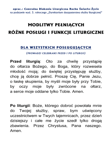 oprac.: Centralna Diakonia Liturgiczna Ruchu Światło -Życie na podstawie wyd. 3. roboczego „Dyrektorium duszpasterstwa służby liturgicznej” MODLITWY PEŁNIĄCYCH RÓŻNE POSŁUGI I FUNKCJE LITURGICZNE DLA WSZYSTKICH POSŁUGUJĄCYCH (PROWADZI CELEBRANS PRZED I PO LITURGII) Przed liturgią: Oto za chwilę przystąpię do ołtarza Bożego, do Boga, który rozwesela młodość moją; do świętej przystępuję służby, chcę ją dobrze pełnić. Proszę Cię, Panie Jezu, o łaskę skupienia, by myśli moje były przy Tobie, by oczy moje były zwrócone na ołtarz, a serce moje oddane tylko Tobie. Amen. Po liturgii: Boże, którego dobroć powołała mnie do Twojej służby, spraw, bym uświęcony uczestnictwem w Twych tajemnicach, przez dzień dzisiejszy i całe me życie szedł tylko drogą zbawienia. Przez Chrystusa, Pana naszego. Amen. Każda funkcja liturgiczna jest świętym posługiwaniem, w którym czł owiek jednoczy się z Chrystusem uobecniający m swe zbawcze dzieło. Jest to również służba wobe c ludzi, którzy zgromadzili się na wspólną celebrację. Posługujący powinien więc modlić się nie tylko za siebie, lecz także za tych, którym służy . MODLITWY DLA POSZCZEGÓLNYCH POSŁUGUJĄCYCH (DO INDYWIDUALNEGO ODMAWIANIA - w stosownym czasie) SŁUŻBA SŁOWA LEKTOR: Przed liturgią: Przyjdź, Duchu Święty! Udziel mi łaski godnego głoszenia słowa Bożego, a wszystkim zgromadzonym na liturgii udziel daru przyjęcia tego słowa w swoim sercu. Naucz nas wiernie pełnić wolę Ojca niebieskiego. Po liturgii: Dzięki Ci, Duchu Święty, za powołanie mnie do głoszenia słowa Bożego w świętej liturgii Kościoła. Spraw, abym gorliwie wprowadzał słowo w czyn i był jego świadkiem wobec innych ludzi. ORANT (CZYTAJĄCY WEZWANIA MODLITWY POWSZECHNEJ): Przed liturgią: Przyjdź, Duchu Święty! Udziel mi łaski godnego odczytywania wezwań modlitwy powszechnej, a wszystkim zgromadzonym na liturgii udziel daru modlitwy pełnej wiary i miłości. Naucz nas modlić się z Jezusem Chrystusem, naszym Panem i Zbawicielem. Po liturgii: Dzięki Ci, Duchu Święty, za powołanie mnie do odczytywania wezwań modlitwy powszechnej w świętej liturgii Kościoła. Spraw, abym zawsze gorliwie się modlił i był apostołem modlitwy wobec innych ludzi. KOMENTATOR: Przed liturgią: Przyjdź, Duchu Święty! Udziel mi łaski godnego odczytywania komentarzy w świętej liturgii Kościoła, a wszystkim zgromadzonym udziel daru rozumienia znaków wyrażających tajemnicę Chrystusa. Spraw, abyśmy świadomie i czynnie uczestniczyli w świętych obrzędach liturgicznych. Po liturgii: Dzięki Ci, Duchu Święty, za powołanie mnie do odczytywania komentarzy w świętej liturgii Kościoła. Spraw, abym nieustannie pogłębiał rozumienie tajemnic Chrystusa i był apostołem Eucharystii wobec innych ludzi. SŁUŻBA CZYNU CEREMONIARZ: Przed liturgią: Przyjdź, Duchu Święty! Udziel mi łaski godnego pełnienia zadań ceremoniarza w świętej liturgii Kościoła, a wszystkim pełniącym wyznaczone funkcje udziel daru gorliwości i współpracy. Spraw, abyśmy przez piękno spełnianych funkcji, pomogli wszystkim zgromadzonym zbliżyć się do Ciebie. Po liturgii: Dzięki Ci, Duchu Święty, za powołanie mnie do pełnienia zadań ceremoniarza w świętej liturgii Kościoła. Spraw, abym upodobniał się coraz bardziej do Chrystusa i pomagał innym umiłować posługiwanie w liturgii. POSŁUGUJĄCY PRZY OŁTARZU: Przed liturgią: Przyjdź, Duchu Święty! Udziel mi łaski godnego posługiwania przy świętym ołtarzu, a wszystkim zgromadzonym udziel daru ofiarnej miłości. Naucz nas siebie samych składać w ofierze za braci. Po liturgii: Dzięki Ci, Duchu Święty, za powołanie mnie do posługiwania przy świętym ołtarzu. Spraw, abym umiał służyć braciom we wszystkich ich potrzebach. NIOSĄCY KADZIDŁO: Przed liturgią: Przyjdź, Duchu Święty! Udziel mi łaski godnego pełnienia zadań ministranta kadzidła w świętej liturgii Kościoła, a wszystkim zgromadzonym udziel daru pięknej modlitwy wznoszącej się ku Bogu jak woń kadzidła. Spraw, abyśmy trwali w zjednoczeniu z Chrystusem, który składa na krzyżu całopalną ofiarę. Po liturgii: Dzięki Ci, Duchu Święty, za powołanie mnie do pełnienia zadań ministranta kadzidła w świętej liturgii Kościoła. Spraw, aby całe moje życie było wypełnione miłością, która umie spalać się w służbie braciom. NIOSĄCY KRZYŻ: Przed liturgią: Przyjdź, Duchu Święty! Udziel mi łaski godnego niesienia krzyża w liturgicznych procesjach, a wszystkim zgromadzonym udziel daru naśladowania Chrystusa niosącego krzyż. Naucz nas jeden drugiego brzemiona nosić. Po liturgii: Dzięki Ci, Duchu Święty, za powołanie mnie do niesienia krzyża w liturgicznych procesjach. Spraw, abym wiernie trwał pod krzyżem Chrystusa i był Jego świadkiem wobec braci. MINISTRANCI ŚWIATŁA: Przed liturgią: Przyjdź, Duchu Święty! Udziel mi łaski godnego niesienia światła w liturgicznych procesjach, a wszystkim zgromadzonym udziel daru życia w świetle Chrystusowej Ewangelii. Naucz nas miłować prawdę i według niej kształtować nasze życie. Po liturgii: Dzięki Ci, Duchu Święty, za powołanie mnie do niesienia światła w liturgicznych procesjach. Spraw, abym trwał w zjednoczeniu z Chrystusem i był przez swoje postępowanie był światłem dla moich braci. MINISTRANT KSIĘGI: Przed liturgią: Przyjdź, Duchu Święty! Udziel mi łaski godnego pełnienia zadań ministranta księgi w świętej liturgii Kościoła, a wszystkim zgromadzonym udziel daru łączenia osobistej modlitwy z modlitwą Chrystusa. Spraw, abyśmy umieli korzystać ze skarbca modlitw Kościoła, zawartych w księgach liturgicznych. Po liturgii: Dzięki Ci, Duchu Święty, za powołanie mnie do pełnienia zadań ministranta księgi w świętej liturgii Kościoła. Spraw, abym coraz lepiej poznawał piękno liturgicznej modlitwy i umiał ukazać to p