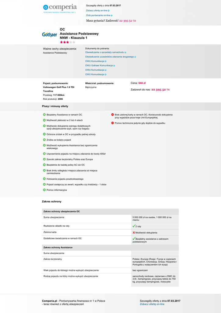 Szczegóły oferty z dnia 07.03.2017 Zobacz ofertę on-line Zrób porównanie on-line Masz pytania? Zadzwoń! 22 395 52 72 OC Assistance Podstawowy NNW - Klauzula 1 Ważne cechy ubezpieczenia: Dokumenty do pobrania: Assistance Podstawowy Oświadczenie o sprzedaży samochodu Oświadczenie uczestników zdarzenia drogowego OWU Komunikacja OWU Gothaer Komunikacja OWU Komunikacja OWU Komunikacja Pojazd, podsumowanie: Właściciel, podsumowanie: Volkswagen Golf Plus 1.9 TDI Mężczyzna Trendline Cena: 644 zł Zadzwoń do nas: 22 395 52 71 Przebieg: 117 000km Rok produkcji: 2006 Plusy i minusy oferty Bezpłatny Assistance w ramach OC Brak zielonej karty w ramach OC. Konieczność dokupienia przy wyjeździe poza kraje Unii Europejskiej. Możliwość płatności w 2 lub 4 ratach Pomoc techniczna jedynie gdy dojdzie do wypadku Możliwośc dokupienia szeregu dodatkowych opcji:ubezpieczenie szyb, opon czy bagażu Ochrona zniżek w OC w przypadku jednej szkody Zniżka za kolejny pojazd Możliwość wykupienia Assistance bez ograniczenia wiekowego Usprawnienie pojazdu na miejscu zdarzenia do kwoty 400zł Szeroki zakres terytorialny Polska oraz Europa Bezpłatnie do każdej polisy AC lub OC Brak limitu odległości miejsca zdarzenia od miejsca zamieszkania Holowanie pojazdu poszkodowanego Pojazd zastępczy po awarii, wypadku czy kradzieży - 1 doba Pomoc informacyjna Zakres ochrony Zakres ochrony ubezpieczenia OC Suma ubezpieczenia 5 000 000 zł na osobie, 1 000 000 zł na mieniu Rozłożenie składki na raty 2 raty Zielona karta Możliwość dokupienia Dodatkowe świadczenia w ramach OC Bezpłatny assistance z zakresem podstawowym Zakres ochrony Assistance Suma ubezpieczenia Zakres terytorialny Polska i Europa (Rosja i Turcja w częściach europejskich, Chorwacja, Grecja, Hiszpania i Portugalia z wyłączeniem ich wysp) Wiek pojazdu do którego można wykupić ubezpieczenie bez ograniczeń Rodzaj pojazdu na który można wykupić ubezpieczenie samochody osobowe, ciężarowe o DMC do 3,5t., kempingowe, przyczpey lekkie do 750 kg, przyczepy kempingowe, motocykle Comperia.pl - Porównywarka finansowa nr 1 w Polsce - teraz również z ofertą ubezpieczeń Szczegóły oferty z dnia 07.03.2017 Zobacz ofertę on-line Szczegóły oferty z dnia 07.03.2017 Zobacz ofertę on-line Zrób porównanie on-line Masz pytania? Zadzwoń! 22 395 52 72 Ograniczenia ze względu na sposób użytkowania pojazdu (np. taxi, nauka jazdy, rent a car) wyłączone są pojazdy taxi, nauki jazdy, rent a car Opcje zawarcia bezpłatnie do OC i/lub AC Usprawnienie pojazdu na miejscu zdarzenia Jest do 400 zł na zdarzenie Pomoc w razie awarii Pomoc w razie wypadku Limit odległości od miejsca zamieszkania Brak Miejsce holowania Do najbliższego warsztatu lub miejsca zamieszkania (lub innego miejsca, jeśli odległość nie jest większa niż do miejsca zamieszkania) - w Polsce nie dalej niż 135 km, za granicą nie dalej niż 75 km Samochód zastępczy Tak, tylko dla zdarzeń w Polsce (na 1 dzień. Raz w ciągu trwania umowy) Złomowanie pojazdu Parkowanie pojazdu Transport zastępczy/przewóz osób Nocleg/zakwaterowanie Dodatkowe informacje Dodatkowo w zakresie jest przewóz zwierząt, pomoc informacyjna Zakres ochrony NNW Suma ubezpieczenia Wypłata świadczenia w razie śmierci 5.000 zł 100% świadczenia Wsiadanie i wysiadanie z pojazdu Załadowanie lub wyładowanie pojazdu Pożar, wybuch pojazdu Zatrzymanie, postój, naprawa pojazdu Podwójne świadczenie w przypadku 90% trwałego uszczerbku na zdrowiu Garażowanie pojazdu Comperia.pl - Porównywarka finansowa nr 1 w Polsce - teraz również z ofertą ubezpieczeń Powered by TCPDF (www.tcpdf.org) Szczegóły oferty z dnia 07.03.2017 Zobacz ofertę on-line