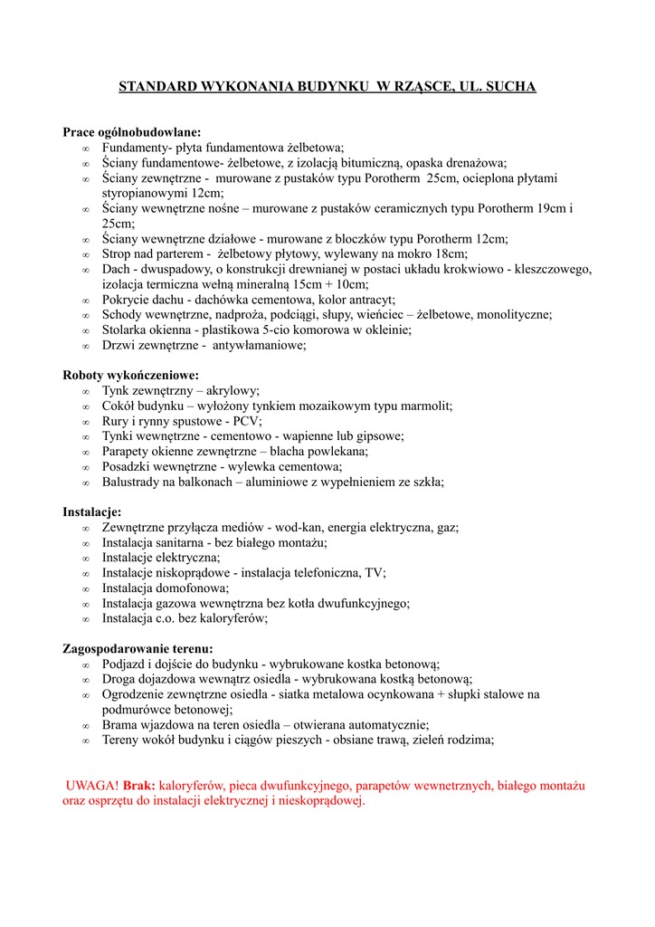 STANDARD WYKONANIA BUDYNKU W RZĄSCE, UL. SUCHA Prace ogólnobudowlane: • Fundamenty- płyta fundamentowa żelbetowa; • Ściany fundamentowe- żelbetowe, z izolacją bitumiczną, opaska drenażowa; • Ściany zewnętrzne - murowane z pustaków typu Porotherm 25cm, ocieplona płytami styropianowymi 12cm; • Ściany wewnętrzne nośne – murowane z pustaków ceramicznych typu Porotherm 19cm i 25cm; • Ściany wewnętrzne działowe - murowane z bloczków typu Porotherm 12cm; • Strop nad parterem - żelbetowy płytowy, wylewany na mokro 18cm; • Dach - dwuspadowy, o konstrukcji drewnianej w postaci układu krokwiowo - kleszczowego, izolacja termiczna wełną mineralną 15cm + 10cm; • Pokrycie dachu - dachówka cementowa, kolor antracyt; • Schody wewnętrzne, nadproża, podciągi, słupy, wieńciec – żelbetowe, monolityczne; • Stolarka okienna - plastikowa 5-cio komorowa w okleinie; • Drzwi zewnętrzne - antywłamaniowe; Roboty wykończeniowe: • Tynk zewnętrzny – akrylowy; • Cokół budynku – wyłożony tynkiem mozaikowym typu marmolit; • Rury i rynny spustowe - PCV; • Tynki wewnętrzne - cementowo - wapienne lub gipsowe; • Parapety okienne zewnętrzne – blacha powlekana; • Posadzki wewnętrzne - wylewka cementowa; • Balustrady na balkonach – aluminiowe z wypełnieniem ze szkła; Instalacje: • Zewnętrzne przyłącza mediów - wod-kan, energia elektryczna, gaz; • Instalacja sanitarna - bez białego montażu; • Instalacje elektryczna; • Instalacje niskoprądowe - instalacja telefoniczna, TV; • Instalacja domofonowa; • Instalacja gazowa wewnętrzna bez kotła dwufunkcyjnego; • Instalacja c.o. bez kaloryferów; Zagospodarowanie terenu: • Podjazd i dojście do budynku - wybrukowane kostka betonową; • Droga dojazdowa wewnątrz osiedla - wybrukowana kostką betonową; • Ogrodzenie zewnętrzne osiedla - siatka metalowa ocynkowana + słupki stalowe na podmurówce betonowej; • Brama wjazdowa na teren osiedla – otwierana automatycznie; • Tereny wokół budynku i ciągów pieszych - obsiane trawą, zieleń rodzima; UWAGA! Brak: kaloryferów, pieca dwufunkcyjnego, parapetów wewnetrznych, białego montażu oraz osprzętu do instalacji elektrycznej i nieskoprądowej.