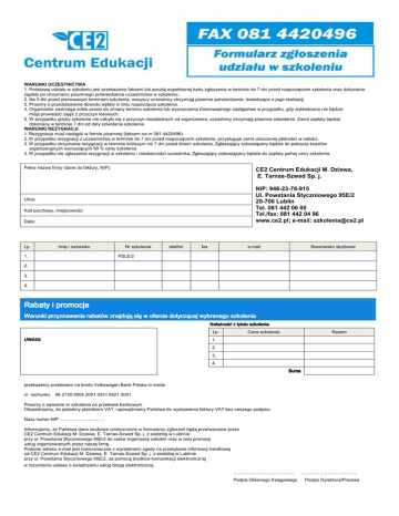 WARUNKI UCZESTNICTWA 1. Podstawą udziału w szkoleniu jest przekazanie faksem lub pocztą wypełnionej karty zgłoszenia w terminie do 7 dni przed rozpoczęciem szkolenia oraz dokonanie zapłaty po otrzymaniu pisemnego potwierdzenia uczestnictwa w szkoleniu. 2. Na 5 dni przed planowanym terminem szkolenia, wszyscy uczestnicy otrzymują pisemne potwierdzenie, świadczące o jego realizacji. 3. Prosimy o przedstawienie dowodu wpłaty w dniu rozpoczęcia szkolenia. 4. Organizator zastrzega sobie prawo do zmiany terminu szkolenia lub wyznaczenia równoważnego zastępstwa w przypadku, gdy wykładowca nie będzie mógł prowadzić zajęć z przyczyn losowych. 5. W przypadku gdyby szkolenie nie odbyło się z przyczyn niezależnych od organizatora, uczestnicy otrzymają pisemne odwołanie. Zwrot zapłaty będzie dokonany w terminie 7 dni od daty odwołania szkolenia. WARUNKI REZYGNACJI 1. Rezygnacja musi nastąpić w formie pisemnej (faksem na nr 081 4420496). 2. W przypadku rezygnacji z uczestnictwa w terminie do 7 dni przed rozpoczęciem szkolenia, przysługuje zwrot uiszczonej płatności w całości. 3. W przypadku otrzymania rezygnacji w terminie krótszym niż 7 dni przed dniem szkolenia, Zgłaszający zobowiązany będzie do pokrycia kosztów organizacyjnych wynoszących 50 % ceny szkolenia. 4. W przypadku nie zgłoszenia rezygnacji w szkoleniu i nieobecności uczestnika, Zgłaszający zobowiązany będzie do zapłaty pełnej ceny szkolenia. Pełna nazwa firmy (dane do faktury, NIP): CE2 Centrum Edukacji M. Dziewa, E. Tarnas-Szwed Sp. j. NIP: 946-23-78-915 Ul. Powstania Styczniowego 95E/2 20-706 Lublin Tel. 081 442 06 00 Tel./fax: 081 442 04 96 www.ce2.pl; e-mail: [email protected] Ulica: Kod pocztowy, miejscowość: Data: Lp. Imię i nazwisko 1. Nr szkolenia telefon fax e-mail Stanowisko służbowe PSLE/2 2. 3. 4. Rabaty i promocje Warunki przyznawania przyznawania rabatów znajdują się w ofercie dotyczącej wybranego szkolenia Należność z tytułu szkolenia Lp. UWAGI: Cena szkolenia Razem 1. 2. 3. 4. Suma przekażemy przelewem na konto Volkswagen Bank Polska nr konta nr rachunku 96 2130 0004 2001 0251 8421 0001 Prosimy o wpisanie nr szkolenia na przelewie bankowym Oświadczamy, że jesteśmy płatnikiem VAT i upoważniamy Państwa do wystawienia faktury VAT bez naszego podpisu. Nasz numer NIP .................................. Informujemy, że Państwa dane osobowe umieszczone w formularzu zgłoszeń będą przetwarzane przez CE2 Centrum Edukacji M. Dziewa, E. Tarnas-Szwed Sp. j. z siedzibą w Lublinie przy ul. Powstania Styczniowego 95E/2 do celów organizacji szkoleń oraz w celu promocji usług organizowanych przez naszą firmę. Podanie adresu e-mail jest równoznaczne z wyrażeniem zgody na przesyłanie informacji handlowej od CE2 Centrum Edukacji M. Dziewa, E. Tarnas-Szwed Sp. j. z siedzibą w Lublinie przy ul. Powstania Styczniowego 95E/2, za pomocą środków komunikacji elektronicznej w rozumieniu ustawy o świadczeniu usług drogą elektroniczną. ………………………………… Podpis Głównego Księgowego ……………………………… Podpis Dyrektora/Prezesa