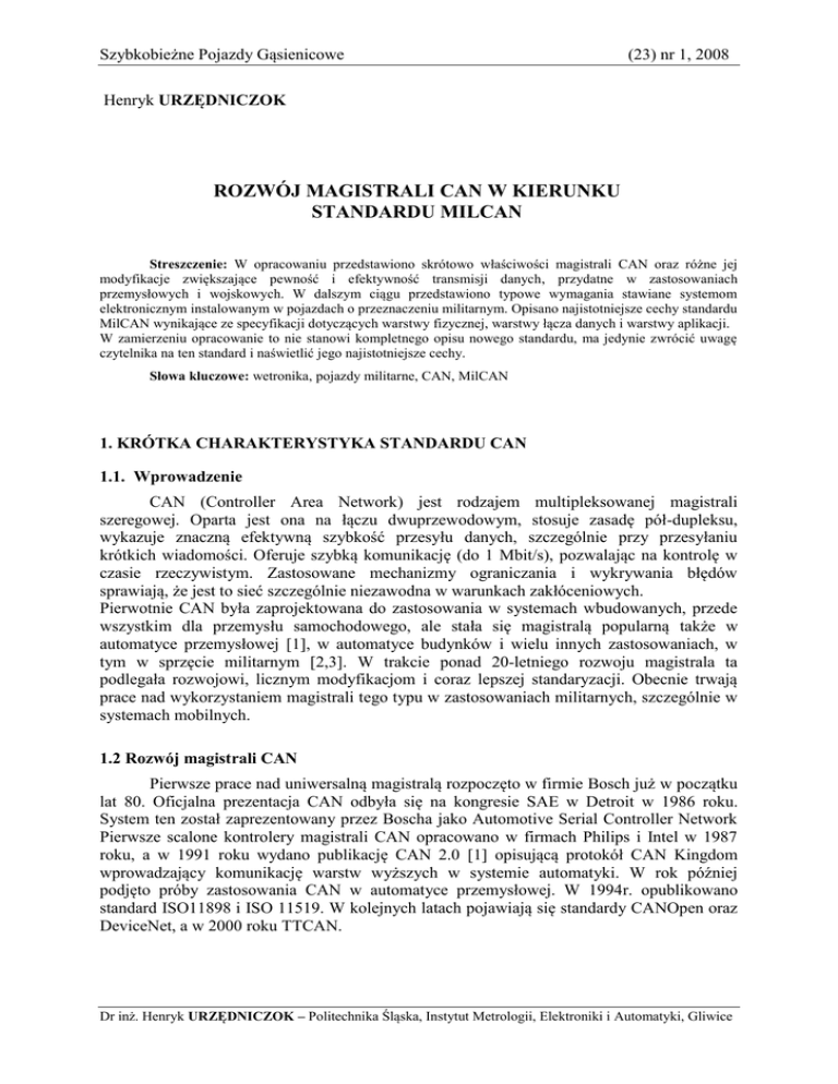 Szybkobieżne Pojazdy Gąsienicowe (23) nr 1, 2008 Henryk URZĘDNICZOK ROZWÓJ MAGISTRALI CAN W KIERUNKU STANDARDU MILCAN Streszczenie: W opracowaniu przedstawiono skrótowo właściwości magistrali CAN oraz różne jej modyfikacje zwiększające pewność i efektywność transmisji danych, przydatne w zastosowaniach przemysłowych i wojskowych. W dalszym ciągu przedstawiono typowe wymagania stawiane systemom elektronicznym instalowanym w pojazdach o przeznaczeniu militarnym. Opisano najistotniejsze cechy standardu MilCAN wynikające ze specyfikacji dotyczących warstwy fizycznej, warstwy łącza danych i warstwy aplikacji. W zamierzeniu opracowanie to nie stanowi kompletnego opisu nowego standardu, ma jedynie zwrócić uwagę czytelnika na ten standard i naświetlić jego najistotniejsze cechy. Słowa kluczowe: wetronika, pojazdy militarne, CAN, MilCAN 1. KRÓTKA CHARAKTERYSTYKA STANDARDU CAN 1.1. Wprowadzenie CAN (Controller Area Network) jest rodzajem multipleksowanej magistrali szeregowej. Oparta jest ona na łączu dwuprzewodowym, stosuje zasadę pół-dupleksu, wykazuje znaczną efektywną szybkość przesyłu danych, szczególnie przy przesyłaniu krótkich wiadomości. Oferuje szybką komunikację (do 1 Mbit/s), pozwalając na kontrolę w czasie rzeczywistym. Zastosowane mechanizmy ograniczania i wykrywania błędów sprawiają, że jest to sieć szczególnie niezawodna w warunkach zakłóceniowych. Pierwotnie CAN była zaprojektowana do zastosowania w systemach wbudowanych, przede wszystkim dla przemysłu samochodowego, ale stała się magistralą popularną także w automatyce przemysłowej [1], w automatyce budynków i wielu innych zastosowaniach, w tym w sprzęcie militarnym [2,3]. W trakcie ponad 20-letniego rozwoju magistrala ta podlegała rozwojowi, licznym modyfikacjom i coraz lepszej standaryzacji. Obecnie trwają prace nad wykorzystaniem magistrali tego typu w zastosowaniach militarnych, szczególnie w systemach mobilnych. 1.2 Rozwój magistrali CAN Pierwsze prace nad uniwersalną magistralą rozpoczęto w firmie Bosch już w początku lat 80. Oficjalna prezentacja CAN odbyła się na kongresie SAE w Detroit w 1986 roku. System ten został zaprezentowany przez Boscha jako Automotive Serial Controller Network Pierwsze scalone kontrolery magistrali CAN opracowano w firmach Philips i Intel w 1987 roku, a w 1991 roku wydano publikację CAN 2.0 [1] opisującą protokół CAN Kingdom wprowadzający komunikację warstw wyższych w systemie automatyki. W rok później podjęto próby zastosowania CAN w automatyce przemysłowej. W 1994r. opublikowano standard ISO11898 i ISO 11519. W kolejnych latach pojawiają się standardy CANOpen oraz DeviceNet, a w 2000 roku TTCAN. Dr inż. Henryk URZĘDNICZOK – Politechnika Śląska, Instytut Metrologii, Elektroniki i Automatyki, Gliwice Henryk URZĘDNICZOK 1.3. Podstawowe cechy i specyfikacja CAN Wymiana danych następuje poprzez przesyłanie ramek wiadomości (komunikatów). W ramce komunikatu CAN brak jest pola adresu odbiorcy wiadomości. Każde urządzenie CAN może śledzić cały ruch na magistrali i decydować czy wiadomość jest dla niego "interesująca", czy też nie. Zawartość wiadomości jest określana przez identyfikator obecny w ramce wiadomości. Stosowany jest mechanizm arbitrażu (i pole arbitrażu) dla określenia priorytetu wiadomości. W praktyce pole arbitrażu bardzo często pełni rolę identyfikatora wiadomości. Pierwotną specyfikacją dotyczącą ramek CAN jest specyfikacja firmy BOSCH. Wersja 2.0 tej specyfikacji dzieli się na dwie części: – standardowy CAN wersja 2.0A (Standard CAN), używa 11 bitów identyfikacji, – rozszerzony CAN wersja 2.0B (Extended CAN), używa 29 bitów identyfikacji. Specyfikacja dotyczy trzech warstw modelu ISO/OSI: warstwy fizycznej, warstwy łącza danych i warstwy aplikacji. Za pomocą CAN można teoretycznie połączyć do 2023 urządzeń w pojedynczej sieci, jednak z powodu ograniczeń sprzętowych praktycznie może połączyć tylko do 110 urządzeń. Dane transmitowane są za pomocą sygnałów na magistrali CAN, która zawiera dwa przewody, CAN-High i CAN-Low, przenoszące napięcia w trybie różnicowym. Warstwa fizyczna nie jest częścią standardu CAN Boscha. Zgodnie ze standardem ISO 11898 impedancja kabla powinna wynosić 120+/-12 omów. Powinna to być skręcona para, ekranowana lub nieekranowana. Trwają również prace nad jednoprzewodowym standardem SAE J2411. Poziomy napięć, jak również inne charakterystyki warstwy fizycznej określone są w standardach ISO 11898. Standard ten odnosi się do szybkich aplikacji i zapewnia transmisję z szybkością do 1 Mbit/s. Standard ISO 11519 ogranicza szybkość do 125 kbit/s. Maksymalna długość magistrali jest zależna od szybkości transmisji. Przy długości 40m, szybkość może wynosić do 1 Mbit/s, natomiast przy długości 6km szybkość musi być zredukowana do 10 kbit/s. 1.4. Modyfikacje CAN TTCAN (Time-Triggered Communication) CAN jest protokołem komunikacyjnym, który wykorzystuje reakcje na zdarzenia. Mechanizm arbitrażu zaimplementowany w tym protokole zapewnia przesyłanie wiadomości w kolejności odpowiadającej jej priorytetowi. W wielu zastosowaniach istnieje jednak potrzeba zapewnienia konkretnego czasu, w którym wiadomości mają być przesyłane oraz przesłania ich nawet wtedy, kiedy magistrala będzie zajęta. Protokół CAN został zatem rozszerzony o standard ISO 11898-4, nazwany TTCAN - Time Triggered CAN. Komunikacja w tym protokole oparta jest na cyklicznym wysyłaniu wiadomości odniesienia (Reference Message) z czasem odniesienia (znacznik czasowy) przez specjalne urządzenie czasowe (zegar). Takie rozwiązanie sprawia, że wykonywanie każdej czynności może być wywołane taktem czasowym zsynchronizowanym w całym systemie. Podczas normalnego trybu arbitrażu możliwe jest wysyłanie bieżących wiadomości. Mechanizm synchronizacji czasowej został również wykorzystany w
