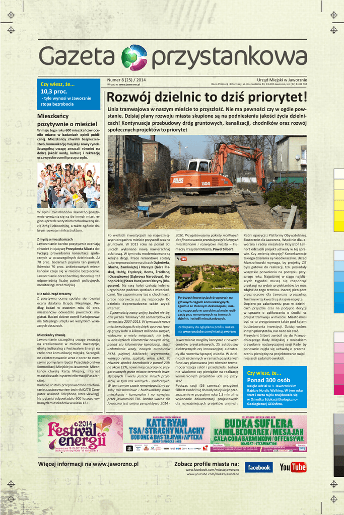 Gazeta Czy wiesz, że... 10,3 proc. - tyle wynosi w Jaworznie stopa bezrobocia Mieszkańcy pozytywnie o mieście! W maju tego roku 600 mieszkańców oceniło miasto w badaniach opinii publicznej. Mieszkańcy chwalili bezpieczeństwo, komunikację miejską i nowy rynek. Szczególną uwagę zwracali również na dobrą jakość wody, kulturę i rekreację oraz wysoko ocenili pracę urzędu. przystankowa Urząd Miejski w Jaworznie Numer 8 (25) / 2014 Więcej na www.jaworzno.pl Biuro Promocji i Informacji, ul. Grunwaldzka 33, 43-600 Jaworzno, tel. (32) 61 81 585 Rozwój dzielnic to dziś priorytet! Linia tramwajowa w naszym mieście to przyszłość. Nie ma pewności czy w ogóle powstanie. Dzisiaj plany rozwoju miasta skupione są na podniesieniu jakości życia dzielnicach! Kontynuacja przebudowy dróg gruntowych, kanalizacji, chodników oraz rozwój społecznych projektów to priorytet W opinii mieszkańców Jaworzno pozytywnie wyróżnia się na tle innych miast regionu przede wszystkim rozbudowaną siecią dróg i obwodnicą, a także ogólnie dobrym rozwojem infrastruktury. Z myślą o mieszkańcach Jaworznianie bardzo pozytywnie oceniają również inicjatywę Prezydenta Miasta dotyczącą prowadzenia konsultacji społecznych w poszczególnych dzielnicach. Aż 70 proc. badanych popiera ten pomysł. Również 70 proc. ankietowanych mieszkańców czuje się w mieście bezpiecznie. Jaworznianie coraz bardziej doceniają też odpowiednią liczbę patroli policyjnych, monitoring i straż miejską. Nie taki Urząd straszny Z pozytywną oceną spotyka się również ocena działania Urzędu Miejskiego. Według badań w ostatnim roku 60 proc. mieszkańców odwiedziło jaworznicki magistrat. Badani dobrze ocenili funkcjonowanie tutejszego urzędu we wszystkich wskazanych obszarach. Mieszkańcy chwalą Jaworznianie szczególną uwagę zwracają na zrealizowane w mieście inwestycje, ofertę kulturalną z Festiwalem Energii na czele oraz komunikację miejską. Szczególne zainteresowanie wraz z coraz to nowszymi pomysłami budzi Przedsiębiorstwo Komunikacji Miejskiej w Jaworznie. Mieszkańcy chwalą Kartę Miejską, internet w autobusach i system Informacji Pasażerskiej. Badanie zostało przeprowadzone telefonicznie z zastosowaniem techniki CATI ( Computer Assisted Telephone Inter-viewing). Na pytania odpowiadało 600 losowo wybranych mieszkańców w wieku 18+ . Po wielkich inwestycjach na najważniejszych drogach w mieście przyszedł czas na gruntówki. W 2013 roku na ponad 50. ulicach wykonano nową nawierzchnię asfaltową. W tym roku modernizowane są kolejne drogi. Prace remontowe zostały już przeprowadzone na ulicach Dąbrówka, Głucha, Zamkniętej i Narcyza (Góra Piasku), Hałdy, Fryderyk, Bema, Źródlanej i Orzeszkowej (Dąbrowa Narodowa), Konopnickiej (Stara Huta) oraz Olszyny (Długoszyn). Na swą kolej czekają kolejne, uzgodnione podczas spotkań z mieszkańcami. Nie zapominamy też o chodnikach, prace naprawcze już się rozpoczęły. Do dzielnic doprowadzono także szybki internet. - Z pewnością nowy unijny budżet nie będzie już tak "łaskawy" dla samorządów jak ten na lata 2007-2013. W tym czasie nasze miasto wzbogaciło się dzięki uporowi i pracy grupy ludzi o kilkaset milionów złotych, widoczne w wielu miejscach, nie tylko w dziesiątkach kilometrów nowych dróg, ponad stu kilometrów kanalizacji, stacji uzdatniania wody, nowych autobusów PKM, pięknej biblioteki, wyremontowanego rynku, szpitala, wielu szkół. To również spadek bezrobocia z ponad 20% na około 12%, nowe miejsca pracy na przygotowanych przez miasto terenach inwestycyjnych i wielu jeszcze innych projektów, w tym tak ważnych - społecznych. W tym samym czasie remontowaliśmy zasoby mieszkaniowe i budowaliśmy nowe mieszkania - komunalne i na wynajem przez jaworznicki TBS. Bardzo ważna dla Jaworzna jest unijna perspektywa 2014 - 2020. Przygotowujemy pakiety możliwych do sfinansowania przedsięwzięć służących mieszkańcom i rozwojowi miasta – tłumaczy Prezydent Miasta, Paweł Silbert. Po dużych inwestycjach drogowych na głównych ciągach komunikacyjnych, zgodnie ze złożonym deklaracjami, miasto rozpoczęło w szerokim zakresie realizację prac remontowych na terenach dzielnic i osiedli mieszkaniowych. Zachęcamy do oglądania profilu miasta na www.youtube.com/miastojaworzno Jaworznianie mogliby korzystać z nowych centrów przystankowych, 25 autobusów elektrycznych czy innowacyjnej autostrady dla rowerów łączącej osiedla. W dzielnicach ościennych w ramach pozyskanych funduszy planowana jest również termomodernizacja szkół i przedszkola. Jednak nie wiadomo czy pieniądze na realizację wymienionych projektów uda się pozyskać. Podczas sesji (26 czerwca) prezydent Silbert zwrócił się do Rady Miejskiej o przeznaczenie w przyszłym roku 1,3 mln zł na wykonanie dokumentacji projektowych dla najważniejszych projektów unijnych. Radni opozycji z Platformy Obywatelskiej, Skutecznie dla Jaworzna, Wspólnie dla Jaworzna i radny niezależny Krzysztof Lehnort odrzucili projekt uchwały w tej sprawie. Czy zmienią decyzję? Konsekwencje takiego działania są nieodwracalne. Urząd Marszałkowski wymaga, by projekty ZIT były gotowe do realizacji, tzn. posiadały wszystkie pozwolenia na początku przyszłego roku. Najpóźniej w ciągu najbliższych tygodni muszą się rozpocząć przetargi na wybór projektantów, by móc zdążyć do tego terminu. Inaczej pieniądze przeznaczone dla Jaworzna przepadną. Terminy w tej kwestii są skrajnie napięte. Dopiero po zakończeniu prac w dzielnicach przyjdzie czas na podjęcie decyzji w sprawie o aplikowaniu o środki na projekt tramwaju w mieście. Miasto musi być na to przygotowane także pod kątem budżetowania inwestycji. Dzisiaj wobec innych priorytetów, nas na to nie stać. Prezydent Silbert zwrócił się do Przewodniczącego Rady Miejskiej z wnioskiem o zwołanie nadzwyczajnej sesji Rady, by ponownie zajęła się uchwa