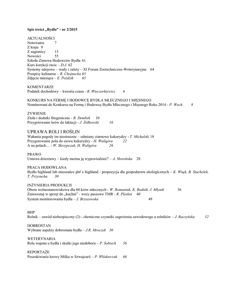 Spis treści „Bydło” - nr 2/2015 AKTUALNOŚCI Notowania 7 Z kraju 9 Z zagranicy 15 Nowości 55 Szkoła Zimowa Hodowców Bydła 61 Kurs korekcji racic – D.J. 62 Systemy udojowe – wady i zalety – XI Forum Zootechniczno-Weterynaryjne 64 Przepisy kulinarne – R. Chojnacka 65 Zdjęcie miesiąca – E. Poździk 65 KOMENTARZE Podatek dochodowy – kwestia czasu - R. Wieczorkiewicz 6 KONKURS NA FERMĘ I HODOWCĘ BYDŁA MLECZNEGO I MIĘSNEGO Nominowani do Konkursu na Fermę i Hodowcę Bydła Mlecznego i Mięsnego Roku 2014 - P. Woch ŻYWIENIE Zioła i dodatki fitogeniczne - R. Dembek 10 Przygotowanie krów do laktacji - J. Żółkowski 8 16 UPRAWA ROLI I ROŚLIN Wahania pogody im niestraszne – odmiany ziarnowe kukurydzy - T. Michalski 18 Przygotowanie pola do siewu kukurydzy - H. Waligóra 22 A na polach… - W. Skrzypczak, H. Waligóra 26 PRAWO Umowa dzierżawy – kiedy można ją wypowiedzieć? – A. Słowińska 28 PRACA HODOWLANA Bydło highland lub mieszańce phf x highland - propozycja dla gospodarstw ekologicznych – K. Wnęk, B. Stachelek, T. Przysucha 30 INŻYNIERIA PRODUKCJI Obora wolnostanowiskowa dla 60 krów mlecznych - W. Romaniuk, K. Rudnik, J. Młynik Zainwestuj w sprzęt do „kuchni” - wozy paszowe TMR - R. Pleskot 40 System monitorowania bydła – J. Brzozowska 49 36 BHP Rolnik – zawód niebezpieczny (2) - chemiczne czynniki zagrożenia zawodowego u rolników – J. Raczyńska DOBROSTAN Wybrane aspekty dobrostanu bydła – J.R. Mroczek 50 WETERYNARIA Rola wapnia u bydła i skutki jego niedoboru – P. Sobiech 56 REPORTAŻE Poszukiwania krowy Milka w Szwajcarii – P. Włódarczak 66 52