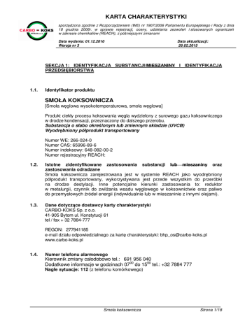 KARTA CHARAKTERYSTYKI sporządzona zgodnie z Rozporządzeniem (WE) nr 1907/2006 Parlamentu Europejskiego i Rady z dnia 18 grudnia 2006r. w sprawie rejestracji, oceny, udzielania zezwoleń i stosowanych ograniczeń w zakresie chemikaliów (REACH), z późniejszymi zmianami Data wydania: 01.12.2010 Wersja nr 3 Data aktualizacji: 26.02.2015 SEKCJA 1: IDENTYFIKACJA SUBSTANCJI/MIESZANINY I IDENTYFIKACJA PRZEDSIĘBIORSTWA 1.1. Identyfikator produktu SMOŁA KOKSOWNICZA [Smoła węglowa wysokotemperaturowa, smoła węglowa] Produkt ciekły procesu koksowania węgla wydzielony z surowego gazu koksowniczego w drodze kondensacji, przeznaczony do dalszego przerobu. Substancja o słabo określonym lub zmiennym składzie (UVCB) Wyodrębniony półprodukt transportowany Numer WE: 266-024-0 Numer CAS: 65996-89-6 Numer indeksowy: 648-082-00-2 Numer rejestracyjny REACH: 1.2. Istotne zidentyfikowane zastosowania substancji lub mieszaniny oraz zastosowania odradzane Smoła koksownicza zarejestrowana jest w systemie REACH jako wyodrębniony półprodukt transportowany, wykorzystywana jest przede wszystkim do przeróbki na drodze destylacji. Inne potencjalne kierunki zastosowania to: reduktor w metalurgii, czynnik do zwilżania wsadu węglowego w koksownictwie oraz paliwo do przemysłowych źródeł energii (indywidualnie lub w mieszaninie z innymi olejami). 1.3. Dane dotyczące dostawcy karty charakterystyki CARBO-KOKS Sp. z o.o. 41-905 Bytom ul. Konstytucji 61 tel / fax + 32 7884-777 REGON: 277941185 e-mail działu odpowiedzialnego za kartę charakterystyki: [email protected] www.carbo-koks.pl 1.4. Numer telefonu alarmowego Kierownik zmiany całodobowo tel.: 691 956 040 Dodatkowe informacje w godzinach 0700 do 1500 tel.: +32 7884 777 Nagłe sytuacje: 112 (z telefonu komórkowego) Smoła koksownicza Strona 1/18 KARTA CHARAKTERYSTYKI sporządzona zgodnie z Rozporządzeniem (WE) nr 1907/2006 Parlamentu Europejskiego i Rady z dnia 18 grudnia 2006r. w sprawie rejestracji, oceny, udzielania zezwoleń i stosowanych ograniczeń w zakresie chemikaliów (REACH), z późniejszymi zmianami Data wydania: 01.12.2010 Wersja nr 3 Data aktualizacji: 26.02.2015 SEKCJA 2: IDENTYFIKACJA ZAGROŻEŃ 2.1 Klasyfikacja substancji lub mieszaniny KLASYFIKACJA ZGODNA Z ROZPORZĄDZENIEM (WE) NR 1272/2008 Skin Sens. 1 Muta. 1B Carc. 1A Repr. 1B Aquatic Chronic 3 Działanie uczulające na skórę, kategoria 1 Działanie mutagenne na komórki rozrodcze, kategoria 1B Rakotwórczość, kategoria 1A Działanie szkodliwe na rozrodczość, kategoria 1B Stwarzające zagrożenie dla środowiska wodnego – zagrożenie przewlekłe, kategoria 3 H317 H340 H350 H360 H412 KLASYFIKACJA ZGODNA Z DYREKTYWĄ NR 67/548/EWG Substancja uczulająca Substancja rakotwórcza kat. 1 Substancja działająca szkodliwie na rozrodczość, kat. 2 Substancja mutagenna kat. 2 Substancja niebezpieczna dla środowiska (Xi, R43) (T, R45) (T, R60, R61) (T, R46) (R52/53) Rodzaje zagrożenia: Może powodować uczulenie w kontakcie ze skórą R45 Może powodować raka R46 Może powodować dziedziczne wady genetyczne R60 Może upośledzać płodność R61 Może działać szkodliwie na dziecko w łonie matki R52/53 Działa szkodliwie na organizmy wodne; może powodować długo utrzymujące się niekorzystne zmiany w środowisku wodnym R43 2.2 Elementy oznakowania Piktogramy określające rodzaj zagrożenia: GHS 07 GHS 08 Hasło ostrzegawcze: Niebezpieczeństwo Zwroty określające rodzaj zagrożenia: H317 Może powodować reakcję alergiczną skóry. H340 Może powodować wady genetyczne. H350 Może powodować raka. H360 Może działać szkodliwie na płodność lub na dziecko w łonie matki. H412 Działa szkodliwie na organizmy wodne, powodując długotrwałe skutki. Smoła koksownicza Strona 2/18 KARTA CHARAKTERYSTYKI sporządzona zgodnie z Rozporządzeniem (WE) nr 1907/2006 Parlamentu Europejskiego i Rady z dnia 18 grudnia 2006r. w sprawie rejestracji, oceny, udzielania zezwoleń i stosowanych ograniczeń w zakresie chemikaliów (REACH), z późniejszymi zmianami Data wydania: 01.12.2010 Wersja nr 3 Data aktualizacji: 26.02.2015 Zwroty wskazujące środki ostrożności: Zapobieganie P260 Nie wdychać pyłu/dymu/gazu/mgły/rozpylonej cieczy. P273 Unikać uwolnienia do środowiska. P281 Stosować wymagane środki ochrony indywidualnej. Reagowanie P302 + P352 W PRZYPADKU KONTAKTU ZE SKÓRĄ: Umyć dużą ilością wody z mydłem. P308 + P313 W przypadku narażenia lub styczności: Zasięgnąć porady/zgłosić się pod opiekę lekarza. P333 + P313 W przypadku wystąpienia podrażnienia skóry lub wysypki: Zasięgnąć porady/zgłosić się pod opiekę lekarza. P363 Wyprać zanieczyszczoną odzież przed ponownym użyciem. P391 Zebrać wyciek. Przechowywanie P405 Przechowywać pod zamknięciem. Usuwanie P501 Zawartość/pojemnik usuwać zgodnie z obowiązującymi lokalnymi/regionalnymi/międzynarodowymi przepisami. 2.3 Inne zagrożenia Działanie rakotwórcze i mutagenne jak również drażniące u ludzi potęguje się w podwyższonej temperaturze i przy ekspozycji słonecznej. Może powodować podrażnienia oczu i układu oddechowego. Zalecany zakres temperatury podczas transportu 30 – 55oC. Substancja zarejestrowana jest w systemie REACH jako wyodrębniony półprodukt transportowany, w związku z powyższym ocena czy substancja należy do kategorii PBT i vPvB nie jest wymagana. SEKCJA 3: SKŁAD/INFORMACJA O SKŁADNIKACH 3.1 Substancje Smoła koksownicza stanowi substancję o słabo określonym lub zmiennym składzie (UVCB). Mieszaninę tworzą głównie węglowodory o strukturze aromatycznej, w tym związki z grupy wielopierścieniowych węglowodorów aromatycznych (WWA). Klasyfikacja Niebezpieczne składniki Nr WE Nr CAS Ilość [% wag.] Naftalen 202-049-5 91-20-3 9,0 -11,0 Carc. Cat. 3; R40 Xn; R22 N; R50-53 Dyrektywa nr 67/548/EWG Benzo(a)piren 200-028-5 50-32-8 0,1 - 0,5 Carc. Cat. 2; R45 Muta. Cat. 2; R46 Repr. Cat. 2; R60-61 R43 N; R50-53 Benzo(a)antracen 200-280-6 0,