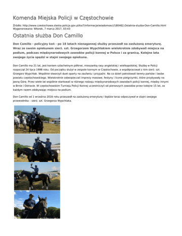 Komenda Miejska Policji w Częstochowie Źródło: http://www.czestochowa.slaska.policja.gov.pl/ka7/informacje/wiadomosci/180462,Ostatnia-sluzba-Don-Camillo.html Wygenerowano: Wtorek, 7 marca 2017, 03:43 Ostatnia służba Don Camillo Don Camillo - policyjny koń - po 18 latach nienagannej służby przeszedł na zasłużoną emeryturę. Wraz ze swoim opiekunem sierż. szt. Grzegorzem Wypchlakiem wielokrotnie zdobywali miejsca na podium, podczas międzynarodowych zawodów policji konnej w Polsce i za granicą. Kolejne lata swojego życia spędzi w stajni swojego opiekuna. Don Camillo ma 21 lat, jest koniem szlachetnym półkrwi, mieszanką rasy angielskiej i wielkopolskiej. Służbę w Policji rozpoczął 24 lipca 1998 roku. Od początku służył w zespole konnym w Częstochowie, a współpracował z nim sierż. szt. Grzegorz Wypchlak. Wspólnie stworzyli duet oparty na zaufaniu i przyjaźni. Na co dzień patrolowali tereny parków i lasów powiatu częstochowskiego. Wielokrotnie zabezpieczali imprezy masowe, festyny i liczne pielgrzymki, które przybywały na Jasną Górę. Przez wiele lat wspólnie startowali w różnego rodzaju międzynarodowych zawodach policji konnej, między innymi w Brnie i Ostravie. W częstochowskim Turnieju Policji Konnej uczestniczyli od pierwszych zawodów przez kolejne 15 lat, za każdym razem zdobywając miejsca na podium. Don Camillo od 1 września 2016 roku przeszedł na zasłużoną emeryturę i będzie teraz odpoczywał w stajni swojego przewodnika – sierż. szt. Grzegorza Wypchlaka. Ocena: 5/5 (3) Tweetnij