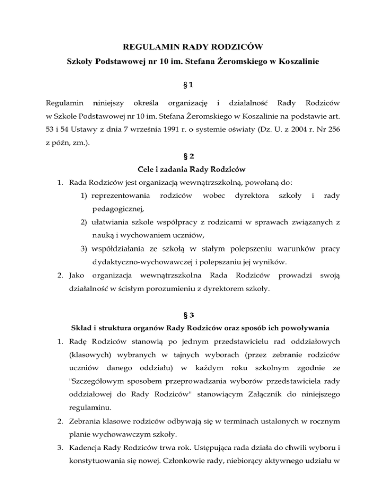 REGULAMIN RADY RODZICÓW Szkoły Podstawowej nr 10 im. Stefana Żeromskiego w Koszalinie §1 Regulamin niniejszy określa organizację i działalność Rady Rodziców w Szkole Podstawowej nr 10 im. Stefana Żeromskiego w Koszalinie na podstawie art. 53 i 54 Ustawy z dnia 7 września 1991 r. o systemie oświaty (Dz. U. z 2004 r. Nr 256 z późn, zm.). §2 Cele i zadania Rady Rodziców 1. Rada Rodziców jest organizacją wewnątrzszkolną, powołaną do: 1) reprezentowania rodziców wobec dyrektora szkoły i rady pedagogicznej, 2) ułatwiania szkole współpracy z rodzicami w sprawach związanych z nauką i wychowaniem uczniów, 3) współdziałania ze szkołą w stałym polepszeniu warunków pracy dydaktyczno-wychowawczej i polepszaniu jej wyników. 2. Jako organizacja wewnątrzszkolna Rada Rodziców prowadzi swoją działalność w ścisłym porozumieniu z dyrektorem szkoły. §3 Skład i struktura organów Rady Rodziców oraz sposób ich powoływania 1. Radę Rodziców stanowią po jednym przedstawicielu rad oddziałowych (klasowych) wybranych w tajnych wyborach (przez zebranie rodziców uczniów danego oddziału) w każdym roku szkolnym zgodnie ze "Szczegółowym sposobem przeprowadzania wyborów przedstawiciela rady oddziałowej do Rady Rodziców" stanowiącym Załącznik do niniejszego regulaminu. 2. Zebrania klasowe rodziców odbywają się w terminach ustalonych w rocznym planie wychowawczym szkoły. 3. Kadencja Rady Rodziców trwa rok. Ustępująca rada działa do chwili wyboru i konstytuowania się nowej. Członkowie rady, niebiorący aktywnego udziału w pracach rady, mogą być przez właściwe zebranie klasowe rodziców lub samą radę odwołani przed upływem kadencji. Na miejsce ustępujących lub odwołanych członków rady powinni być powołani nowi członkowie przez klasowe zebrania rodziców. 4. Członkowie Rady Rodziców i jej organów pełnią swoje funkcje honorowo. 5. Rada rodziców na pierwszym posiedzeniu organizacyjnym wybiera prezydium w skład, którego wchodzi przewodniczący i jego zastępca oraz Ponadto wybierana sekretarz. jest też komisja rewizyjna, składająca się z trzech osób. Wybory dokonywane są w sposób tajny lub jawny spośród przedstawicieli rad oddziałowych, którzy ustalają podczas posiedzenia sposób przeprowadzenia wyborów. 6. Prezydium Rady Rodziców opracowuje plan działalności na dany rok szkolny wraz z planem finansowo-gospodarczym oraz ramowe wytyczne do pracy rad klasowych rodziców. 7. Zebrania prezydium Rady Rodziców szkoły odbywają się w miarę potrzeb, nie rzadziej niż cztery razy w roku. 8. Uchwały wszystkich zebrań zapadają większością głosów. 9. Dokumentacja z pracy Rady Rodziców przechowywana jest w kancelarii szkoły. §4 Zasady działalności gospodarczo-finansowej Rady Rodziców 1. Fundusze Rady Rodziców szkoły mogą być używane na określone cele. Dysponuje nimi prezydium na podstawie preliminarza na dany rok szkolny. 2. Rady Rodziców upoważnia Prezydium do podjęcia decyzji o wydatkowaniu ze środków nie zadeklarowanych w preliminarzu na określone cele, a będących w dyspozycji Rady, kwoty nie przekraczającej równowartości 600 zł, a w równowartości przypadku Przewodniczącej Rady nie przekraczającej 200 zł na pokrycie pilnych celów nie określonych w preliminarzu Funduszu Rodziców, a wynikających z bieżącej działalności Szkoły . 3. Wszelkie pomoce i urządzenia zakupione z funduszy Rady Rodziców szkoły stają się własnością szkoły i podlegają inwentaryzacji. 4. Fundusze Rady Rodziców powstają z dobrowolnych składek rodziców, dochodów osiąganych z imprez organizowanych przez radę, darowizn i dotacji. 5. Zbieraniem funduszy z dobrowolnych składek zajmują się skarbnicy klasowi. 6. Rada Rodziców prowadzi własną rachunkowość wg przepisów regulujących sposób rachunkowości 7. Komisja rewizyjna powinna, co najmniej raz w roku sprawdzić wykonanie planu finansowo-gospodarczego, prowadzenie rachunkowości, zgodność obrotów i sald na rachunku bankowym Rady Rodziców z dokumentami, celowość i prawidłowość wydatków Rady Rodziców. §5 Kompetencje Rady Rodziców 1. Rada Rodziców może występować do dyrektora, organu prowadzącego szkołę, organu sprawującego nadzór pedagogiczny z wnioskami i opiniami we wszystkich sprawach szkoły. 2. Do kompetencji Rady Rodziców należy: 1) Uchwalanie w porozumieniu z radą pedagogiczną: a) programu wychowawczego szkoły obejmującego wszystkie treści i działania o charakterze wychowawczym skierowane do uczniów, realizowanego przez nauczycieli, b) programu profilaktyki dostosowanego do potrzeb rozwojowych uczniów oraz potrzeb danego środowiska, obejmującego wszystkie treści i działania o charakterze profilaktycznym skierowane do uczniów, nauczycieli i rodziców. 2) Uchwalanie regulaminu swojej działalności. 3) Opiniowanie programu i harmonogramu poprawy efektywności kształcenia lub wychowania szkoły. 4) Opiniowanie projektu planu finansowego składanego przez dyrektora szkoły. 5) Opiniowanie wprowadzenia do szkolnego planu nauczania dodatkowych zajęć edukacyjnych. 6) Opiniowanie podjęcia działalności w szkole stowarzyszeń lub innych organizacji. 7) Wnioskowanie o wprowadzenie lub zniesienie obowiązku noszenia przez uczniów na terenie szkoły jednolitego stroju. 8) Zgoda (na wniosek innych organów szkoły) na wprowadzenie obowiązku noszenia na terenie szkoły jednolitego stroju. 9) Uzgodnienie wzoru jednolitego stroju do noszenia przez uczniów na terenie szkoły. 10) Opiniowanie pracy nauczyciela do ustalenia oceny dorobku zawodowego nauczyciela za okres stażu. 11) Propozycje wskazujące formy realizacji dwóch godzin obowiązkowych zajęć wychowania fizycznego. 12) Uczestniczenie w pracach komisji konkursowej wyłaniającej dyrektora szkoły, przedstawicieli rodziców typuje prezydium Rady Rodziców. 13) Wnioskowanie o dokonanie oceny pracy nauczyciela. 14) Opiniowanie dodatkowych dni