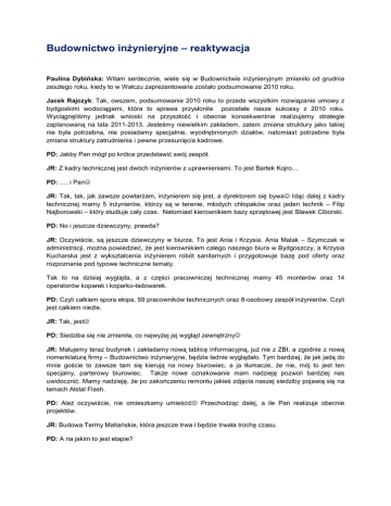 Budownictwo inżynieryjne – reaktywacja Paulina Dybińska: Witam serdecznie, wiele się w Budownictwie inżynieryjnym zmieniło od grudnia zeszłego roku, kiedy to w Wałczu zaprezentowane zostało podsumowanie 2010 roku. Jacek Rajczyk: Tak, owszem, podsumowanie 2010 roku to przede wszystkim rozwiązanie umowy z bydgoskimi wodociągami, która to sprawa przysłoniła pozostałe nasze sukcesy z 2010 roku. Wyciągnęliśmy jednak wnioski na przyszłość i obecnie konsekwentnie realizujemy strategie zaplanowaną na lata 2011-2013. Jesteśmy niewielkim zakładem, zatem zmiana struktury jako takiej nie była potrzebna, nie posiadamy specjalnie, wyodrębnionych działów, natomiast potrzebne była zmiana struktury zatrudnienia i pewne przesunięcia kadrowe. PD: Jakby Pan mógł po krótce przedstawić swój zespół. JR: Z kadry technicznej jest dwóch inżynierów z uprawnieniami. To jest Bartek Kojro… PD: …. i Pan☺ JR: Tak, tak, jak zawsze powtarzam, inżynierem się jest, a dyrektorem się bywa☺ Idąc dalej z kadry technicznej mamy 5 inżynierów, którzy są w terenie, młodych chłopaków oraz jeden technik – Filip Najborowski – który studiuje cały czas. Natomiast kierownikiem bazy sprzętowej jest Sławek Ciborski. PD: No i jeszcze dziewczyny, prawda? JR: Oczywiście, są jeszcze dziewczyny w biurze. To jest Ania i Krzysia. Ania Malak – Szymczak w administracji, można powiedzieć, że jest kierownikiem całego naszego biura w Bydgoszczy, a Krzysia Kucharska jest z wykształcenia inżynierem robót sanitarnych i przygotowuje bazę pod oferty oraz rozpoznanie pod typowe techniczne tematy. Tak to na dzisiaj wygląda, a z części pracowniczej technicznej mamy 45 monterów oraz 14 operatorów koparek i koparko-ładowarek. PD: Czyli całkiem spora ekipa, 59 pracowników technicznych oraz 8-osobowy zespół inżynierów. Czyli jest całkiem nieźle. JR: Tak, jest☺ PD: Siedziba się nie zmieniła, co najwyżej jej wygląd zewnętrzny☺ JR: Malujemy teraz budynek i zakładamy nową tablicę informacyjną, już nie z ZBI, a zgodnie z nową nomenklaturą firmy – Budownictwo inżynieryjne, będzie ładnie wyglądało. Tym bardziej, że jak jadą do mnie goście to zawsze tam się kierują na nowy biurowiec, a ja tłumacze, że nie, mój to jest ten specjalny, parterowy biurowiec. Także nowe oznakowanie mam nadzieję pozwoli bardziej nas uwidocznić. Mamy nadzieję, że po zakończeniu remontu jakieś zdjęcia naszej siedziby pojawią się na łamach Alstal Flash. PD: Ależ oczywiście, nie omieszkamy umieścić☺ Przechodząc dalej, a ile Pan realizuje obecnie projektów. JR: Budowa Termy Maltańskie, która jeszcze trwa i będzie trwała trochę czasu. PD: A na jakim to jest etapie? JR: Zaawansowanie robót podstawowych to jest 98%, więc jest praktycznie skończona. Jesteśmy na etapie robót dodatkowych, które są na bieżąco cały czas wprowadzane zmiany, modyfikowane projekty. Budowa jest w toku, jest etap wykończenia. Samych naszych instalacji jest tam 11 km. No i sieci między obiektowe na budowie Włocławku dla Łukasza Tkaczyka. PD: Termy w Poznaniu i basen we Włocławku to zlecenie wew. dla Generalnego Wykonawstwa Budownictwa ogólnego, a co z zewnętrznymi? JR: Kolejna budowa to Grudziądz, ostatnio można było ją nawet obejrzeć w telewizji. W związku z budową autostrady A1, również naszą budowę wizytował niedawno Minister Infrastruktury, co odbiło się również szerokim echem w mediach, jak to każda wizyta ministra. Poza tym ostatnio na naszej budowie udzielał wywiadu Prezydent Grudziądza, relacje i naszą budowę można obejrzeć w internecie. PD: Kiedy kończymy? JR: Umowa formalnie kończy się 30 czerwca, ale mamy podpisany aneks ze względu na rozbieżności stanu bieżącego z projektowym, chodzi dokładnie o kolizje trasy kanalizacji z drzewami, więc prace potrwają jeszcze dwa miesiące. PD: Jakieś nowe tematy? JR: Nowy temat to temat za 6,5 mln zł netto, zaczynamy na początku lipca i jest to budowa sieci wodociągowej dla czterech wiosek w gminie Grudziądz, położymy 56 km wodociągów. Mamy w Polsce jeszcze wiele takich miejsc, gdzie nie ma jeszcze wodociągów, a cały czas są studzienki☺ Czekamy również na kila rozstrzygnięć, od początku roku złożyliśmy 41 ofert, wygrywamy nie tyko wew. tematy, ale również zewnętrzne. Zatem, jak na tam małą ekipę administracyjno-techniczną, przypomina w samym biurze mamy tylko dwie osoby, uważam ten wynik za naprawdę imponujący. PD: Zatem zgodnie z założoną strategią odchodzą Państwo od realizacji jednego dużego projektu JR: Tak, realizacja jednego dużego projektu, angażuje wszystkie nasze zasoby i nie pozwala na realizację żadnych innych zleceń, co grozi – jak pokazały zeszłoroczne doświadczenia – sporymi kłopotami i przestojem, w przypadku, jakichkolwiek problemów z kontraktem. Obecnie skupiamy się na dywersyfikacji źródeł dochodów i zgodnie ze strategią realizujemy kilka mniejszych kontraktów, zarówno wewnętrznych, jak i zewnętrznych. PD: Nie pozostaje mi nic innego, jak pogratulować konsekwencji w działaniu i realizowaniu założonej strategii. JR: Dziękuję bardzo w imieniu swoim i całego zespołu.