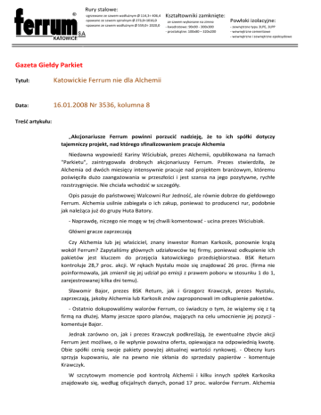 Gazeta Giełdy Parkiet Katowickie Ferrum nie dla Alchemii 16.01