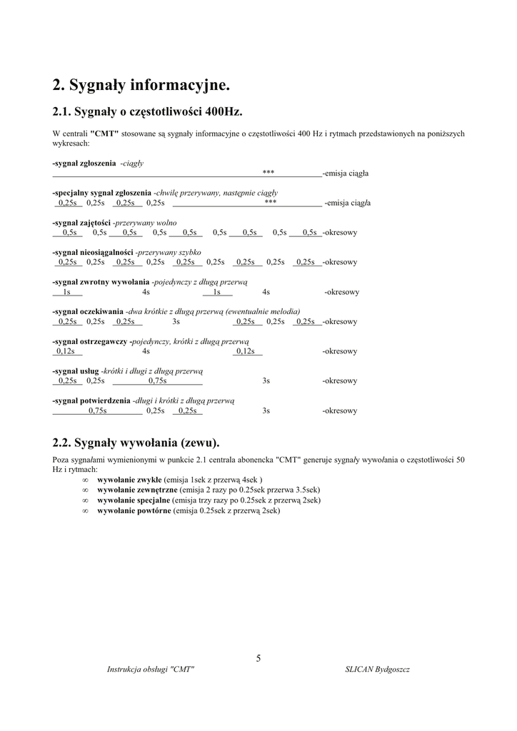 W centrali "CMT" stosowane s& sygna$y informacyjne o cz%stotliwo#ci 400 Hz i rytmach przedstawionych na poni"szych