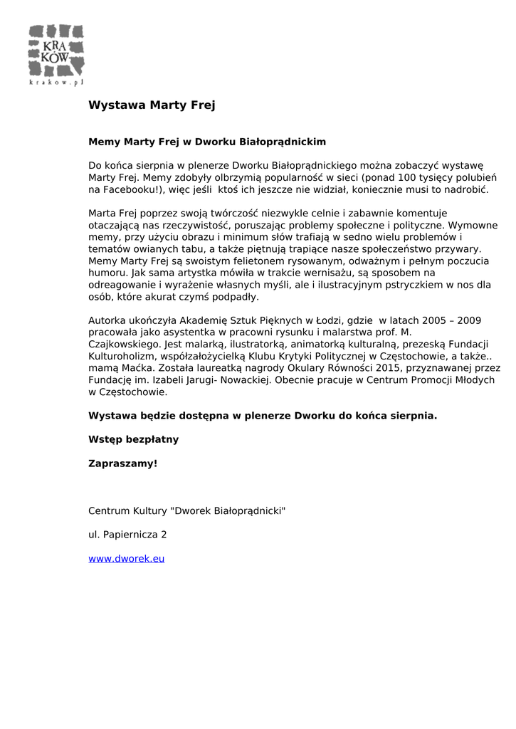 Wystawa Marty Frej Memy Marty Frej w Dworku Białoprądnickim Do końca sierpnia w plenerze Dworku Białoprądnickiego można zobaczyć wystawę Marty Frej. Memy zdobyły olbrzymią popularność w sieci (ponad 100 tysięcy polubień na Facebooku!), więc jeśli ktoś ich jeszcze nie widział, koniecznie musi to nadrobić. Marta Frej poprzez swoją twórczość niezwykle celnie i zabawnie komentuje otaczającą nas rzeczywistość, poruszając problemy społeczne i polityczne. Wymowne memy, przy użyciu obrazu i minimum słów trafiają w sedno wielu problemów i tematów owianych tabu, a także piętnują trapiące nasze społeczeństwo przywary. Memy Marty Frej są swoistym felietonem rysowanym, odważnym i pełnym poczucia humoru. Jak sama artystka mówiła w trakcie wernisażu, są sposobem na odreagowanie i wyrażenie własnych myśli, ale i ilustracyjnym pstryczkiem w nos dla osób, które akurat czymś podpadły. Autorka ukończyła Akademię Sztuk Pięknych w Łodzi, gdzie w latach 2005 – 2009 pracowała jako asystentka w pracowni rysunku i malarstwa prof. M. Czajkowskiego. Jest malarką, ilustratorką, animatorką kulturalną, prezeską Fundacji Kulturoholizm, współzałożycielką Klubu Krytyki Politycznej w Częstochowie, a także.. mamą Maćka. Została laureatką nagrody Okulary Równości 2015, przyznawanej przez Fundację im. Izabeli Jarugi- Nowackiej. Obecnie pracuje w Centrum Promocji Młodych w Częstochowie. Wystawa będzie dostępna w plenerze Dworku do końca sierpnia. Wstęp bezpłatny Zapraszamy! Centrum Kultury "Dworek Białoprądnicki" ul. Papiernicza 2 www.dworek.eu Powered by TCPDF (www.tcpdf.org)