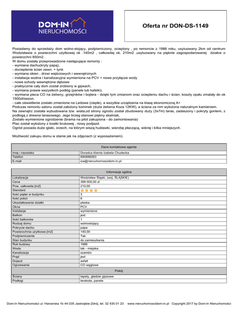 Oferta nr DON-DS-1149 Posiadamy do sprzedaży dom wolno-stojący, podpiwniczony, ocieplony , po remoncie z 1986 roku, usytuowany 2km od centrum Wodzisławia o powierzchni użytkowej ok .140m2 , całkowitej ok. 210m2 ,usytuowany na pięknie zagospodarowanej działce o powierzchni 850m2 . W domu zostały przeprowadzone następujące remonty : - wymiana dachu(kryty papą), - docieplenie ścian zewn. + tynk - wymiana okien , drzwi wejściowych i wewnętrznych - instalacja wodna i kanalizacyjna wymieniona na PCV + nowe przyłącze wody - nowe schody wewnętrzne dębowe - praktycznie cały dom został zrobiony w gipsach, - wymiana prawie wszystkich podłóg (panele lub kafelki). - wymiana pieca CO na żeliwny, grzejników i bojlera - dzięki tym zmianom oraz ociepleniu dachu i ścian, koszty opału zmalały do ok 1500zł/sezon. - całe oświetlenie zostało zmienione na Ledowe (ciepłe), a wszytkie urządzenia na klasę ekonomiczną A+ Podczas remontu salonu został założony kominek (duża żeliwna Koza 12KW), a ściana za nim wyłożona naturalnym kamieniem. Na zewnątrz została wybudowana tzw. wiata,od strony ogrodu został zbudowany duży (3x7m) taras, zadaszony i pokryty gontem, z podłogą z drewna tarasowego. Jego brzeg stanowi piękny skalniak, Zostało wymienione ogrodzenie (brama na pilot zakupiona - do zamontowania) Plac został wyłożony z kostki brukowej , nowy podjazd. Ogród posiada duże iglaki, orzech, na którym wiszą huśtawki, wierzbę płaczącą, wiśnię i kilka mniejszych. Możliwość zakupu domu w stanie jak na zdjęciach (z wyposażeniem). Dane kontaktowe agenta Imię i nazwisko Telefon E-mail Doradca klienta Izabela Chudecka 690886063 [email protected] Informacje ogólne Lokalizacja Cena Pow. całkowita [m2] Standard Ilość pięter w budynku Ilość pokoi Ukształtowanie działki Okna Instalacje Balkon Ilość balkonów Rodzaj domu Pokrycie dachu Powierzchnia użytkowa [m2] Podpiwniczenie Stan budynku Rok budowy Woda Kanalizacja Prąd Dojazd Ogrzewanie Wodzisław Śląski, (woj. ŚLĄSKIE) 399 000,00 zł 210,00 3 6 płaska PCV wymienione jest 1 wolnostojący papa 140,00 Tak do zamieszkania 1986 tak - miejska szambo jest asfalt CO węglowe Pokój Ściany Podłogi tapety, gładzie gipsowe terakota, panele Dom-In Nieruchomości ul. Harcerska 1b 44-335 Jastrzębie-Zdrój, tel. 32 435 01 23 www.nieruchomoscidom-in.pl Copyright 2017 by Dom-In Nieruchomości Oferta nr DON-DS-1149 Kuchnia Typ pomieszczenia Rodzaj kuchni Podłogi widna z zabudową kuchenną terakota Typ pomieszczenia Glazura Ściany Podłogi razem z wc nowego typu glazura terakota Łazienka Dom-In Nieruchomości ul. Harcerska 1b 44-335 Jastrzębie-Zdrój, tel. 32 435 01 23 www.nieruchomoscidom-in.pl Copyright 2017 by Dom-In Nieruchomości