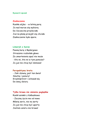 Ryszard Lipczuk Zaskoczona Rzekła sójka: - w letnią porę Ja nad morze się wybiorę Do Szczecina przyleciała Już na plażę przejść się chciała Zaskoczenie było spore. Limeryk o kurze Pewną kurę z Będargowa Strasznie rozbolała głowa Ze zmartwienia spać nie może - Kto mi, kto mi w tym pomoże? Ja już nie chcę być domowa! Perspektywa kreta - Jaki dziwny jest ten świat Smutny i ponury! Krzyknął kret i schował się Do swej dziury. Tylko krowa nie zmienia poglądów Rzekł osiołek z Kołbaskowa: - Zacznę życie me od nowa Mówię serio, nie na żarty Ja już nie chcę być uparty Jestem osioł a nie krowa! Wierszyk ornitologiczny Jak to na spacerze ładnie Gdy ci coś na głowę spadnie. Pulsoryk o zbawiennych skutkach szczekania Na osiedlu Warzymice Panoszyły się krecice Lecz zasługa to kundelka Że w ogródku wrzawa wielka Pochowały się psotnice. Limeryk o zaradnym żółwiu Żółw staruszek w Kołbaskowie Chodził z trudem, nie to zdrowie Wpadł po rozum więc do głowy Kupił bilet kolejowy Wysiadł sobie w Goleniowie Sposób na słonia Wszedł słoń do sklepu z porcelaną A porcelanę już wcześniej zabrano. Powiedział wielbłąd - Nic na to nie poradzę Nie piję bo prowadzę Idę na czele karawany Nie mogę być zawiany. Zwycięska małpa Wśród zwierząt odbyła się ważna debata O wkładzie w rozwój współczesnego świata I jak to bywa w sporach naukowych Nie dało się uniknąć głosów małostkowych. Doszło – wstyd przyznać – do licytacji Kto wniósł największy wkład do cywilizacji Pewnym zwycięzcą małpa została Która w te słowy się odezwała : - Nikt z koleżeństwa nie zaneguje Że to Internet obecnie króluje I że wszyściutkie maile, cóż Muszą mieć „małpę” i już! Rewizja czyli pochwały zwierząt Że zwierzęta gorsza rasa? Charaktery to paskudne? Chcę obalić takie mity Wcale to nie będzie trudne! Pies przykładem jest wierności Pszczoła, mrówka - robotności Tygrys – jasne – waleczności Chomik wzorem oszczędności! Ptak synonim to wolności Kruk - wiadomo – lojalności Sowa przykład to mądrości Bocian, paw zaś - dostojności! Sokół wzór spostrzegawczości Orzeł wręcz nadprzeciętności Kogut przykład to hardości Kura - gospodarności! To nie koniec wyliczanki Zwierzęcych przymiotów Mam wymienić jeszcze więcej? Jestem gotów! Zając znany jest z czujności Bóbr to przykład wrażliwości Kozioł, osioł - niezłomności Młody baran – łagodności. Mysz przykładem jest skromności Słoń i jeleń – poczciwości Żółw synonim cierpliwości Goryl zaś – opiekuńczości … W trosce żeby nie wyczerpać Cierpliwości Czytelnika Autor swoją listę pochwał Czym prędzej zamyka! Wybór z tomików: R. Lipczuk, Rymowanki przeplatanki, Oficyna In Plus: Wołczkowo 2004. R. Lipczuk, Rymowanki rozmyślanki, Oficyna In Plus: Wołczkowo 2009 E. Hendryk (red.), Potpourri, poetyckie impresje szczecińskich germanistów, Literaturdepot: Berlin 2011. Również z „Pulsu Przecławia”