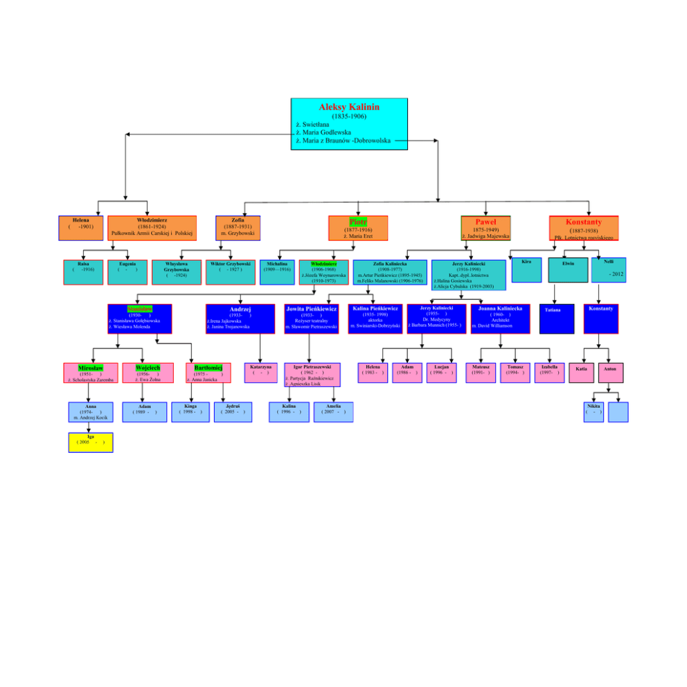 Aleksy Kalinin (1835-1906) ż. Swietłana ż. Maria Godlewska ż. Maria z Braunów -Dobrowolska ( Helena -1901) ( Włodzimierz (1861-1924) Pułkownik Armii Carskiej i Polskiej Raisa -1916) Eugenia ( ) Zofia (1887-1931) m. Grzybowski Właysława Grzybowska ( -1924) Wiktor Grzybowski ( - 1927 ) (1935- 1998) aktorka m. Swiniarski-Dobrzyński Bartłomiej (1975 ) z. Anna Janicka ) Zofia Kaliniecka (1908-1977) m.Artur Pieńkiewicz (1895-1945) m.Feliks Malanowski (1906-1976) Kalina Pieńkiewicz (1956) ż. Ewa Żołna Iga ( 2005 - Włodzimierz (1906-1968) ż.Józefa Woynarowska (1910-1973) (1933- ) Reżyser teatralny m. Sławomir Pietraszewski Wojciech Kinga ( 1998 - ) (1887-1938) Płk. Lotnictwa rosyjskiego Jowita Pieńkiewicz (1951) ż. Scholastyka Zaremba Adam ( 1989 - ) Konstanty Andrzej Mirosław Anna (1974) m. Andrzej Kocik Paweł 1875-1949) ż. Jadwiga Majewska (1933) ż.Irena Jajkowska ż. Janina Trojanowska Stanisław (1930) ż. Stanisława Gołębiowska ż. Wiesława Molenda Michalina (1909—1916) Piotr (1877-1916) ż. Maria Eret Jędruś ( 2005 - ) Katarzyna ( - ) Igor Pietraszewski ( 1962 - ) ż. Partycja Raźnikiewicz ż .Agnieszka Lisik Kalina ( 1996 - ) Amelia ( 2007 - ) Helena ( 1983 - ) Jerzy Kaliniecki (1955- ) Dr. Medycyny ż Barbara Munnich (1955- ) Adam (1986 - ) Kira Jerzy Kaliniecki (1916-1998) Kapt..dypl..lotnictwa ż.Halina Gosiewska ż.Alicja Cybulska (1919-2003) Lucjan ( 1996 - ) Nelli Elwin - 2012 Joanna Kaliniecka Konstanty Tatiana ( 1960- ) Architekt m. David Williamson Mateusz (1991- ) Tomasz (1994- ) Izabella (1997- ) Katia ( Anton Nikita - )