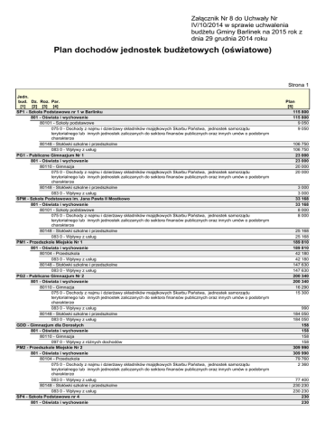 Załącznik Nr 8 do Uchwały Nr IV/10/2014 w sprawie uchwalenia budżetu Gminy Barlinek na 2015 rok z dnia 29 grudnia 2014 roku Plan dochodów jednostek budżetowych (oświatowe) Rok budżetowy: 2015 Przepływ: Dochody Strona 1 Jedn. bud. Dz. Roz. Par. [1] [2] [3] [4] SP1 - Szkoła Podstawowa nr 1 w Barlinku 801 - Oświata i wychowanie 80101 - Szkoły podstawowe 075 0 - Dochody z najmu i dzierżawy składników majątkowych Skarbu Państwa, jednostek samorządu terytorialnego lub innych jednostek zaliczanych do sektora finansów publicznych oraz innych umów o podobnym charakterze 80148 - Stołówki szkolne i przedszkolne 083 0 - Wpływy z usług PG1 - Publiczne Gimnazjum Nr 1 801 - Oświata i wychowanie 80110 - Gimnazja 075 0 - Dochody z najmu i dzierżawy składników majątkowych Skarbu Państwa, jednostek samorządu terytorialnego lub innych jednostek zaliczanych do sektora finansów publicznych oraz innych umów o podobnym charakterze 80148 - Stołówki szkolne i przedszkolne 083 0 - Wpływy z usług SPM - Szkoła Podstawowa im. Jana Pawła II Mostkowo 801 - Oświata i wychowanie 80101 - Szkoły podstawowe 075 0 - Dochody z najmu i dzierżawy składników majątkowych Skarbu Państwa, jednostek samorządu terytorialnego lub innych jednostek zaliczanych do sektora finansów publicznych oraz innych umów o podobnym charakterze 80148 - Stołówki szkolne i przedszkolne 083 0 - Wpływy z usług PM1 - Przedszkole Miejskie Nr 1 801 - Oświata i wychowanie 80104 - Przedszkola 083 0 - Wpływy z usług 80148 - Stołówki szkolne i przedszkolne 083 0 - Wpływy z usług PG2 - Publiczne Gimnazjum Nr 2 801 - Oświata i wychowanie 80110 - Gimnazja 075 0 - Dochody z najmu i dzierżawy składników majątkowych Skarbu Państwa, jednostek samorządu terytorialnego lub innych jednostek zaliczanych do sektora finansów publicznych oraz innych umów o podobnym charakterze 083 0 - Wpływy z usług 80148 - Stołówki szkolne i przedszkolne 083 0 - Wpływy z usług GDD - Gimnazjum dla Dorosłych 801 - Oświata i wychowanie 80110 - Gimnazja 097 0 - Wpływy z różnych dochodów PM2 - Przedszkole Miejskie Nr 2 801 - Oświata i wychowanie 80104 - Przedszkola 075 0 - Dochody z najmu i dzierżawy składników majątkowych Skarbu Państwa, jednostek samorządu terytorialnego lub innych jednostek zaliczanych do sektora finansów publicznych oraz innych umów o podobnym charakterze 083 0 - Wpływy z usług 80148 - Stołówki szkolne i przedszkolne 083 0 - Wpływy z usług SP4 - Szkoła Podstawowa nr 4 801 - Oświata i wychowanie Plan [5] 115 800 115 800 9 050 9 050 106 750 106 750 23 000 23 000 20 000 20 000 3 000 3 000 33 168 33 168 8 000 8 000 25 168 25 168 189 810 189 810 42 180 42 180 147 630 147 630 200 340 200 340 16 290 15 300 990 184 050 184 050 158 158 158 158 309 990 309 990 79 760 2 360 77 400 230 230 230 230 230 230 Strona 2 Jedn. bud. Dz. Roz. Par. [1] [2] [3] [4] 80101 - Szkoły podstawowe 083 0 - Wpływy z usług Razem: Plan [5] 230 230 872 496