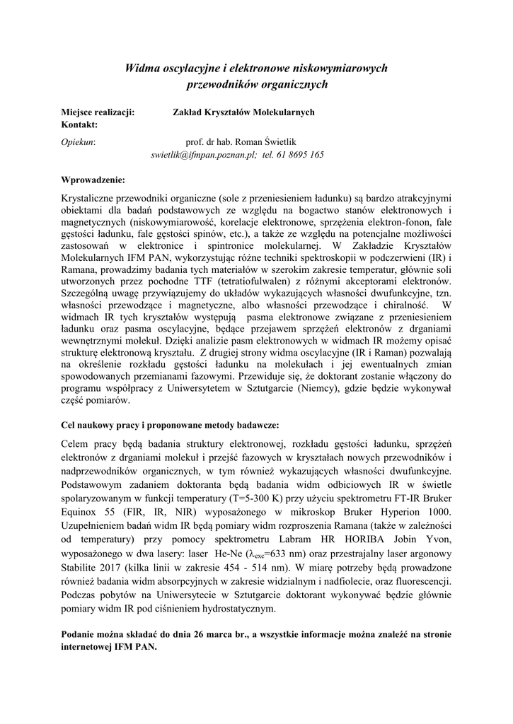Widma oscylacyjne i elektronowe niskowymiarowych przewodników organicznych Miejsce realizacji: Kontakt: Opiekun: Zakład Kryształów Molekularnych prof. dr hab. Roman Świetlik [email protected]; tel. 61 8695 165 Wprowadzenie: Krystaliczne przewodniki organiczne (sole z przeniesieniem ładunku) są bardzo atrakcyjnymi obiektami dla badań podstawowych ze względu na bogactwo stanów elektronowych i magnetycznych (niskowymiarowość, korelacje elektronowe, sprzężenia elektron-fonon, fale gęstości ładunku, fale gęstości spinów, etc.), a także ze względu na potencjalne możliwości zastosowań w elektronice i spintronice molekularnej. W Zakładzie Kryształów Molekularnych IFM PAN, wykorzystując różne techniki spektroskopii w podczerwieni (IR) i Ramana, prowadzimy badania tych materiałów w szerokim zakresie temperatur, głównie soli utworzonych przez pochodne TTF (tetratiofulwalen) z różnymi akceptorami elektronów. Szczególną uwagę przywiązujemy do układów wykazujących własności dwufunkcyjne, tzn. własności przewodzące i magnetyczne, albo własności przewodzące i chiralność. W widmach IR tych kryształów występują pasma elektronowe związane z przeniesieniem ładunku oraz pasma oscylacyjne, będące przejawem sprzężeń elektronów z drganiami wewnętrznymi molekuł. Dzięki analizie pasm elektronowych w widmach IR możemy opisać strukturę elektronową kryształu. Z drugiej strony widma oscylacyjne (IR i Raman) pozwalają na określenie rozkładu gęstości ładunku na molekułach i jej ewentualnych zmian spowodowanych przemianami fazowymi. Przewiduje się, że doktorant zostanie włączony do programu współpracy z Uniwersytetem w Sztutgarcie (Niemcy), gdzie będzie wykonywał część pomiarów. Cel naukowy pracy i proponowane metody badawcze: Celem pracy będą badania struktury elektronowej, rozkładu gęstości ładunku, sprzężeń elektronów z drganiami molekuł i przejść fazowych w kryształach nowych przewodników i nadprzewodników organicznych, w tym również wykazujących własności dwufunkcyjne. Podstawowym zadaniem doktoranta będą badania widm odbiciowych IR w świetle spolaryzowanym w funkcji temperatury (T=5-300 K) przy użyciu spektrometru FT-IR Bruker Equinox 55 (FIR, IR, NIR) wyposażonego w mikroskop Bruker Hyperion 1000. Uzupełnieniem badań widm IR będą pomiary widm rozproszenia Ramana (także w zależności od temperatury) przy pomocy spektrometru Labram HR HORIBA Jobin Yvon, wyposażonego w dwa lasery: laser He-Ne (exc=633 nm) oraz przestrajalny laser argonowy Stabilite 2017 (kilka linii w zakresie 454 - 514 nm). W miarę potrzeby będą prowadzone również badania widm absorpcyjnych w zakresie widzialnym i nadfiolecie, oraz fluorescencji. Podczas pobytów na Uniwersytecie w Sztutgarcie doktorant wykonywać będzie głównie pomiary widm IR pod ciśnieniem hydrostatycznym. Podanie można składać do dnia 26 marca br., a wszystkie informacje można znaleźć na stronie internetowej IFM PAN.