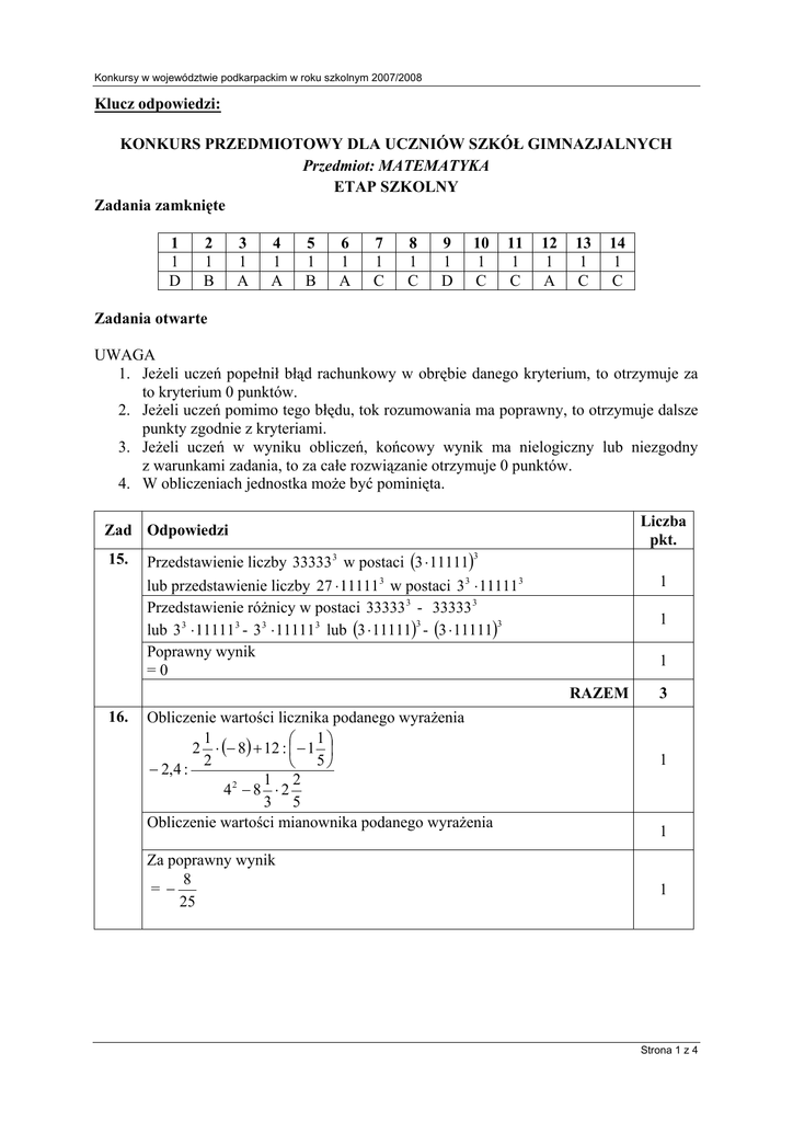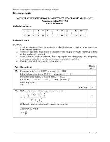 Konkursy w województwie podkarpackim w roku szkolnym 2007/2008 Klucz odpowiedzi: KONKURS PRZEDMIOTOWY DLA UCZNIÓW SZKÓŁ GIMNAZJALNYCH Przedmiot: MATEMATYKA ETAP SZKOLNY Zadania zamknięte 1 1 D 2 1 B 3 1 A 4 1 A 5 1 B 6 1 A 7 1 C 8 1 C 9 1 D 10 1 C 11 1 C 12 1 A 13 1 C 14 1 C Zadania otwarte UWAGA 1. Jeżeli uczeń popełnił błąd rachunkowy w obrębie danego kryterium, to otrzymuje za to kryterium 0 punktów. 2. Jeżeli uczeń pomimo tego błędu, tok rozumowania ma poprawny, to otrzymuje dalsze punkty zgodnie z kryteriami. 3. Jeżeli uczeń w wyniku obliczeń, końcowy wynik ma nielogiczny lub niezgodny z warunkami zadania, to za całe rozwiązanie otrzymuje 0 punktów. 4. W obliczeniach jednostka może być pominięta. Liczba pkt. Zad Odpowiedzi 15. Przedstawienie liczby 33333 3 w postaci (3 ⋅ 11111) lub przedstawienie liczby 27 ⋅ 111113 w postaci 3 3 ⋅ 111113 Przedstawienie różnicy w postaci 33333 3 - 33333 3 3 3 lub 3 3 ⋅ 111113 - 3 3 ⋅ 111113 lub (3 ⋅ 11111) - (3 ⋅ 11111) Poprawny wynik =0 3 1 1 1 RAZEM 16. Obliczenie wartości licznika podanego wyrażenia 1 ⎛ 1⎞ 2 ⋅ (− 8) + 12 : ⎜ − 1 ⎟ 2 ⎝ 5⎠ − 2,4 : 1 2 42 − 8 ⋅ 2 3 5 Obliczenie wartości mianownika podanego wyrażenia Za poprawny wynik 8 = − 25 3 1 1 1 Strona 1 z 4 Konkursy w województwie podkarpackim w roku szkolnym 2007/2008 Obliczenie 4 8 ⋅x = − 5 25 2 x= − 5 1 Zapisanie wyrażenia (− 2)2 − 2 5 1 Poprawny wynik 3 3 lub 3,6. 5 1 RAZEM 17. Rozpisanie np.: 3 ⋅ 2 5 − 5 ⋅ 3 5 Poprawny wynik −9 5 1 1 RAZEM 18. 19. 20. 6 Oznaczenie niewiadomej: x – szukana liczba Ułożenie równania: x+5 3 = x + 12 4 Rozwiązanie równania: x = 16 RAZEM Oznaczenie niewiadomej: x – wiek Szymona w chwili obecnej Ułożenie równania: x + 3 = 3( x − 3) Rozwiązanie równania: x=6 Obliczenie: za cztery lata Szymon będzie miał pięć razy więcej lat, niż miał cztery lata temu. RAZEM Zauważenie, że suma kątów wewnętrznych w trzech trójkątach wynosi 3 ⋅ 180 o 2 1 1 1 3 1 1 1 1 4 1 Strona 2 z 4 Konkursy w województwie podkarpackim w roku szkolnym 2007/2008 21. 22. Wykorzystanie faktu, że kąty wierzchołkowe mają równe miary: Np. Oznaczenie odpowiednio kątów przy wierzchołku W w każdym z trójkątów przez α , β i γ . 2α + 2 β + 2γ = 360 o czyli (1) α + β + γ = 180 o . Jeśli s oznacza sumę szukanych (zaznaczonych) kątów, to sumy miar wszystkich kątów wynoszą: (2) s + α + β + γ = 3 ⋅ 180 o . Obliczenie sumy szukanych (zaznaczonych) kątów z zależności (1) i (2) s = 360 o . RAZEM 1 1 Zauważenie, że pola małego kwadratu równa się pola dużego 4 7 kwadratu. 1 1 Np. Pm = Pd 4 7 7 Zauważenie, że pole dużego kwadratu stanowi pola małego kwadratu. 4 4 lub Pm = Pd 7 Zapisanie stosunku pól 3 Pm 4 6 Pd 7 Obliczenie 3 Pm 1 4 = 6 2 Pd 7 RAZEM Cztery zakrzywione odcinki to ćwierć okręgi, razem tworzą one pełny okrąg o średnicy 1 m. Łączna długość zakrzywionych części wynosi π m. Każdy z czterech odcinków prostych jest równy podwojonemu promieniowi, czyli ma długość 1 m ( 4 x 1 m = 4 m) 1 1 1 4 1 1 1 1 4 1 1 Strona 3 z 4 Konkursy w województwie podkarpackim w roku szkolnym 2007/2008 23. 24. Długość taśmy wynosi (π + 4)m . Uwaga: Wartości przybliżone uznajemy za poprawne tylko w przypadku, gdy przybliżenie wykonano poprawnie i zapisano ze znakiem „ ≈ ”. RAZEM Łącząc środki czterech rur, tworzymy kwadrat o boku 1 m, czyli polu 1 m2. Aby obliczyć pole zamalowanego obszaru, musimy odjąć cztery ćwiartki 1 koła; zestawione razem tworzą one pełne koło o promieniu m , a zatem 2 2 π 2 ⎛1⎞ łączne pole jest równe π ⋅ ⎜ ⎟ = m. 4 ⎝2⎠ Pole zamalowanego obszaru równa się ⎛ π⎞ 2 ⎜1 − ⎟ m . 4⎠ ⎝ Uwaga: Wartości przybliżone uznajemy za poprawne tylko w przypadku, gdy przybliżenie wykonano poprawnie i zapisano ze znakiem „ ≈ ”. RAZEM Poprawny rysunek wraz z oznaczeniami: DW = CW . 1 3 1 1 1 3 1 x Korzystając z tw. Pitagorasa dla trójkątów AWD i WBC otrzymujemy: 2 30 2 + x 2 = (50 − x ) + 40 2 1 Rozwiązanie równania: x = 32 1 Obliczenie odległości od źródełka: Źródełko znajduje się w odległości 32 metrów od wieży AD i 18 metrów od wieży BC. RAZEM 1 4 Jeżeli uczeń poprawnie rozwiązał zadanie inną niż podana w schemacie rozwiązania metodą otrzymuje maksymalną liczbę punktów za to zadanie. Strona 4 z 4
