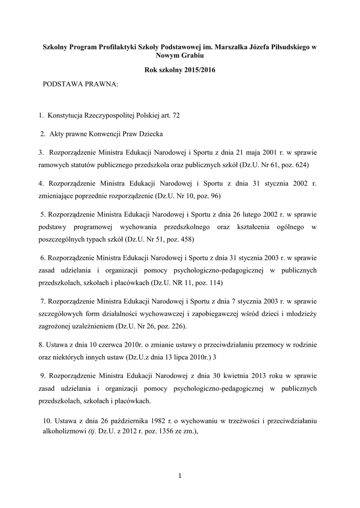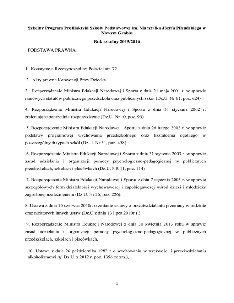 Szkolny Program Profilaktyki Szkoły Podstawowej im. Marszałka Józefa Piłsudskiego w Nowym Grabiu Rok szkolny 2015/2016 PODSTAWA PRAWNA: 1. Konstytucja Rzeczypospolitej Polskiej art. 72 2. Akty prawne Konwencji Praw Dziecka 3. Rozporządzenie Ministra Edukacji Narodowej i Sportu z dnia 21 maja 2001 r. w sprawie ramowych statutów publicznego przedszkola oraz publicznych szkół (Dz.U. Nr 61, poz. 624) 4. Rozporządzenie Ministra Edukacji Narodowej i Sportu z dnia 31 stycznia 2002 r. zmieniające poprzednie rozporządzenie (Dz.U. Nr 10, poz. 96) 5. Rozporządzenie Ministra Edukacji Narodowej i Sportu z dnia 26 lutego 2002 r. w sprawie podstawy programowej wychowania przedszkolnego oraz kształcenia ogólnego w poszczególnych typach szkół (Dz.U. Nr 51, poz. 458) 6. Rozporządzenie Ministra Edukacji Narodowej i Sportu z dnia 31 stycznia 2003 r. w sprawie zasad udzielania i organizacji pomocy psychologiczno-pedagogicznej w publicznych przedszkolach, szkołach i placówkach (Dz.U. NR 11, poz. 114) 7. Rozporządzenie Ministra Edukacji Narodowej i Sportu z dnia 7 stycznia 2003 r. w sprawie szczegółowych form działalności wychowawczej i zapobiegawczej wśród dzieci i młodzieży zagrożonej uzależnieniem (Dz.U. Nr 26, poz. 226). 8. Ustawa z dnia 10 czerwca 2010r. o zmianie ustawy o przeciwdziałaniu przemocy w rodzinie oraz niektórych innych ustaw (Dz.U.z dnia 13 lipca 2010r.) 3 9. Rozporządzenie Ministra Edukacji Narodowej z dnia 30 kwietnia 2013 roku w sprawie zasad udzielania i organizacji pomocy psychologiczno-pedagogicznej w publicznych przedszkolach, szkołach i placówkach. 10. Ustawa z dnia 26 października 1982 r. o wychowaniu w trzeźwości i przeciwdziałaniu alkoholizmowi (tj. Dz.U. z 2012 r. poz. 1356 ze zm.), 1 11. Ustawa z dnia 18 sierpnia 2015 r. w sprawie zakresu i form prowadzenia w szkołach i placówkach działalności wychowawczej, edukacyjnej, informacyjnej i profilaktycznej w celu przeciwdziałania narkomanii ( Dz. U. z 2015 r., poz. 1249), 12. Ustawa z dnia 9 listopada 1995 r. o ochronie zdrowia przed następstwami używania tytoniu i wyrobów tytoniowych (Dz. U. z 1996 r. Nr 10 poz. 55 ze zm.). Profilaktyka – to wielostronny, systematyczny wysiłek na rzecz zmniejszania zdrowotnych lub innych problemów, których może doświadczyć osoba jeszcze nie uzależniona, będąca w dowolnym wieku lub sytuacji. Profilaktyka I rzędowa – to podejmowanie wszelkich działań, gdy nie ma jeszcze problemu lub pojawia się on w niewielkiej formie. Profilaktyką określa się ogół działań zapobiegających powstawaniu u dzieci niepożądanych przyzwyczajeń i postaw, błędów w uczeniu się. Szkolny Program Profilaktyki (SPP) ma na celu kształtowanie postaw zdrowego i bezpiecznego stylu życia bez potrzeby stosowania agresji i używek, kształtowanie umiejętności życiowych, jak również zapobiegania sytuacjom i zachowaniom problemowym w szkole. Wskazuje na budowanie porozumienia szkoła – dom – środowisko, ich wspólnej aktywności wychowawczej i partnerstwa w podejmowaniu działań i decyzji wychowawczych przeciw agresji dziecięcej i uzależnieniom. Szkolny Program Profilaktyki posiada opracowany plan działań, oraz spełnia następujące założenia: uzupełnia program wychowawczy szkoły, odpowiada na realne problemy i zagrożenia pojawiające się w szkole, klasie szkolnej i środowisku, formy i sposoby działań zakresu profilaktyki pierwszorzędowej dostosowane są do wieku uczniów, zawiera jasno określone zasady i formy współpracy wychowawczej, uwzględnia predyspozycje do prowadzenia zajęć wychowawczych, tworzy warunki do rozwoju indywidualnych zainteresowań i uzdolnień uczniów, aktywizuje i integruje uczniów przy realizacji wspólnych zamierzeń, w miarę możliwości włącza rodziców do realizacji zadań wychowawczych. Szkolny Program Profilaktyki Szkoły Podstawowej im. Marszałka Józefa Piłsudskiego w Nowym Grabiu skierowany jest do każdego ucznia – zdolnego i potrzebującego psychologiczno-pedagogicznej oraz materialnej pomocy. Zakładamy, że dzięki naszemu zaangażowaniu każdy z nich poradzi sobie w trudnej sytuacji i osiągnie sukces na miarę swoich możliwości. Obszary oddziaływań profilaktycznych Szkoły 2 Niniejszy program opracowany został na podstawie dokonanej diagnozy sytuacji dydaktyczno - wychowawczej w szkole, dzięki wnioskom z ewaluacji wewnętrznej i zewnętrznej z roku ubiegłego oraz debat z rodzicami i uczniami przy użyciu niżej wymienionych narzędzi: obserwacja i analiza działań prowadzonych w szkole analiza dokumentacji z uczestnictwa w realizowanych dotychczas programach profilaktycznych w szkole Dokonano identyfikacji niepokojących objawów w obszarach: poziomu umiejętności konstruktywnego wyrażania swoich potrzeb i oczekiwań konfliktów i agresji rówieśniczej kłótni i waśni wśród dzieci , mających swoje źródło w środowisku rodzinnym i sąsiedzkim. Cel główny SPP: Wspomaganie wszechstronnego, harmonijnego rozwoju ucznia. Zapobieganie występowaniu niekorzystnych symptomów zagrażających prawidłowemu rozwojowi ucznia. Kształtowanie postaw i zachowań społecznie pożądanych poprzez zintegrowane działania nauczycieli, uczniów i rodziców. Cele szczegółowe: kształtowanie umiejętności bycia asertywnym, unikania konfliktów, dbania o zdrowie fizyczne i psychiczne, wyposażenie uczniów, rodziców i nauczycieli w wiedzę o uzależnieniach i możliwościach uzyskania pomocy kształtowanie postawy, w której uczeń unika nikotyny, alkoholu, narkotyków, zdrowo i higienicznie się odżywia, kształtowanie postawy świadomego i umiejętnego korzystania z mass-mediów, kształtowanie umiejętności prawidłowej reakcji w sytuacji zagrożenia, wspieranie dzieci z ubogich i zaniedbanych środowiskowo rodzin, kształtowanie umiejętności stosowania pozytywnych wzorców zachowań, podniesienie poziomu bezpieczeństwa uczniów w domu, w szkole, na ulicy oraz podczas zabaw.