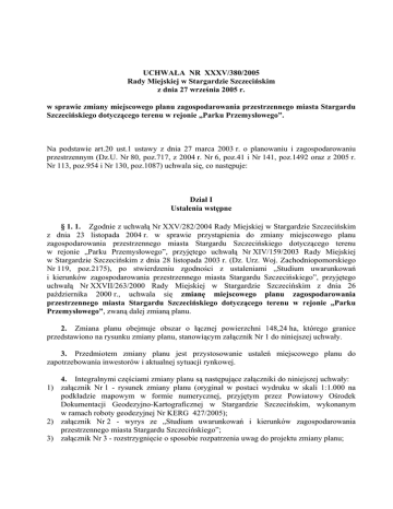 UCHWAŁA NR XXXV/380/2005 Rady Miejskiej w Stargardzie Szczecińskim z dnia 27 września 2005 r. w sprawie zmiany miejscowego planu zagospodarowania przestrzennego miasta Stargardu Szczecińskiego dotyczącego terenu w rejonie „Parku Przemysłowego”. Na podstawie art.20 ust.1 ustawy z dnia 27 marca 2003 r. o planowaniu i zagospodarowaniu przestrzennym (Dz.U. Nr 80, poz.717, z 2004 r. Nr 6, poz.41 i Nr 141, poz.1492 oraz z 2005 r. Nr 113, poz.954 i Nr 130, poz.1087) uchwala się, co następuje: Dział I Ustalenia wstępne § 1. 1. Zgodnie z uchwałą Nr XXV/282/2004 Rady Miejskiej w Stargardzie Szczecińskim z dnia 23 listopada 2004 r. w sprawie przystąpienia do zmiany miejscowego planu zagospodarowania przestrzennego miasta Stargardu Szczecińskiego dotyczącego terenu w rejonie „Parku Przemysłowego”, przyjętego uchwałą Nr XIV/159/2003 Rady Miejskiej w Stargardzie Szczecińskim z dnia 28 listopada 2003 r. (Dz. Urz. Woj. Zachodniopomorskiego Nr 119, poz.2175), po stwierdzeniu zgodności z ustaleniami „Studium uwarunkowań i kierunków zagospodarowania przestrzennego miasta Stargardu Szczecińskiego”, przyjętego uchwałą Nr XXVII/263/2000 Rady Miejskiej w Stargardzie Szczecińskim z dnia 26 października 2000 r., uchwala się zmianę miejscowego planu zagospodarowania przestrzennego miasta Stargardu Szczecińskiego dotyczącego terenu w rejonie „Parku Przemysłowego”, zwaną dalej zmianą planu. 2. Zmiana planu obejmuje obszar o łącznej powierzchni 148,24 ha, którego granice przedstawiono na rysunku zmiany planu, stanowiącym załącznik Nr 1 do niniejszej uchwały. 3. Przedmiotem zmiany planu jest przystosowanie ustaleń miejscowego planu do zapotrzebowania inwestorów i aktualnej sytuacji rynkowej. 4. Integralnymi częściami zmiany planu są następujące załączniki do niniejszej uchwały: 1) załącznik Nr 1 - rysunek zmiany planu (oryginał w postaci wydruku w skali 1:1.000 na podkładzie mapowym w formie numerycznej, przyjętym przez Powiatowy Ośrodek Dokumentacji Geodezyjno-Kartograficznej w Stargardzie Szczecińskim, wykonanym w ramach roboty geodezyjnej Nr KERG 427/2005); 2) załącznik Nr 2 - wyrys ze „Studium uwarunkowań i kierunków zagospodarowania przestrzennego miasta Stargardu Szczecińskiego”; 3) załącznik Nr 3 - rozstrzygnięcie o sposobie rozpatrzenia uwag do projektu zmiany planu; Zmiana miejscowego planu zagospodarowania przestrzennego miasta Stargardu Szczecińskiego dotyczącego terenu w rejonie „Parku Przemysłowego”. 2 ----------------------------------------------------------------------------------------------------------------------------------------------------------- 4) załącznik Nr 4 - rozstrzygnięcie o sposobie realizacji zapisanych w zmianie planu inwestycji z zakresu infrastruktury technicznej, które należą do zadań własnych gminy oraz zasadach ich finansowania. 1) 2) 3) 4) 5) 6) 7) 8) 9) 10) 11) 12) 13) 14) 15) § 2. 1. Na obszarze objętym zmianą planu ustala się następujące przeznaczenie terenów: P - tereny obiektów produkcyjnych, składów i magazynów; US - tereny usług sportu i rekreacji; UK - tereny kultu religijnego; U - tereny zabudowy usługowej; MN,U - tereny zabudowy mieszkaniowej jednorodzinnej z towarzyszeniem usług; ZP - tereny zieleni urządzonej; K - tereny urządzeń i elementów sieci kanalizacyjnych; E1 - tereny stacji elektroenergetycznych 110/15 kV; E2 - tereny stacji elektroenergetycznych 15/0,4 kV; KS - tereny obsługi komunikacji; KDG - ulica główna; KDZ - ulica zbiorcza; KDL - ulica lokalna; KDD - ulica dojazdowa; KDW - ulica wewnętrzna. 2. Ustalenia tekstu zmiany planu składają się z ustaleń ogólnych dotyczących całego obszaru opracowania zmiany planu oraz ustaleń szczegółowych przyporządkowanych poszczególnym terenom. § 3. Ilekroć w uchwale jest mowa o: 1) obowiązującej linii zabudowy – należy przez to rozumieć linię, w której należy sytuować lico budynku; 2) nieprzekraczalnej linii zabudowy – należy przez to rozumieć linię, której nie może przekroczyć lico budynku; 3) wysokości zabudowy – należy przez to rozumieć wysokość liczoną od poziomu terenu przy najniżej położonym wejściu do budynku do najwyżej położonej górnej powierzchni przekrycia dachu. § 4. Przebieg linii rozgraniczających dla celów opracowań geodezyjnych należy określić poprzez odczyt osi linii z rysunku zmiany planu. Zmiana miejscowego planu zagospodarowania przestrzennego miasta Stargardu Szczecińskiego dotyczącego terenu w rejonie „Parku Przemysłowego”. 3 ----------------------------------------------------------------------------------------------------------------------------------------------------------- Dział II Ustalenia ogólne Rozdział 1 Zasady ochrony i kształtowania ładu przestrzennego § 5. Zakazuje się lokalizowania obiektów tymczasowych i nietrwałych, z wyjątkiem tablic i konstrukcji reklamowych oraz budynków wznoszonych na czas budowy i stanowiących jej zaplecze, chyba że jest to dopuszczone ustaleniami szczegółowymi dla danego obszaru (np. punkt sprzedaży biletów, pawilony ogrodowe na terenie zieleni urządzonej). Rozdział 2 Zasady ochrony środowiska, przyrody i krajobrazu kulturowego § 6. Nakazuje się podłączenie budynków do miejskiej sieci wodociągowej. § 7. 1. Nakazuje się: 1) odprowadzanie ścieków komunalnych do miejskiej sieci kanalizacji sanitarnej; 2) przed wprowadzeniem do kanalizacji sanitarnej ścieków technologicznych odbiegających składem od ścieków bytowych oraz ścieków o ponadnormatywnych zanieczyszczeniach, ich wstępne podczyszczanie w indywidualnych podczyszczalniach ścieków. 2. Do czasu wybudowania kanalizacji sanitarnej w najbliżej położonej drodze publicznej dopuszcza się tymczasowo gromadzenie ścieków bytowych w szczelnych bezodpływowych zbiornikach na ścieki. 3. Zakazuje się budowy indywidualnych oczyszczalni ścieków, z wyjątkiem urządzeń do wstępnego oczys