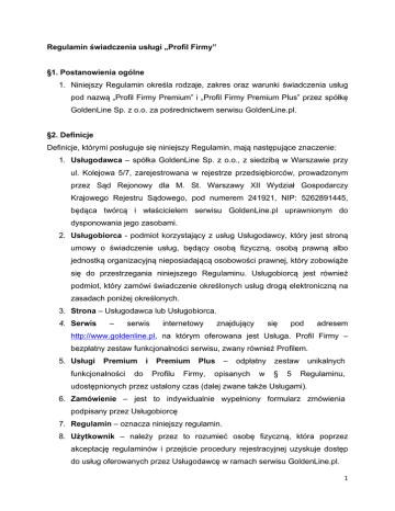 Regulamin świadczenia usługi „Profil Firmy” §1. Postanowienia ogólne 1. Niniejszy Regulamin określa rodzaje, zakres oraz warunki świadczenia usług pod nazwą „Profil Firmy Premium” i „Profil Firmy Premium Plus” przez spółkę GoldenLine Sp. z o.o. za pośrednictwem serwisu GoldenLine.pl. §2. Definicje Definicje, którymi posługuje się niniejszy Regulamin, mają następujące znaczenie: 1. Usługodawca – spółka GoldenLine Sp. z o.o., z siedzibą w Warszawie przy ul. Kolejowa 5/7, zarejestrowana w rejestrze przedsiębiorców, prowadzonym przez Sąd Rejonowy dla M. St. Warszawy XII Wydział Gospodarczy Krajowego Rejestru Sądowego, pod numerem 241921, NIP: 5262891445, będąca twórcą i właścicielem serwisu GoldenLine.pl uprawnionym do dysponowania jego zasobami. 2. Usługobiorca - podmiot korzystający z usług Usługodawcy, który jest stroną umowy o świadczenie usług, będący osobą fizyczną, osobą prawną albo jednostką organizacyjną nieposiadającą osobowości prawnej, który zobowiąże się do przestrzegania niniejszego Regulaminu. Usługobiorcą jest również podmiot, który zamówi świadczenie określonych usług drogą elektroniczną na zasadach poniżej określonych. 3. Strona – Usługodawca lub Usługobiorca. 4. Serwis – serwis internetowy znajdujący się pod adresem http://www.goldenline.pl, na którym oferowana jest Usługa. Profil Firmy – bezpłatny zestaw funkcjonalności serwisu, zwany również Profilem. 5. Usługi Premium funkcjonalności do i Premium Profilu Plus Firmy, – odpłatny opisanych w zestaw § 5 unikalnych Regulaminu, udostępnionych przez ustalony czas (dalej zwane także Usługami). 6. Zamówienie – jest to indywidualnie wypełniony formularz zmówienia podpisany przez Usługobiorcę 7. Regulamin – oznacza niniejszy regulamin. 8. Użytkownik – należy przez to rozumieć osobę fizyczną, która poprzez akceptację regulaminów i przejście procedury rejestracyjnej uzyskuje dostęp do usług oferowanych przez Usługodawcę w ramach serwisu GoldenLine.pl. 1 §3. Warunki zawarcia Umowy 1. Warunkami skorzystania z Usługi są: a. Akceptacje niniejszego Regulaminu, b. Spełnienie wymagań technicznych o których mowa w § 6 pkt. 8, c. Dokonanie płatności 2. Zakupu Usługi można dokonać poprzez dostarczenie Zamówienia: a. na podany przez Usługodawcę numer faxu bądź b. poprzez przesłanie na adres: [email protected] bądź c. za pośrednictwem przedstawiciela handlowego Usługodawcy. 3. Usługa może zostać również sprzedana w pakiecie z innymi usługami świadczonymi przez Usługodawcę, na zasadach określonych w odrębnych regulaminach. 4. Warunkiem koniecznym do uruchomienia Usługi w pełnym zakresie jest otrzymanie przez Usługodawcę wynagrodzenia, chyba że co innego wynika z ustaleń pomiędzy Stronami i ustalenia te zostały uwzględnione w Zamówieniu zaakceptowanym przez Usługodawcę lub odrębnej umowie. 5. W momencie otrzymania przez Usługodawcę zamówienia, Usługodawca rozpoczyna świadczenie usług poprzez zarezerwowanie zasobów niezbędnych do realizacji zamówienia. 6. Jeżeli dla właściwego wykonania usług Usługobiorca dostarcza jakiekolwiek utwory chronione przepisami ustawy o prawie autorskim i prawach pokrewnych, Usługobiorca uzyska stosowne zgody osób uprawnionych – dysponentów takich praw celem upoważnienia Usługodawcy do korzystania z takich utworów zgodnie z ich przeznaczeniem i w celu realizacji umowy na polach eksploatacji określonych postanowieniami art. 50 oraz art. 74.4 cyt. ustawy. Upoważnienie, o którym mowa w paragrafie niniejszym zawierać będzie także upoważnienie do wykonywania praw zależnych do takich utworów oraz do udzielania ewentualnych licencji lub sublicencji na rzecz osób trzecich przez Usługodawcę, o ile będzie to niezbędne dla należytego wykonywania umowy. 7. Usługobiorca ponosi wszystkie ewentualne koszty związane ze wszelkimi roszczeniami osób trzecich wniesionymi przeciwko Usługodawcy opartymi na zarzucie naruszenia praw autorskich przez umieszczenie na Serwisie utworów, o których mowa w punkcie 6 powyżej. 2 8. Prawa autorskie do Serwisu oraz Profilu Firmy wraz z zestawem funkcjonalności Premium i Premium Plus należą do Usługodawcy. 9. Prawa autorskie oraz inne prawa własności intelektualnej do wszystkich utworów a także do elementów stanowiących samodzielne części innych utworów i innych dzieł będących przedmiotem praw własności intelektualnej, stworzonych przez Usługodawcę, w wyniku wykonywania obowiązków z niniejszego Regulaminu, przysługują wyłącznie Usługodawcy od chwili ustalenia ich postaci, chociażby w formie częściowej. §4. Oceny i referencje. 1. Usługobiorca oświadcza, iż jest świadomy, że jedną z funkcjonalności Profilu Firmy jest możliwość dodawania subiektywnych ocen i referencji na temat Usługobiorcy przez Użytkowników i akceptuje to bez zastrzeżeń. 2. Usługobiorca oświadcza, iż zwalnia Usługodawcę z odpowiedzialności za oceny lub referencje Użytkowników i zobowiązuje się do nie dochodzenia żadnych roszczeń z tego tytułu od Usługodawcy. Pełną odpowiedzialność za oceny i referencje ponoszą Użytkownicy zamieszczający te referencje i oceny. 3. Usługodawca nie ingeruje w treść referencji i ocen zamieszczanych przez Użytkowników. Referencje i oceny są usuwane lub modyfikowane przez Usługodawcę na podstawie orzeczenia sądu podlegającego wykonaniu. 4. Usługobiorca może powiadomić Usługodawcę o każdym przypadku naruszenia prawa, regulaminów lub dobrych obyczajów przez Użytkowników. Powiadomienie powinno wskazywać w szczególności treść naruszenia oraz uzasadnienie. 5. Usługodawca może usunąć referencje lub oceny Użytkowników, jeżeli w sposób oczywisty naruszają normy prawne, Regulamin lub dobre obyczaje. §5. Rodzaj i zakres świadczonych Usług Usługi Premium i Premium Plus obejmują poniższe następujące