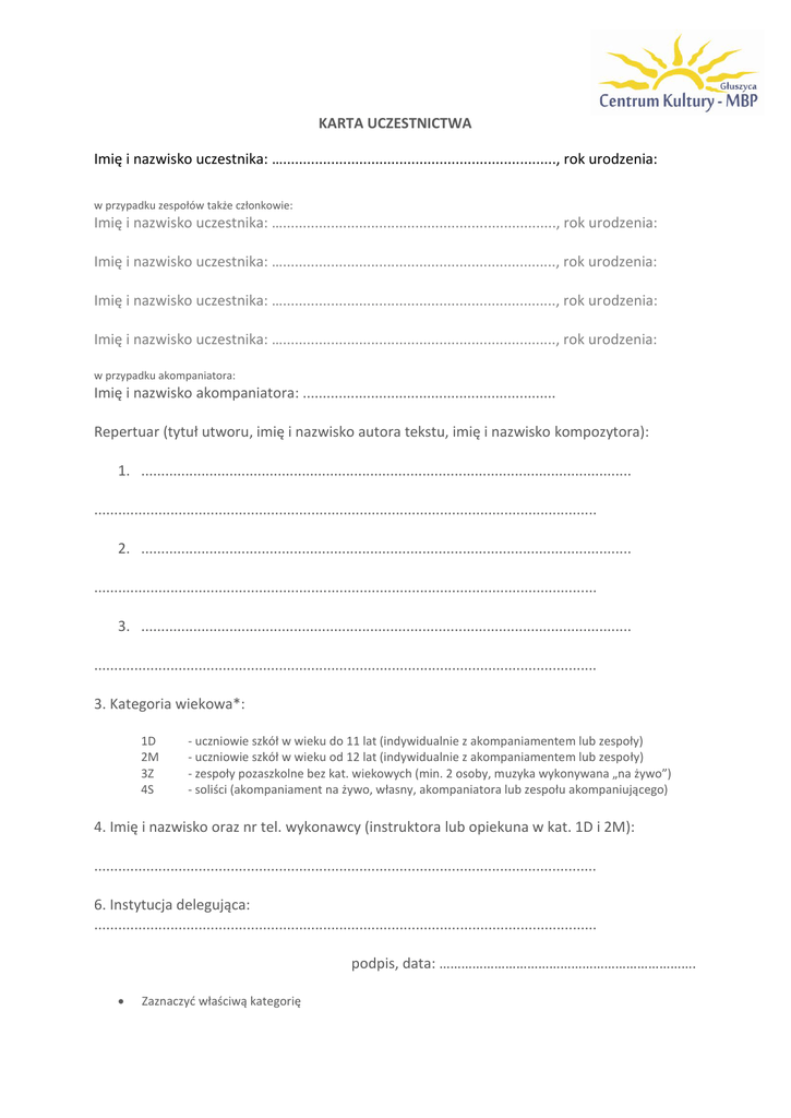 KARTA UCZESTNICTWA Imię i nazwisko uczestnika: …...................................................................., rok urodzenia: w przypadku zespołów także członkowie: Imię i nazwisko uczestnika: …...................................................................., rok urodzenia: Imię i nazwisko uczestnika: …...................................................................., rok urodzenia: Imię i nazwisko uczestnika: …...................................................................., rok urodzenia: Imię i nazwisko uczestnika: …...................................................................., rok urodzenia: w przypadku akompaniatora: Imię i nazwisko akompaniatora: ............................................................... Repertuar (tytuł utworu, imię i nazwisko autora tekstu, imię i nazwisko kompozytora): 1. .......................................................................................................................... ............................................................................................................................. 2. .......................................................................................................................... ............................................................................................................................. 3. .......................................................................................................................... ............................................................................................................................. 3. Kategoria wiekowa*: 1D 2M 3Z 4S - uczniowie szkół w wieku do 11 lat (indywidualnie z akompaniamentem lub zespoły) - uczniowie szkół w wieku od 12 lat (indywidualnie z akompaniamentem lub zespoły) - zespoły pozaszkolne bez kat. wiekowych (min. 2 osoby, muzyka wykonywana „na żywo”) - soliści (akompaniament na żywo, własny, akompaniatora lub zespołu akompaniującego) 4. Imię i nazwisko oraz nr tel. wykonawcy (instruktora lub opiekuna w kat. 1D i 2M): ............................................................................................................................. 6. Instytucja delegująca: ............................................................................................................................. podpis, data: ……………………………………………………………. Zaznaczyd właściwą kategorię OŚWIADCZENIE AUTORA *1. Oświadczam, że jestem autorem tekstu utworów przygotowanych do prezentacji w ramach niniejszego przeglądu: ……………………………………………………………………………………………. ……………………………………………………………………………………………. ……………………………………………………………………………………………. **2. Oświadczam, ze jestem autorem utworów przygotowanych do prezentacji w ramach niniejszego przeglądu: ……………………………………………………………………………………………. ……………………………………………………………………………………………. ……………………………………………………………………………………………. 3. Wyrażam zgodę, aby utwory były w całości lub w częściach wykorzystane i przetwarzane w formie zapisu analogowego, cyfrowego, w postaci druku przez organizatora przeglądu w materiałach promocyjnych, informacyjnych oraz wydawniczych, a także na stronach internetowych. 4. Z chwilą wykonania utworu w przeglądzie przenoszę nieodpłatnie na organizatora majątkowe prawa autorskie, bez ograniczeo czasowych i terytorialnych. 5. Oświadczam, że utwór nie zawiera treści uzyskanych w sposób niezgodny z obowiązującym prawem i nie narusza praw autorskich w rozumieniu ustawy z dnia 4 lutego 1994 r. o prawie autorskim i prawach pokrewnych oraz dóbr osobistych chronionych prawem cywilnym. 6. Oznacza to jednocześnie, że utwory nie będą zagrażały ani naruszały praw osób trzecich, w szczególności nie będą naruszały ich majątkowych i osobistych praw autorskich. W przypadku wystąpienia przez osobę trzecią z roszczeniami wynikającymi z tytułu naruszenia praw określonych powyżej, osoba przekazująca zrekompensuje organizatorowi, jako wyłącznie odpowiedzialna, koszty poniesione w związku ze skierowaniem przeciwko niemu roszczeo odszkodowawczych, zwalniając organizatora od wszelkich zobowiązao, jakie powstaną z tego tytułu. 7. Zgodnie z ustawą z dnia 29 sierpnia 1997 o ochronie danych osobowych wyrażam zgodę na przetwarzanie moich danych osobowych przez Centrum Kultury - MBP w Głuszycy, które będzie przetwarzad dane w celach zgodnych ze swoją działalnością statutową. *, ** niepotrzebne skreślid …………………………………….. Data ………………….………………...... Czytelnie imię i nazwisko OŚWIADCZENIE RODZICA/OPIEKUNA w przypadku osób niepełnoletnich *1. Oświadczam, że mój syn / moja córka ……………………………………….……………. jest autorem słów piosenki pt………………………………………………………………………………………………… **2. Oświadczam, że mój syn/ moja córka ……………………………………….…………… jest autorem muzyki utworu pt…………………………………………………………………………………………… 3. Wyrażam zgodę, aby utwór mojego syna, mojej córki był w całości wykorzystany i przetwarzany w formie zapisu analogowego, cyfrowego, w postaci druku przez organizatora przeglądu w materiałach promocyjnych, informacyjnych oraz wydawniczych a także na stronach internetowych. 4. Z chwilą wykonania utworu w przeglądzie przenoszę nieodpłatnie na organizatora majątkowe prawa au