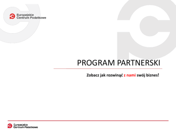PROGRAM PARTNERSKI Zobacz jak rozwinąć z nami swój biznes! O KANCELARII Jesteśmy kancelarią doradztwa podatkowego z ponad 10 letnim doświadczeniem, która świadczy usługi dla osób migrujących oraz przedsiębiorców. Kancelaria wpisana jest do rejestru osób prawnych, uprawnionych do wykonywania doradztwa podatkowego przez Krajową Izbę Doradców Podatkowych. Specjalizujemy się w odzyskiwaniu nadpłaconego podatku dochodowego z Niemiec, Belgii, Holandii, Wielkiej Brytanii oraz Norwegii. Oferujemy również pomoc w uzyskaniu świadczeń rodzinnych w Niemczech oraz Holandii. Pomagamy naszym klientom w pozyskaniu kart podatkowych od pracodawców. Dla przedsiębiorców, którzy prowadzą działalność transgraniczną świadczymy usługi doradcze w zakresie podatku VAT, podatku budowlanego oraz rozliczeń okresowych w zagranicznych urzędach. Działamy w oparciu o ustawę oraz kodeks etyki doradców podatkowych oraz posiadamy niezbędne autoryzacje zagranicznych instytucji m.in. : niemieckiej Steuerberaterkammer brytyjskiej HM Revenue & Customs holenderskiej Belastingdienst Staramy się zawsze wychodzić naprzeciw potrzebom naszych klientów i partnerów. Europejskie Centrum Podatkowe Sp. z o.o. | ul. Świeradowska 75, 50-559 Wrocław euro-punkt.pl | +48 71 787 63 78 / 50 | [email protected] | facebook.com/europunkt 01/07 DLACZEGO MY? Program Partnerski to najlepsza droga rozwoju dla firm chcących rozszerzyć ofertę swojej firmy o usługi rozliczeń podatkowych. Dzięki współpracy z naszą kancelarią nasi partnerzy zyskują możliwość oferowania klientom kompleksowych usług nowej jakości oraz o najwyższym poziomie skuteczności. Dzięki efektywnemu planowi wdrożenia w niedługim czasie od nawiązania współpracy nasi partnerzy mogą zacząć proponować swoim klientom nowe usługi. Każdy nasz partner otrzymuje niezbędne materiały informacyjne, szkolenie ze specjalistą oraz pełne wsparcie marketingowe. Dzięki dostępowi do internetowej platformy - Panelu Partnera, nasi partnerzy mają podgląd w listę swoich klientów, mogą pobrać dokumenty dla klienta, sprawdzić aktualności czy skorzystać z ofert rabatowych. Wszyscy zainteresowani klienci są przez nas informowani o możliwości zawarcia umowy u naszych partnerów. Każdy zainteresowany klient otrzymuje kontakt partnera ze swojego regionu. Europejskie Centrum Podatkowe Sp. z o.o. | ul. Świeradowska 75, 50-559 Wrocław euro-punkt.pl | +48 71 787 63 78 / 50 | [email protected] | facebook.com/europunkt 02/07 O PROGRAMIE RZETELNA WSPÓŁPRACA PROSTE I ATRAKCYJNE WARUNKI WSPÓŁPRACY stale współpracujemy już z ponad 200 firmami w Polsce w każdym kolejnym miesiącu dołącza do nas 15- stu nowych partnerów jesteśmy nastawieni na długofalową i obustronnie satysfakcjonującą współpracę wynagrodzenie za każdego poleconego klienta: • 80 zł netto (wynagrodzenie ryczałtowe) • 20 % prowizji (wynagrodzenie prowizyjne) maksymalnie ograniczony zakres obowiązków partnera PEŁNE WSPARCIE DORADCÓW indywidualne szkolenie wprowadzające ze specjalistą szkolenia cykliczne (aktualizacyjne) pomoc w procesie obsługi klienta niezbędne materiały informacyjne wspólne działania reklamowo - marketingowe dostęp do platformy informatycznej dla partnerów dostęp do szkoleń z ekspertem podatkowym w atrakcyjnej cenie otwartość na pomysły i propozycje działań partnerów OFERTY RABATOWE nasi partnerzy mają możliwość skorzystania z atrakcyjnych ofert dla biznesu np. materiały biurowe, oprogramowanie dla firm i inne SZEROKI ZAKRES USŁUG DLA KLIENTÓW regularnie udostępniamy nowe usługi dla naszych klientów oferujemy pełny zakres usług rozliczeń podatkowych z krajów najczęstszej migracji zarobkowej pomagamy uzyskać świadczenia rodzinne świadczymy kompleksową obsługę przedsiębiorców Europejskie Centrum Podatkowe Sp. z o.o. | ul. Świeradowska 75, 50-559 Wrocław euro-punkt.pl | +48 71 787 63 78 / 50 | [email protected] | facebook.com/europunkt 03/07 WARUNKI WSPÓŁPRACY Proponujemy następujące warunki współpracy dotyczące świadczenia usług marketingowych oraz pośrednictwa na rzecz Europejskiego Centrum Podatkowego Sp. z o.o. : Wynagrodzenie prowizyjne w wysokości 20% kwoty wynagrodzenia netto przysługującego Firmie za każdego pozyskanego klienta, z którym Partner podpisze umowę, lub: Wynagrodzenie ryczałtowe w wysokości 80 zł netto za każdego pozyskanego klienta, z którym Partner podpisze umowę. W przypadku gdy pozyskany klient zrezygnuje z usług Europejskiego Centrum Podatkowego, a umowa zobowiązuje go do zapłaty wynagrodzenia na rzecz kancelarii, Partnerowi oferujemy ekwiwalent w wysokości 30zł netto. Termin zapłaty wynagrodzenia będzie wynosił 30 dni od dnia wystawienia przez Partnera faktury VAT/rachunku. Zapraszamy do zapoznania się ze wzorami umów. Europejskie Centrum Podatkowe Sp. z o.o. | ul. Świeradowska 75, 50-559 Wrocław euro-punkt.pl | +48 71 787 63 78 / 50 | [email protected] | facebook.com/europunkt 04/07 OBSŁUGA KLIENTA Obsługa Klienta – udzielenie informacji o usłudze oraz kompletu niezbędnych dokumentów Przekazanie dokumentacji klienta do Europejskiego Centrum Podatkowego Opracowanie wniosku/deklaracji podatkowej dla Klienta oraz wysłanie jej do urzędu wynagrodzenie ryczałt Decyzja podatkowa urzędu wynagrodzenie prowizja Faktura/rachunek dla Klienta Europejskie Centrum Podatkowe Sp. z o.o. | ul. Świeradowska 75, 50-559 Wrocław euro-punkt.pl | +48 71 787 63 78 / 50 | [email protected] | facebook.com/europunkt 05/07 W PROGRAMIE - KROK PO KROKU Nawiązanie współpracy Materiały informacyjne i reklamowe Informacja o firmie na stronie internetowej Dostęp do panelu partnera Szkolenie wprowadzające Działania marketingowo - reklamowe Europejskie Centrum Podatkowe Sp. z o.o. | ul. Świeradowska 75, 50-559 Wrocław euro-punkt.pl | +48 71 787 63 78 / 50 | [email protected] | facebook.com/europunkt 06/07 JAK DOŁĄCZYĆ DO PROGRAMU? Ab