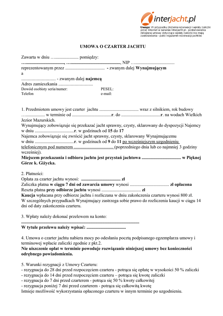 UMOWA O CZARTER JACHTU Zawarta w dniu …..................... pomiędzy: ….................................., …............................................, NIP …................................... reprezentowanym przez ................................... - zwanym dalej Wynajmującym a ................................... - zwanym dalej najemcą Adres zamieszkania ................................... Dowód osobisty seria/numer: Telefon PESEL: e-mail: 1. Przedmiotem umowy jest czarter jachtu ................................... wraz z silnikiem, rok budowy …................. w terminie od ...................................r. do ...................................r. na wodach Wielkich Jezior Mazurskich. Wynajmujący zobowiązuje się przekazać jacht sprawny, czysty, sklarowany do dyspozycji Najemcy w dniu ...................................r. w godzinach od 15 do 17 Najemca zobowiązuje się zwrócić jacht sprawny, czysty, sklarowany Wynajmującemu w dniu ...................................r. w godzinach od 9 do 11 po wcześniejszym uzgodnieniu telefonicznym pod numerem ................................... (poprzedniego dnia lub co najmniej 3 godziny wcześniej). Miejscem przekazania i odbioru jachtu jest przystań jachtowa ................................... w Pięknej Górze k. Giżycka. 2. Płatności: Opłata za czarter jachtu wynosi: ................................... zł Zaliczka płatna w ciągu 7 dni od zawarcia umowy wynosi ................................... zł opłacona Reszta płatna przy odbiorze jachtu wynosi ................................... zł Kaucja wpłacana przy odbiorze jachtu i rozliczana w dniu zakończenia czarteru wynosi 800 zł. W szczególnych przypadkach Wynajmujący zastrzega sobie prawo do rozliczenia kaucji w ciągu 14 dni od daty zakończenia czarteru. 3. Wpłaty należy dokonać przelewem na konto: ......................................................................................................... W tytule przelewu należy wpisać: ................................... 4. Umowa o czarter jachtu nabiera mocy po odesłaniu pocztą podpisanego egzemplarza umowy i terminowej wpłacie zaliczki zgodnie z pkt.2. Nie uiszczenie opłat w terminie powoduje rozwiązanie niniejszej umowy bez konieczności odrębnego powiadomienia. 5. Warunki rezygnacji z Umowy Czarteru: - rezygnacja do 28 dni przed rozpoczęciem czarteru - potrąca się opłatę w wysokości 50 % zaliczki - rezygnacja do 14 dni przed rozpoczęciem czarteru – potrąca się kwotę zaliczki - rezygnacja do 7 dni przed czarterem - potrąca się 50 % kwoty całkowitej - rezygnacja poniżej 7 dni przed czarterem - potrąca się całkowitą kwotę Istnieje możliwość wykorzystania opłaconego czarteru w innym terminie po uzgodnieniu. 6. Przy odbiorze jachtu należy posiadać dowód osobisty oraz dokument uprawniający do prowadzenia jachtu. Wydanie i odbiór jachtu odbywa się w oparciu o Protokół Zdawczo Odbiorczy. 7. Wynajmujący zobowiązuje się do przekazania Najemcy jachtu w terminie określonym w pkt. 1. W przypadku poważnych zdarzeń losowych uniemożliwiających wywiązanie się z umowy (np. zatonięcie, kradzież, spalenie się jachtu) Wynajmujący zastrzega sobie prawo do odstąpienia od warunków umowy bez skutków cywilno – prawnych. 8. Najemca zobowiązany jest do zdania jachtu w terminie określonym w pkt. 1. Rejs należy planować tak, aby nieprzewidziane okoliczności nie uniemożliwiły powrotu jachtu w terminie. Kara umowna za każdą godzinę opóźnienia wynosi 50 zł. 9. Czarterujący powinien używać jachtu zgodnie z dobrą praktyką żeglarską. W razie potrzeby refować żagle, nie opuszczać portu podczas silnych wiatrów. Przy wiatrach 6°B i powyżej obowiązuje zakaz opuszczania portu oraz żeglowania. 10. Najemca ponosi odpowiedzialność materialną za jacht z wyposażeniem w okresie objętym Umową o Czarter do wysokości kaucji. Najemca zobowiązany jest pokryć szkody wynikające z uszkodzeń jachtu i jego wyposażenia oraz braków w wyposażeniu powstałych w okresie czarteru zgodnie z cennikiem autoryzowanego dilera Delphia Yachts do wysokości kaucji. W przypadku powstania szkód, za które ponosi odpowiedzialność Najemca, a objętych ubezpieczeniem jachtu, Wynajmujący dokona cesji przysługujących mu roszczeń wobec Najemcy na firmę ubezpieczeniową w zakresie wynikającym z warunków ubezpieczenia. W takiej sytuacji Najemca pokrywa koszty manipulacyjne w wysokości 15% szkody jednak nie mniej niż 200zł i nie więcej niż wynosi wysokość kaucji. W przypadku gdy firma ubezpieczeniowa nie uzna roszczenia z winy Najemcy (np. wpływ alkoholu), Najemca ponosi pełną odpowiedzialność za jacht wraz z wyposażeniem. W przypadku awarii Najemca zobowiązany jest przed podjęciem jakichkolwiek działań do natychmiastowego porozumienia się z Wynajmującym pod numerem tel. .................................... 11. Wynajmujący gwarantuje ubezpieczenie jachtu w zakresie OC, Casco, NW załogi oraz kradzieży silnika. 12. Załącznik do niniejszej Umowy stanowi: Protokół Zdawczo - Odbiorczy. 13. Reklamacje klienta przyjmowane są do 14 dni od zakończenia czarteru w formie pisemnej. 14. Spory wynikające z niniejszej umowy będą rozstrzygane przez Sąd właściwy dla siedziby Wynajmującego. 15. Umowę spisano w 2 jednobrzmiących egzemplarzach. 16. Wszelkie zmiany i dodatkowe ustalenia muszą być objęte dodatkowym pisemnym aneksem. NAJEMCA …………………… WYNAJMUJĄCY ………..……………………