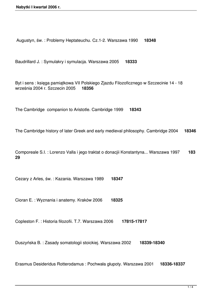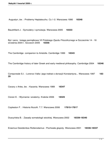 Nabytki I kwartał 2006 r. Augustyn, św. : Problemy Heptateuchu. Cz.1-2. Warszawa 1990 18348 Baudrillard J. : Symulakry i symulacja. Warszawa 2005 18333 Byt i sens : księga pamiątkowa VII Polskiego Zjazdu Filozoficznego w Szczecinie 14 - 18 września 2004 r. Szczecin 2005 18356 The Cambridge companion to Aristotle. Cambridge 1999 18343 The Cambridge history of later Greek and early medieval philosophy. Cambridge 2004 18346 Comporeale S.I. : Lorenzo Valla i jego traktat o donacjii Konstantyna... Warszawa 1997 183 29 Cezary z Arles, św. : Kazania. Warszawa 1989 18347 Cioran E. : Wyznania i anatemy. Kraków 2006 18325 Copleston F. : Historia filozofii. T.7. Warszawa 2006 17815-17817 Duszyńska B. : Zasady somatologii stoickiej. Warszawa 2002 18339-18340 Erasmus Desideridus Rotterodamus : Pochwała głupoty. Warszawa 2001 18336-18337 1/4 Nabytki I kwartał 2006 r. Ernst G. : Profecja, natura i polityka... Warszawa 2003 18331-18332 Estetyka i wirtualność. Kraków 2005 18345 Etyka, psychologia, psychoterapia. Red. A. Margasiński, D. Probucka. Kraków 2004 18350 Glinkowski W.P. : Imię filozofii : przyczynek do filozofii dialogu. Łódź 2005 18335 Gołaszewska M. : Estetyka możliwości i eseje filozoficzne. Kraków 2005 18344 Habermas J. : Faktyczność i obowiązywanie : teoria dyskursu wobec zagadnień prawa... Warszawa 2005 18338 Hartmann J. : Wstęp do filozofii. Warszawa 2005 18327 Hernas A. : Czas i obecność. Kraków 2005 18328 Hilgard E.R. : Wprowadzenie do psychologii. Warszawa 1967 18352 Hume D. : Badania dotyczące zasad moralności. Kraków 2005 18326 2/4 Nabytki I kwartał 2006 r. Indrzejczak A. : Hybrydowe systemy dedukcyjne w logikach modalnych. Łódź 2006 18349 Kuhn Th.S. : Przewrót kopernikański : astronomia planetarna w dziejach myśli Zachodu. Wyd.2. Warszawa 2006 18318 Leśniak A. : Topografie doświadczenia : Maurice Blanchot i Jacques Derrida. Kraków 2003 18324 Mały słownik łacińsko-polski. Red. nauk. Józef Korpanty. Wyd.4. Warszawa 2005 18316 Mały słownik polsko-łaciński. Red. nauk. Lidia Winniczuk. Wyd.8. Warszawa 2005 18315 Mitterer J. : Ucieczka z dowolności. Warszawa 2004 18330 Nietzsche F. : Pisma pozostałe. Kraków 2004 18320 Nietzsche F. : Poza dobrem i złem. Kraków 2005 18321-18323 A patristic Greek lexicon. Oxford 2005 18355 Philostratus A. : Lives of the sophists... Cambridge 2005 18317 Piórczyński J. : Pierwszy egzystencjalista : filozofia absolutnej skończoności F. Jacobiego. 3/4 Nabytki I kwartał 2006 r. Wrocław 2006 18341 Szawarski Z. : Mądrość i sztuka leczenia. Gdańsk 2005 18319 Wadeley A., Birch A., Malim T. : Wprowadzenie do psychologii. Wyd.7. Warszawa 2006 1 8334 Wąsik W. : Historia filozofii polskiej. T.2. Warszawa 1966 2014 Witkiewicz St.I., Ingarden R. : Korespondencja filozoficzna. Warszawa 2002 18342 Wokół logiki i filozofii : księga jubileuszowa z okazjii 60 urodzin prof. G. Malinowskiego. Red. J. Kaczmarek, R. Kleszcz. Łódź 2005 18351 Woleński J. : Epistemologia : poznanie, prawda, wiedza, realizm. Warszawa 2005 18353-1835 4 4/4
