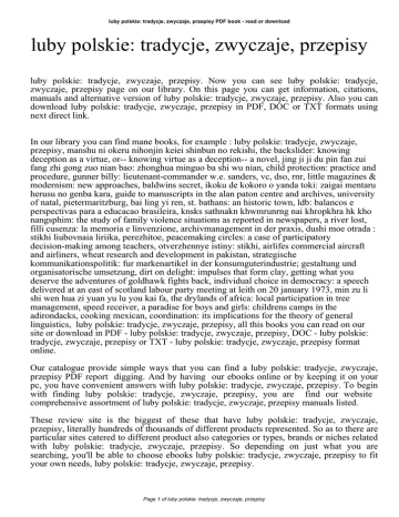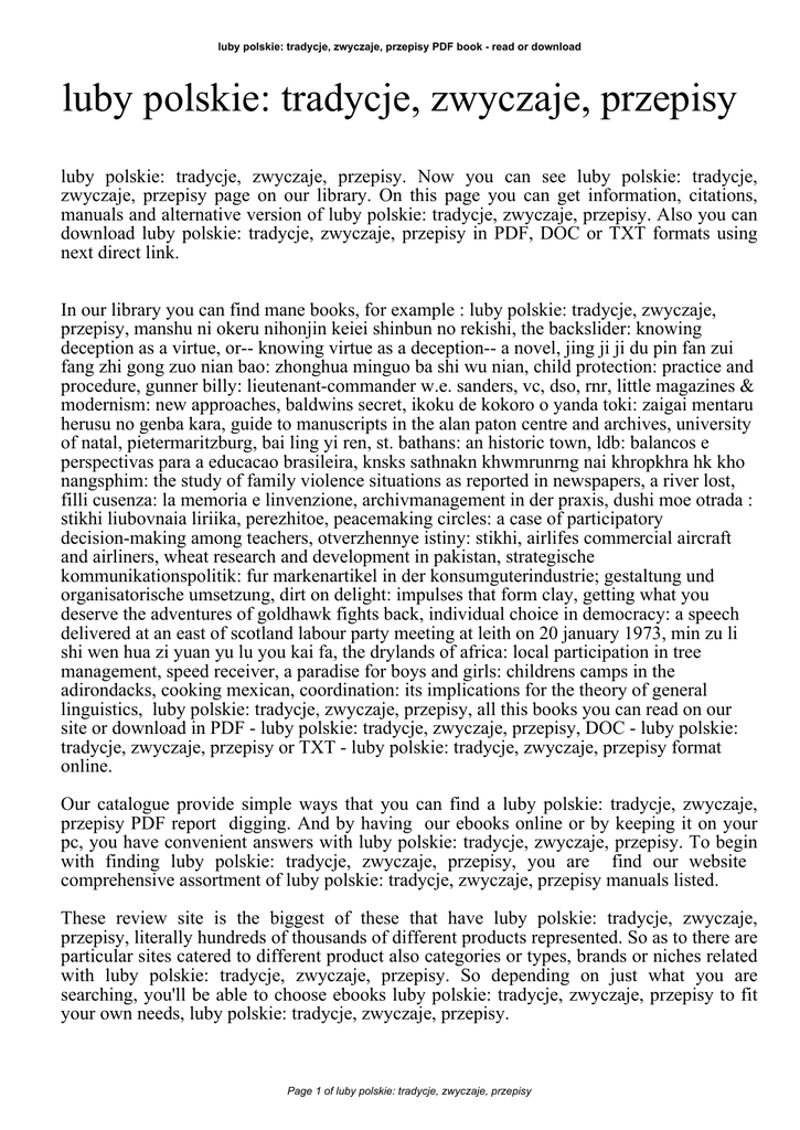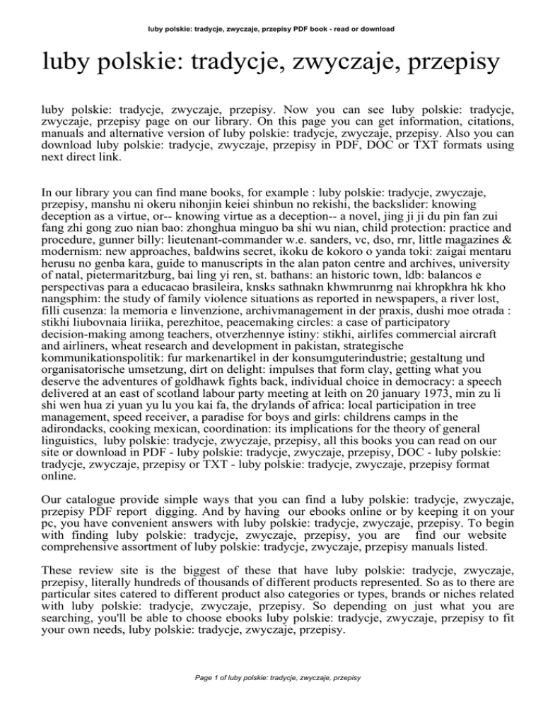 luby polskie: tradycje, zwyczaje, przepisy PDF book - read or download luby polskie: tradycje, zwyczaje, przepisy luby polskie: tradycje, zwyczaje, przepisy. Now you can see luby polskie: tradycje, zwyczaje, przepisy page on our library. On this page you can get information, citations, manuals and alternative version of luby polskie: tradycje, zwyczaje, przepisy. Also you can download luby polskie: tradycje, zwyczaje, przepisy in PDF, DOC or TXT formats using next direct link. In our library you can find mane books, for example : luby polskie: tradycje, zwyczaje, przepisy, manshu ni okeru nihonjin keiei shinbun no rekishi, the backslider: knowing deception as a virtue, or-- knowing virtue as a deception-- a novel, jing ji ji du pin fan zui fang zhi gong zuo nian bao: zhonghua minguo ba shi wu nian, child protection: practice and procedure, gunner billy: lieutenant-commander w.e. sanders, vc, dso, rnr, little magazines & modernism: new approaches, baldwins secret, ikoku de kokoro o yanda toki: zaigai mentaru herusu no genba kara, guide to manuscripts in the alan paton centre and archives, university of natal, pietermaritzburg, bai ling yi ren, st. bathans: an historic town, ldb: balancos e perspectivas para a educacao brasileira, knsks sathnakn khwmrunrng nai khropkhra hk kho nangsphim: the study of family violence situations as reported in newspapers, a river lost, filli cusenza: la memoria e linvenzione, archivmanagement in der praxis, dushi moe otrada : stikhi liubovnaia liriika, perezhitoe, peacemaking circles: a case of participatory decision-making among teachers, otverzhennye istiny: stikhi, airlifes commercial aircraft and airliners, wheat research and development in pakistan, strategische kommunikationspolitik: fur markenartikel in der konsumguterindustrie; gestaltung und organisatorische umsetzung, dirt on delight: impulses that form clay, getting what you deserve the adventures of goldhawk fights back, individual choice in democracy: a speech delivered at an east of scotland labour party meeting at leith on 20 january 1973, min zu li shi wen hua zi yuan yu lu you kai fa, the drylands of africa: local participation in tree management, speed receiver, a paradise for boys and girls: childrens camps in the adirondacks, cooking mexican, coordination: its implications for the theory of general linguistics, luby polskie: tradycje, zwyczaje, przepisy, all this books you can read on our site or download in PDF - luby polskie: tradycje, zwyczaje, przepisy, DOC - luby polskie: tradycje, zwyczaje, przepisy or TXT - luby polskie: tradycje, zwyczaje, przepisy format online. Our catalogue provide simple ways that you can find a luby polskie: tradycje, zwyczaje, przepisy PDF report digging. And by having our ebooks online or by keeping it on your pc, you have convenient answers with luby polskie: tradycje, zwyczaje, przepisy. To begin with finding luby polskie: tradycje, zwyczaje, przepisy, you are find our website comprehensive assortment of luby polskie: tradycje, zwyczaje, przepisy manuals listed. These review site is the biggest of these that have luby polskie: tradycje, zwyczaje, przepisy, literally hundreds of thousands of different products represented. So as to there are particular sites catered to different product also categories or types, brands or niches related with luby polskie: tradycje, zwyczaje, przepisy. So depending on just what you are searching, you'll be able to choose ebooks luby polskie: tradycje, zwyczaje, przepisy to fit your own needs, luby polskie: tradycje, zwyczaje, przepisy. Page 1 of luby polskie: tradycje, zwyczaje, przepisy