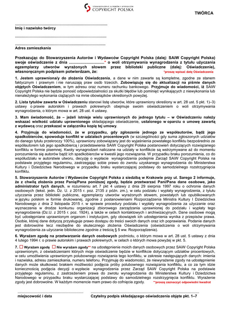 TWÓRCA .................................................................................................. Imię i nazwisko twórcy ................................................................................................. ................................................................................................ Adres zamieszkania Przekazując do Stowarzyszenia Autorów i Wydawców Copyright Polska (dalej: SAiW Copyright Polska) swoje oświadczenie z dnia ................................* o woli otrzymywania wynagrodzenia z tytułu użyczania egzemplarzy utworów wyrażonych słowem przez biblioteki publiczne (dalej: Oświadczenie), własnoręcznym podpisem potwierdzam, że: *proszę wpisać datę Oświadczenia 1. Jestem uprawniona/y do złożenia Oświadczenia, a dane w nim zawarte są kompletne, zgodne ze stanem faktycznym i prawnym i nie naruszają praw osób trzecich. Zobowiązuję się do aktualizacji na piśmie danych objętych Oświadczeniem, w tym adresu oraz numeru rachunku bankowego. Przyjmuje do wiadomości, iż SAiW Copyright Polska nie będzie ponosić odpowiedzialności za skutki błędów lub pominięć wynikających z niewykonania lub nienależytego wykonania ciążących na mnie obowiązków określonych powyżej. 2. Lista tytułów zawarta w Oświadczeniu stanowi listę utworów, które uprawniony określony w art. 28 ust. 5 pkt. 1)–3) ustawy o prawie autorskim i prawach pokrewnych obejmuje swoim oświadczeniem o woli otrzymywania wynagrodzenia, o którym mowa w art. 28 ust. 4 ustawy. 3. Mam świadomość, że – jeżeli istnieje wielu uprawnionych do jednego tytułu – w Oświadczeniu należy wskazać wielkość udziału uprawnionego składającego oświadczenie, ustalonego w oparciu o umowę zawartą z wydawcą oraz przekazać w załączniku kopię tej umowy. 4. Przyjmuję do wiadomości, że w przypadku, gdy zgłoszenie jednego ze współautorów, bądź jego spadkobierców, spowoduje konflikt w udziałach procentowych (w szczególności gdy suma zgłoszonych udziałów do danego tytułu przekroczy 100%), uprawniony zobowiązany jest do wyjaśnienia powstałego konfliktu bezpośrednio ze współautorem lub jego spadkobiercą i przedstawienia SAiW Copyright Polska postanowień dotyczących rozwiązanego konfliktu w formie pisemnej. Kwoty wynagrodzeń naliczane na udziały w konflikcie są wstrzymywane aż do momentu porozumienia się autorów bądź ich spadkobierców w kwestii jego rozwiązania. W przypadku braku porozumienia, co do współudziału w autorstwie utworu, decyzję o wypłacie wynagrodzenia podejmie Zarząd SAiW Copyright Polska na podstawie przyjętego regulaminu, zastrzegając sobie prawo do zwrotu uzyskanego wynagrodzenia do Ministerstwa Kultury i Dziedzictwa Narodowego w przypadku braku wystarczającej podstawy do samodzielnego rozstrzygnięcia konfliktu. 5. Stowarzyszenie Autorów i Wydawców Copyright Polska z siedzibą w Krakowie przy ul. Sarego 2 informuje, że z chwilą złożenia przez Panią/Pana poniższej zgody, będzie przetwarzać Pani/Pana dane osobowe, jako administrator tych danych, w rozumieniu art. 7 pkt 4 ustawy z dnia 29 sierpnia 1997 roku o ochronie danych osobowych (tekst. jedn. Dz. U. z 2015 r. poz. 2135 z późn. zm.), w celu podziału i wypłaty wynagrodzenia, z tytułu użyczania przez biblioteki publiczne, egzemplarzy utworów wyrażonych słowem, powstałych lub opublikowanych w języku polskim w formie drukowanej, zgodnie z postanowieniami Rozporządzenia Ministra Kultury I Dziedzictwa Narodowego z dnia 2 listopada 2015 r. w sprawie procedury podziału i wypłaty wynagrodzenia za użyczanie oraz wyznaczenia w drodze konkursu organizacji zbiorowego zarządzania uprawnionej do podziału i wypłaty tego wynagrodzenia (Dz.U. z 2015 r. poz. 1924), a także w celach kontaktowych i archiwizacyjnych. Dane osobowe mogą być udostępniane uprawnionym organom i instytucjom, gdy obowiązek ich udostępnienia wynika z przepisów prawa. Osobie, której dane dotyczą przysługuje prawo dostępu do treści swoich danych oraz ich poprawiania. Podanie danych jest dobrowolne lecz niezbędne do skutecznego złożenia Oświadczenia (oświadczenia o woli otrzymywania wynagrodzenia za użyczanie biblioteczne zgodnie z treścią § 5 ww. Rozporządzenia). 6. Wyrażam zgodę na przetwarzanie danych osobowych podmiotu, o którym mowa w art. 28 ust. 5 ustawy z dnia 4 lutego 1994 r. o prawie autorskim i prawach pokrewnych, w celach o których mowa powyżej w pkt. 5. 7. Wyrażam zgodę Nie wyrażam zgody** na udostępnienie moich danych osobowych przez SAiW Copyright Polska uprawnionym, z oświadczeniami których moje oświadczenie będzie w konflikcie dotyczącym udziałów procentowych, w celu umożliwienia uprawnionym polubownego rozwiązania tego konfliktu, w zakresie następujących danych: imienia i nazwiska, adresu zamieszkania, numeru telefonu. Przyjmuję do wiadomości, że niewyrażenie zgody na udostępnienie danych może skutkować brakiem możliwości podjęcia próby polubownego rozwiązania konfliktu, a co za tym idzie koniecznością podjęcia decyzji o wypłacie wynagrodzenia przez Zarząd SAiW Copyright Polska na podstawie przyjętego regulaminu, z zastrzeżeniem prawa do zwrotu wynagrodzenia do Ministerstwa Kultury i Dziedzictwa Narodowego w przypadku braku wystarczającej podstawy do samodzielnego rozstrzygnięcia konfliktu. Wyrażenie zgody jest dobrowolne. W każdym momencie mam prawo do cofnięcia zgody. **proszę zaznaczyć odpowiedni kwadrat ......................................................... .............................................................................................. miejscowość i data Czytelny podpis składającego oświadczenia objęte pkt. 1–7