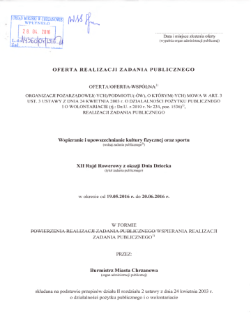 mmmmmm lUM k . W P Ł Y N Ę Ł O __ 2 8. 04, 2016 I j l ( I ^ i Data i miejsce złożenia oferty (wypełnia organ administracji publicznej) OFERTA R EALIZAC JI ZADANIA PU BLIC ZN EG O OFERTA/OFERTA W SPÓLNA1} ORGANIZACJI POZ ARZĄDO WEJ(-YCH)/PODMIOTU(-ÓW), O KTÓRYM(-YCH) MOWA W ART. 3 UST. 3 USTAWY Z DNIA 24 KWIETNIA 2003 r. O DZIAŁALNOŚCI POŻYTKU PUBLICZNEGO I O WOLONTARIACIE (tj.: Dz.U. z 2010 r. N r 234, poz. 1536)!), REALIZACJI ZADANIA PUBLICZNEGO W spieranie i upowszechnianie kultury fizycznej oraz sportu (rodzaj zadania publicznego21) X II Rajd Rowerow y z okazji Dnia Dziecka (tytuł zadania publicznego) w okresie od 19.05.2016 r. do 20.06.2016 r. W FORMIE POWIERZENIA REALIZACJI ZADANIA PUBLICZNEGO/WSPIERANIA REALIZACJI ZADANIA PUBLICZNEGO1) PRZEZ: Burm istrz M iasta Chrzanowa (organ administracji publicznej) składana na podstawie przepisów działu II rozdziału 2 ustawy z dnia 24 kwietnia 2003 r. o działalności pożytku publicznego i o wolontariacie I. Dane oferenta/ofe rentów 1* 3) 1) nazwa: Stowarzyszenie Chrzanowskich Cyklistów 2) forma prawna:4) (x) stowarzyszenie ( ) fundacja ( ) kościelna osoba prawna ( ) kościelna jednostka organizacyjna ( ) spółdzielnia socjalna ( ) in n a .................................................. 3) numer w Krajowym Rejestrze Sądowym, w innym rejestrze lub ewidencji:5' KRS nr 0000459827 4) data wpisu, rejestracji lub utworzenia:6' 23.04.2013 r. 5) nr NIP: 628-22-59-863 nr REGON: 122845585 6) adres: miejscowość: Chrzanów ul.: Kadłubek 24 dzielnica lub inna jednostka pomocnicza:7’ — gmina: Chrzanów powiat:8) chrzanowski w ojew ództw o: małopolskie kod pocztowy: 32-500 poczta: Chrzanów 7) tel.: 604-485-666 faks: — e-mail: [email protected] http:// — 8) numer rachunku bankowego: 43 2030 0045 1110 0000 0419 7200 nazwa banku: Bank BGŻ BNP Paribas 9) nazwiska i imiona osób upoważnionych do reprezentowania oferenta/oferentów1': a) Piotr Mankiewicz - Prezes Zarządu b) Leszek Fidelus - Wiceprezes c) Zbigniew Grabowski - Wiceprezes 10) nazwa, adres i telefon kontaktowy jednostki organizacyjnej bezpośrednio wykonującej zadanie, o którym mowa w ofercie:9' Stowarzyszenie Chrzanowskich Cyklistów, ul. Kadłubek 24,32-500 Chrzanów, kom.: 604-485-666 11) osoba upoważniona do składania wyjaśnień dotyczących oferty (imię i nazwisko oraz nr telefonu kontaktowego): Ewa Dzierwa kom.: 502-468-365 12) przedmiot działalności pożytku publicznego: a) działalność nieodpłatna pożytku publicznego b) działalność odpłatna pożytku publicznego 13) jeżeli oferent/oferenci1'prowadzi/prowadzą11 działalność gospodarczą: a) numer wpisu do rejestru przedsiębiorców ............................................ b) przedmiot działalności gospodarczej Nie dotyczy II. Informacje o sposobie reprezentacji oferentów wobec organu administracji publicznej wraz z przytoczeniem podstawy prawnej.10) Nie dotyczy III. Szczegółowy zakres rzeczowy zadania publicznego proponowanego do realizacji 1. Krótka charakterystyka zadania publicznego. Organizacja XII Rajdu Rowerowego z okazji Dnia Dziecka dla mieszkańców Gminy Chrzanów, ze szczególnym uwzględnieniem dzieci w wieku szkolnym. Uczestnicy przejadą trasą o długości 19 km, prowadzącą przez tereny Gmin: Chrzanów i Libiąż. Po zakończeniu przejazdu uczestnicy wezmą udział w konkursach rekreacyjno-sportowych. 2. Opis potrzeb wskazujących na konieczność wykonania zadania publicznego, opis ich przyczyn oraz skutków. • Zapewnienie aktywnego wypoczynku dla dzieci • • • Rozwój rekreacji Promowanie roweru jako środka transportu Integracja społeczna • Promowanie sportów rowerowych stanowiących przykład rodzinnej formy aktywności fizycznej 3. Opis grup adresatów zadania publicznego. Dzieci, młodzież i dorośli 4. Uzasadnienie potrzeby dofinansowania z dotacji inwestycji związanych z realizacją zadania publicznego, w szczególności ze wskazaniem, w jaki sposób przyczyni się to do podwyższenia standardu realizacji zadania."1 Nie dotyczy 5. Informacja, czy w ciągu ostatnich 5 lat oferent/oferenci otrzymał/otrzymali dotację na dofinansowanie inwestycji związanych z realizacją zadania publicznego z podaniem inwestycji, które zostały dofinansowane, organu, który udzielił dofinansowania oraz daty otrzymania dotacji.111 Nie dotyczy 6. Zakładane cele realizacji zadania publicznego oraz sposób ich realizacji. • Promowanie aktywnego sposobu spędzania wolnego czasu • Promowanie walorów krajobrazowych Gminy Chrzanów i gmin ościennych • Rozwijanie turystyki rowerowej • Integracja lokalnej społeczności • Promowanie bezpiecznego sposobu uprawiania turystyki rowerowej 7. Miejsce realizacji zadania publicznego. Gmina Chrzanów, Gmina Libiąż. 8. Opis poszczególnych działań w zakresie realizacji zadania publicznego.12' Działanie 1. Zarządzanie i organizacja rajdu: • zgłoszenie do odpowiednich służb, • zakupy niezbędnych materiałów, • rozpowszechnienie informacji o rajdzie, • przyjmowanie zgłoszeń uczestników, • przygotowanie miejsca startu i mety oraz trasy. Działanie 2. Organizacja XII Rajdu Rowerowego z okazji Dnia Dziecka: • przeprowadzenie rajdu połączonego z przeprowadzeniem konkursów rekreacyjno-sportowych. 9. Harmonogram.131 Zadanie publiczne realizowane w okresie od 19.05.2016 r. do 20.06.2016 r. Poszczególne działania w zakresie realizowanego zadania publicznego14’ Działanie 1: Terminy realizacji poszczególnych działań Oferent lub inny podmiot odpowiedzialny za działanie w zakresie realizowanego zadania publicznego maj - czerw iec Z arządzanie i organizacja rajdu Działanie 2: czerw iec O rganizacja X II R ajdu Stowarzyszenie Chrzanowskich Cyklistów R ow erow ego z okazji D nia D ziecka 10. Zakładane rezultaty realizacji zadania publicznego.151 • Wypromowanie aktywnego sposobu spędzenia wolnego czasu • Wypromowanie walorów krajobrazowych Gminy Chrzanów i gmin ościennych • Ro