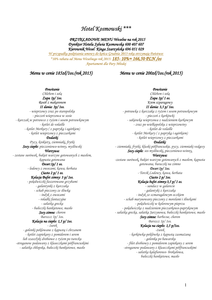 Hotel Kosmowski *** PRZYKŁADOWE MENU Weselne na rok 2015 Dyrektor Hotelu Sylwia Kosmowska 600 407 607 Kierownik Wesel Kinga Szarzyńska 696 051 029 W przypadku podpisania umowy do końca Grudnia 2013 roku otrzymają Państwo: *10% rabatu od Menu Weselnego rok 2015: 185- 10%= 166,50 PLN /os Apartament dla Pary Młodej Menu w cenie 185zł/1os.(rok 2015) Powitanie Chlebem i solą Zupa 1p/ 1os. Rosół z makaronem II dania: 3p/ 1os. - wieprzowy zraz po staropolsku - pieczeń wieprzowa w sosie - kurczak w potrawce z ryżem i sosem potrawkowym - kotlet de volaille - kotlet Merkury ( z papryką i ogórkiem) - kotlet wieprzowy z pieczarkami Dodatki Pyzy, krokiety, ziemniaki, frytki Sosy ciepłe: pieczeniowo-winny, myśliwski Warzywa: - zestaw surówek, bukiet warzyw gotowanych z masłem, kapusta gotowana Deser:1p/ 1 os. - lodowy z owocami, kawa, herbata Ciasto 2 p/ 1 os. Kolacja Bufet zimny: 3 p/ 1os. - polędwiczki faszerowane grzybami - galantynki z kurczaka - schab pieczony ze śliwką - indyk z owocami - roladki fantazyjne - sałatka grecka - bułeczki bankietowe, masło Sosy zimne: choron Barszcz 1p/ 1os. Kolacja na ciepło: 1,5 p/ 1os. - żurek - golonki peklowane z kapustą i chrzanem - kotlet zapiekany z pomidorem i serem lub szaszłyki drobiowe z ryżem po turecku -stroganow podawany z kluseczkami półfrancuskimi - sałatka chłopska, bułeczki bankietowe, masło Menu w cenie 200zł/1os.(rok 2015) Powitanie Chlebem i solą Zupa 1p/ 1 os. Krem szparagowy II dania: 3,5 p/ 1os. - potrawka z kurczaka z ryżem i sosem potrawkowym - pieczeń z karkówki - sakiewka wieprzowa z nadzieniem kurkowym - zraz po wielkopolsku z wieprzowiny - kotlet de volaille - kotlet Merkury ( z papryką i ogórkiem) - kotlet wieprzowy z pieczarkami Dodatki: - ziemniaki, frytki, kluski półfrancuskie, pyzy, ziemniaki vedgesy Sosy ciepłe: sos myśliwski, pieczeniowo-winny, Warzywa: -zestaw surówek, bukiet warzyw gotowanych z masłem, kapusta gotowana, buraczki na zimno Deser:1p/ 1os. - Torcik Lodowy, kawa, herbata Ciasto 2 p/ 1os. Kolacja bufet zimny:3,5 p/ 1 os. - sandacz w galarecie - galantyki z kurczaka - indyk ze szmaragdowym oczkiem - schab marynowany pieczony z morelami i śliwkami - polędwiczki w kolorowym pieprzu - polędwiczka z nadzieniem pieczarkowo-paprykowym - sałatka grecka, sałatka Jarzynowa, bułeczki bankietowe, masło Sosy zimne: barbecue, choron Barszcz 1p/ 1os. Kolacja na ciepło: 1,5 p/1os. -żurek - karkówka-peklówka z kapustą zasmażaną - golonka po bawarsku - filet drobiowy z pomidorem zapiekany z serem -stroganow podawany z kluseczkami półfrancuskimi - sałatka kalafiorowo- brokułowa, bułeczki bankietowe, masło 1 POLECAMY SPECJALNOŚĆ SZEFA KUCHNI! PAKIETY DEKORACYJNE 20zł/ 1 os. Wędzona Szynka Podkomorzego, pieczona w winie serwowana na Sali na ciepło Dodatki: ziemniaki pieczone, chrzan 17zł/ 1os. Prosie Pieczone z nadzieniem Dodatki: sałatka, musztarda, chrzan Pakiet Standard: 0 zł/osobę 1) stoliki prostokątne 2) krzesła z pokrowcami 3) stół kawowy 4) Obsługa kelnerska 1 kelner/ 25 osób 17zł/ 1os. Zagroda Wiejska zastawiona wyrobami wiejskimi Pakiet Premium 15 zł/osobę 10zł/ 1 os. Zagroda Wiejska z Własnymi wyrobami W cenie: Warzywa, Dekoracja, 2 but. Siwuchy, chleb, smalec, ogórki 1) krzesła z pokrowcami 2) menu 20 szt. 3) wizytówki 1 szt./osobę 4) zawieszki na alkohol -20 szt. 5) stół kawowy 6) Obsługa w białych rękawiczkach:1 kelner/ 25 osób 20 zł/ 1os. Łosoś faszerowany brokułami Grill: Pierś z kurczaka 10zł Szaszłyk 14zł Karkówka 14zł Kiełbasa 8zł Kaszanka 6zł Dodatki w cenie: sałatka (pomidor, ogórek, cebula), pieczywo, sosy Pakiet Lux: 20zł/osobę 1) stoliki okrągłe 12 osobowe 2) krzesła z pokrowcami 3) menu 20 szt 4) wizytówki 1 szt/osobę 5) zawieszki na alkohol -20 szt. 6) stół kawowy 7) Obsługa w białych rękawiczkach: 1 kelner/ 20 osób Grill z własnego mięsa: Pierś z kurczaka 5 zł Szaszłyk 7zł Karkówka 7 zł Kiełbasa 4zł Kaszanka 3zł Specjalna Cena 15 zł/os. Fontanna czekolady z dodatkami 2
