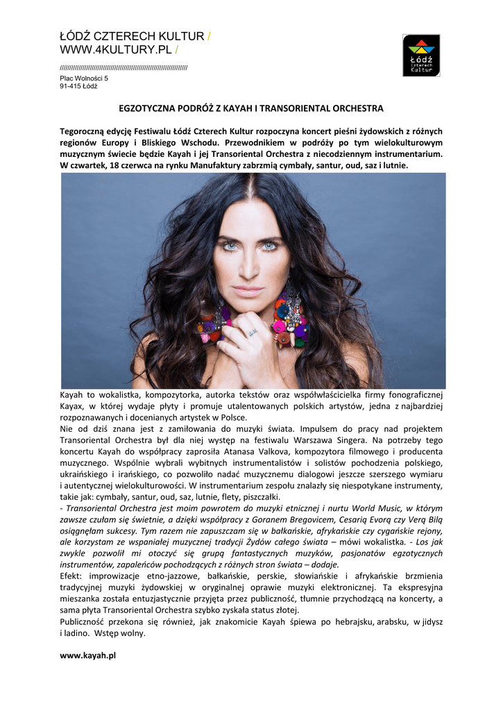 ŁÓDŹ CZTERECH KULTUR / WWW.4KULTURY.PL / //////////////////////////////////////////////////////////////////// Plac Wolności 5 91-415 Łódź EGZOTYCZNA PODRÓŻ Z KAYAH I TRANSORIENTAL ORCHESTRA Tegoroczną edycję Festiwalu Łódź Czterech Kultur rozpoczyna koncert pieśni żydowskich z różnych regionów Europy i Bliskiego Wschodu. Przewodnikiem w podróży po tym wielokulturowym muzycznym świecie będzie Kayah i jej Transoriental Orchestra z niecodziennym instrumentarium. W czwartek, 18 czerwca na rynku Manufaktury zabrzmią cymbały, santur, oud, saz i lutnie. Kayah to wokalistka, kompozytorka, autorka tekstów oraz współwłaścicielka firmy fonograficznej Kayax, w której wydaje płyty i promuje utalentowanych polskich artystów, jedna z najbardziej rozpoznawanych i docenianych artystek w Polsce. Nie od dziś znana jest z zamiłowania do muzyki świata. Impulsem do pracy nad projektem Transoriental Orchestra był dla niej występ na festiwalu Warszawa Singera. Na potrzeby tego koncertu Kayah do współpracy zaprosiła Atanasa Valkova, kompozytora filmowego i producenta muzycznego. Wspólnie wybrali wybitnych instrumentalistów i solistów pochodzenia polskiego, ukraińskiego i irańskiego, co pozwoliło nadać muzycznemu dialogowi jeszcze szerszego wymiaru i autentycznej wielokulturowości. W instrumentarium zespołu znalazły się niespotykane instrumenty, takie jak: cymbały, santur, oud, saz, lutnie, flety, piszczałki. - Transoriental Orchestra jest moim powrotem do muzyki etnicznej i nurtu World Music, w którym zawsze czułam się świetnie, a dzięki współpracy z Goranem Bregovicem, Cesarią Evorą czy Verą Bilą osiągnęłam sukcesy. Tym razem nie zapuszczam się w bałkańskie, afrykańskie czy cygańskie rejony, ale korzystam ze wspaniałej muzycznej tradycji Żydów całego świata – mówi wokalistka. - Los jak zwykle pozwolił mi otoczyć się grupą fantastycznych muzyków, pasjonatów egzotycznych instrumentów, zapaleńców pochodzących z różnych stron świata – dodaje. Efekt: improwizacje etno‐jazzowe, bałkańskie, perskie, słowiańskie i afrykańskie brzmienia tradycyjnej muzyki żydowskiej w oryginalnej oprawie muzyki elektronicznej. Ta ekspresyjna mieszanka została entuzjastycznie przyjęta przez publiczność, tłumnie przychodzącą na koncerty, a sama płyta Transoriental Orchestra szybko zyskała status złotej. Publiczność przekona się również, jak znakomicie Kayah śpiewa po hebrajsku, arabsku, w jidysz i ladino. Wstęp wolny. www.kayah.pl